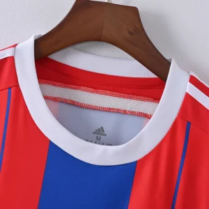 The FC Bayern Munich 2014/15 Home Jersey by Adidas is a striking tribute to the club’s historic colors and winning legacy, featuring a bold design that recalls the club’s red, blue, and white crest palette. This jersey showcases vertical red and blue stripes on the front panel with subtle blue pinstripes within the stripes, while the sleeves and back are predominantly red, creating a dynamic and classic look reminiscent of Bayern’s 1995-96 UEFA Cup-winning kit.