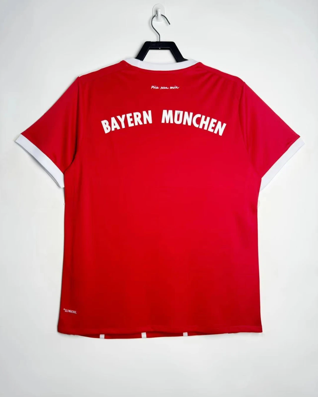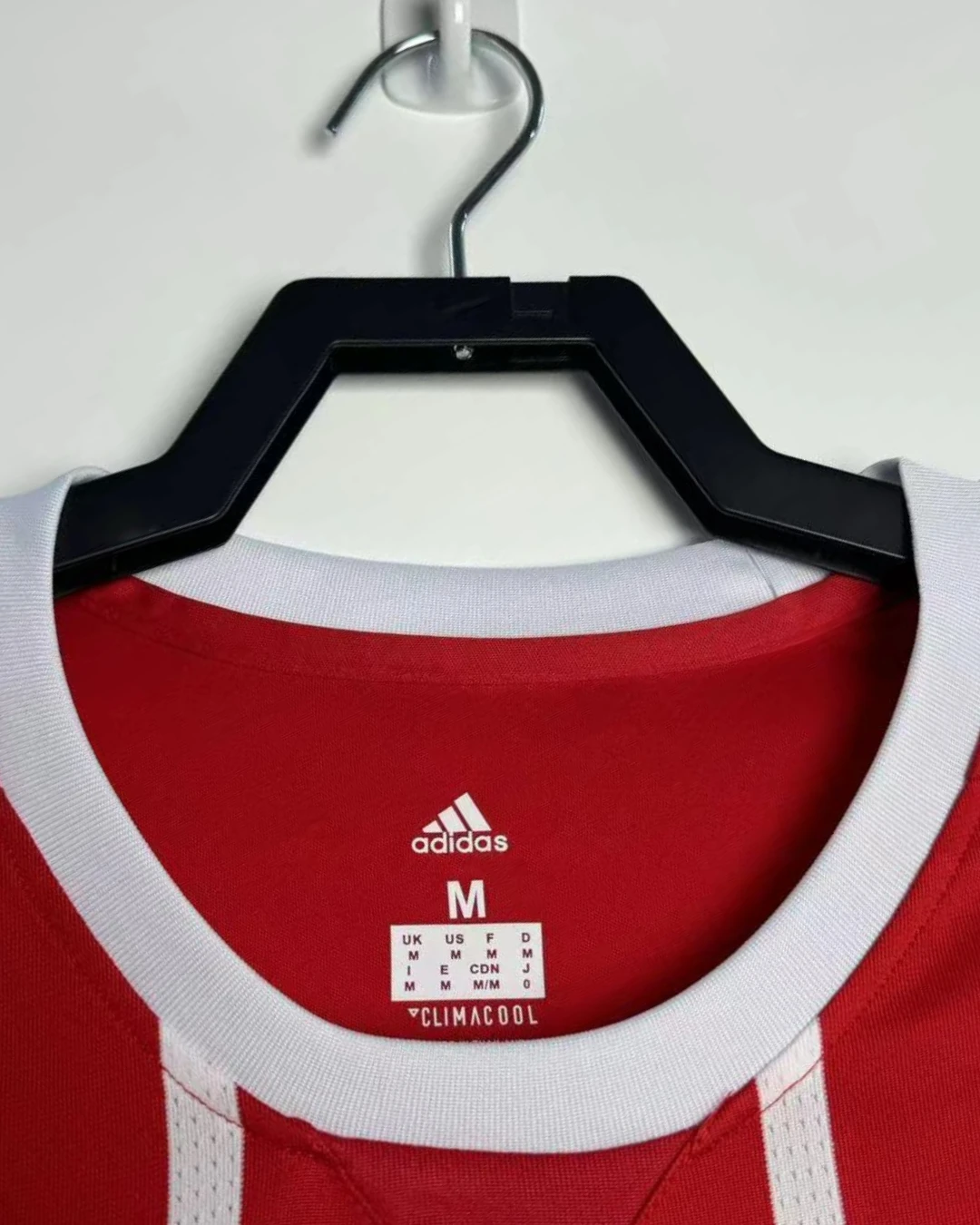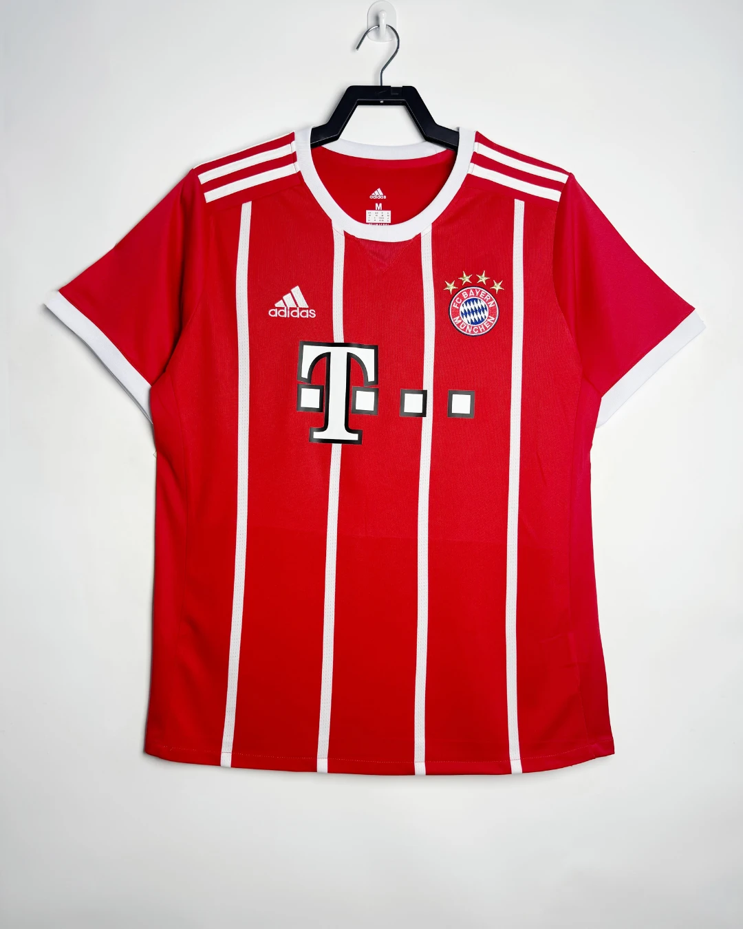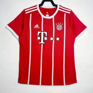 FC Bayern Munich’s 2017/18 Home Jersey from Adidas paid homage to the club’s iconic 1970s designs, powering Jupp Heynckes’ squad to their sixth consecutive Bundesliga title, DFL-Supercup victory, and a Champions League semi-final run at the Allianz Arena. The classic red base features four thick vertical white stripes across the chest, inspired by the legendary 1974 kit, paired with a white crew neck collar, white sleeve cuffs, black-outlined “TELEKOM” sponsor for legibility, traditional embroidered Bayern crest on left chest, and Adidas logo opposite.
