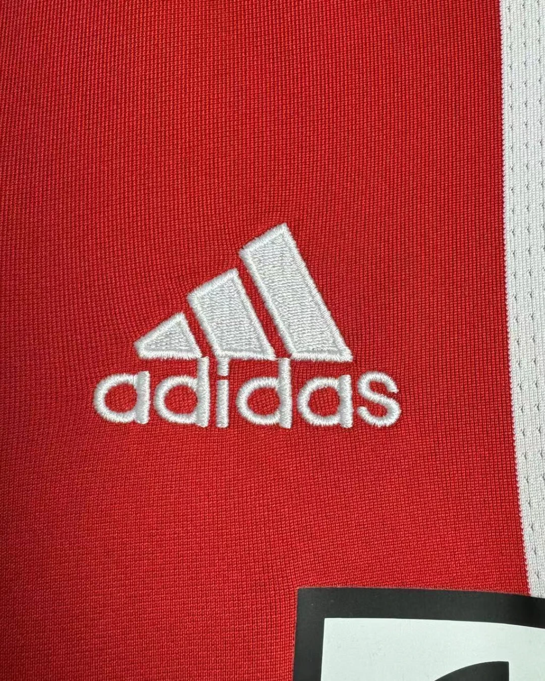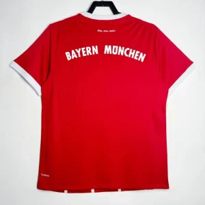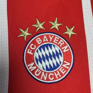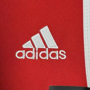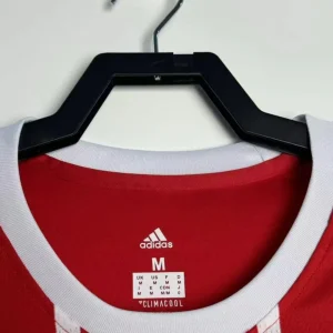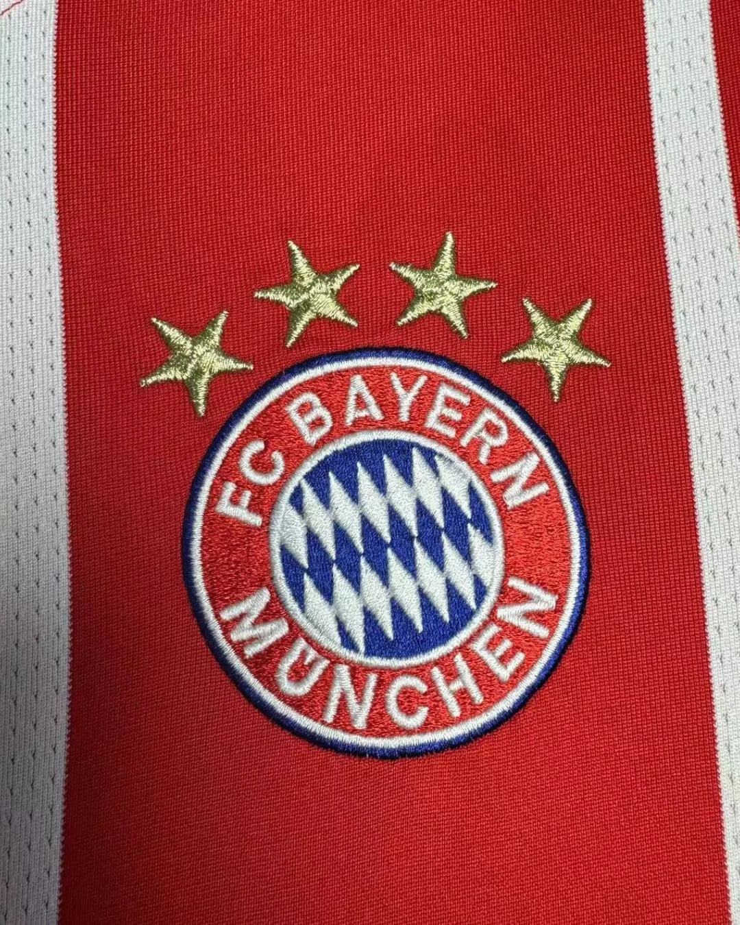 FC Bayern Munich’s 2017/18 Home Jersey from Adidas paid homage to the club’s iconic 1970s designs, powering Jupp Heynckes’ squad to their sixth consecutive Bundesliga title, DFL-Supercup victory, and a Champions League semi-final run at the Allianz Arena. The classic red base features four thick vertical white stripes across the chest, inspired by the legendary 1974 kit, paired with a white crew neck collar, white sleeve cuffs, black-outlined “TELEKOM” sponsor for legibility, traditional embroidered Bayern crest on left chest, and Adidas logo opposite.