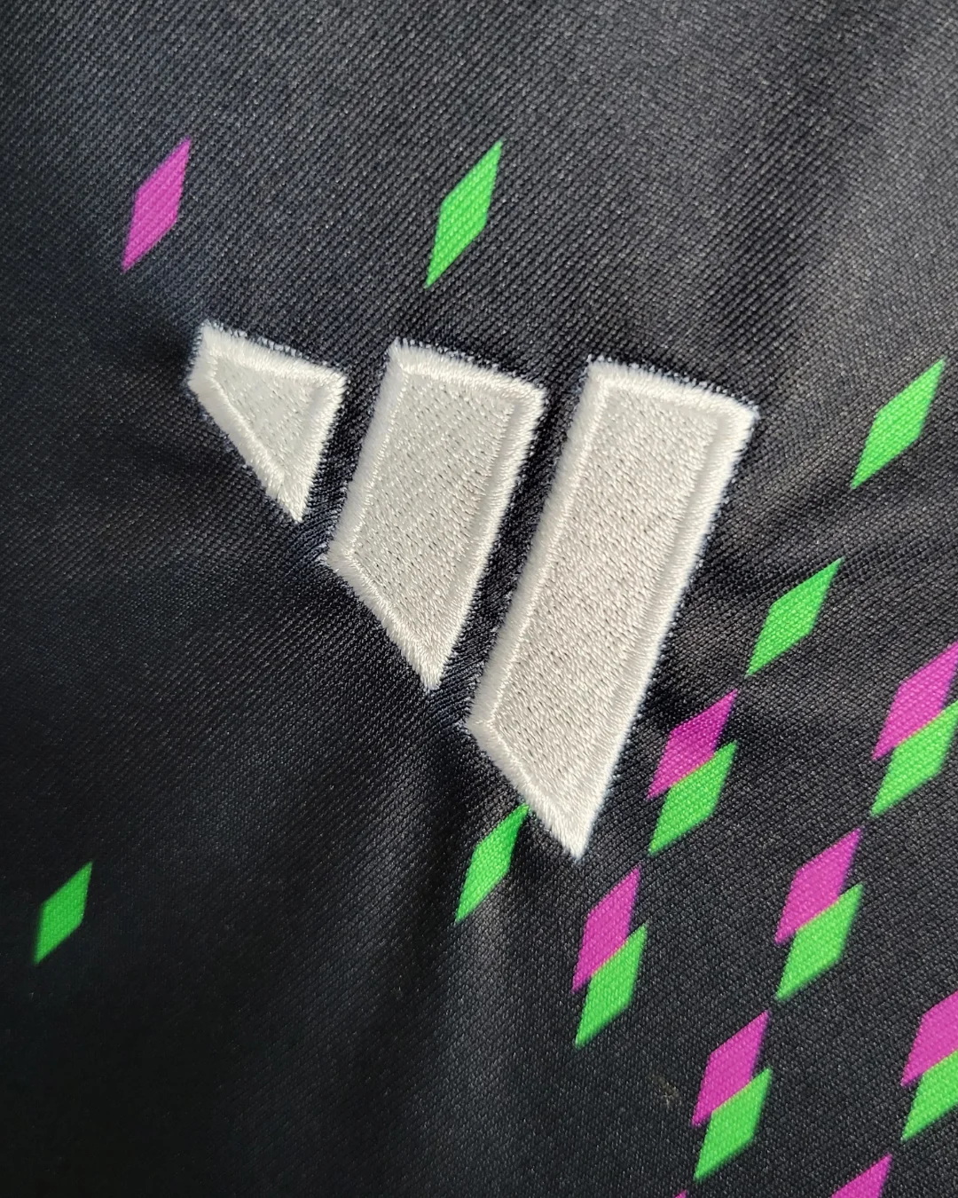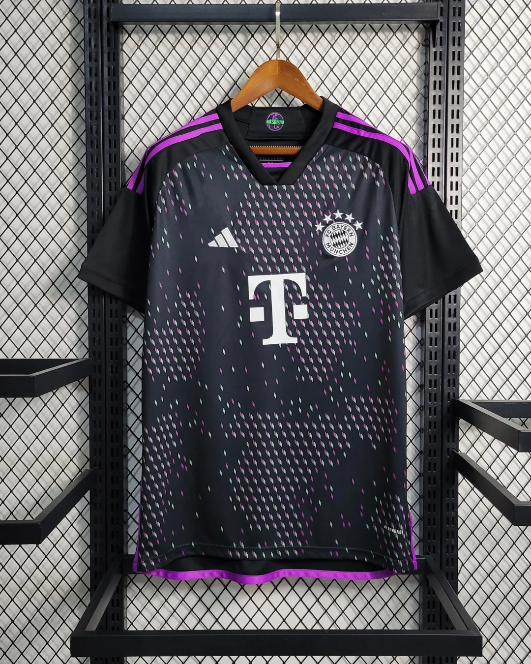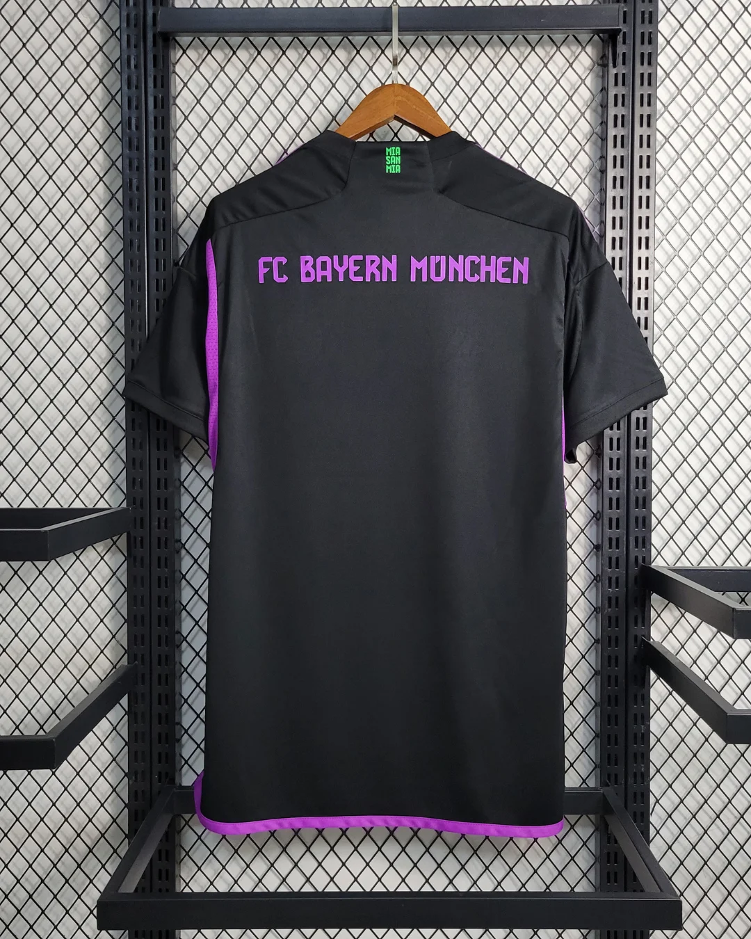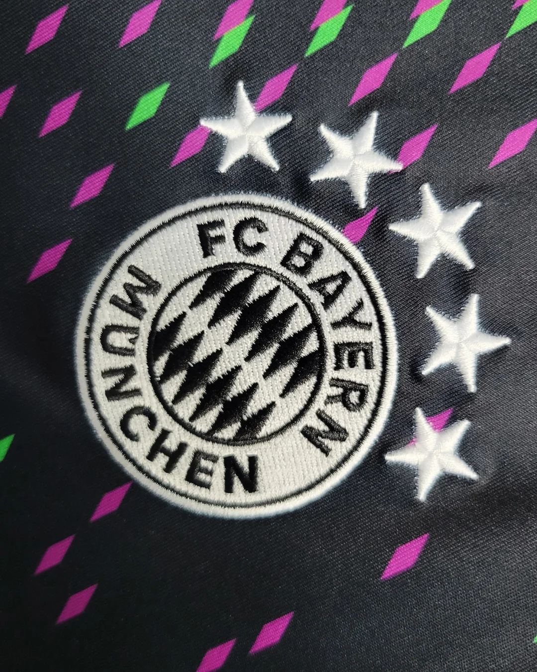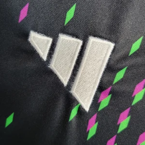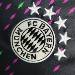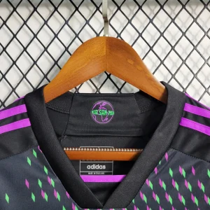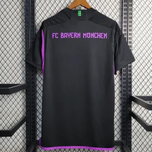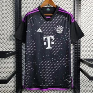FC Bayern’s 23/24 Away Stadium Jersey celebrates the global “Mia san Mia” fanbase with a striking black base featuring a world map-inspired graphic accented by purple and green diamonds representing fan clubs worldwide. The Adidas design includes “Mia san Mia” lettering on the back neck, peach-soft recycled polyester fabric with AEROREADY moisture-wicking technology, mesh side inserts for ventilation, ribbed V-neck collar, drop tail hem, and relaxed stadium fit perfect for supporters.