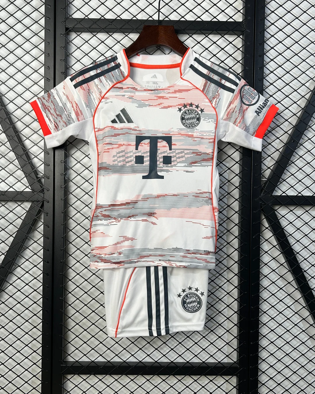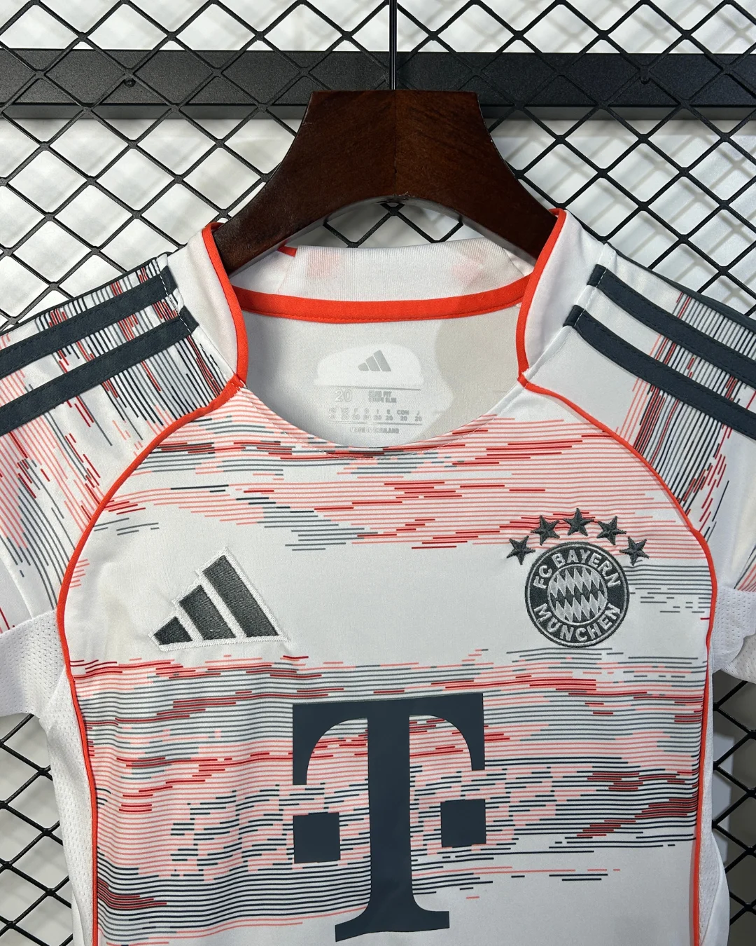 The FC Bayern Kids 25/26 Away Kit is the perfect kit for young fans to show their support for the legendary German club with style and comfort. This official adidas jersey features a fresh, modern design with a clean white base with a unique camouflage-inspired pattern in varying shades of grey and bright coral.