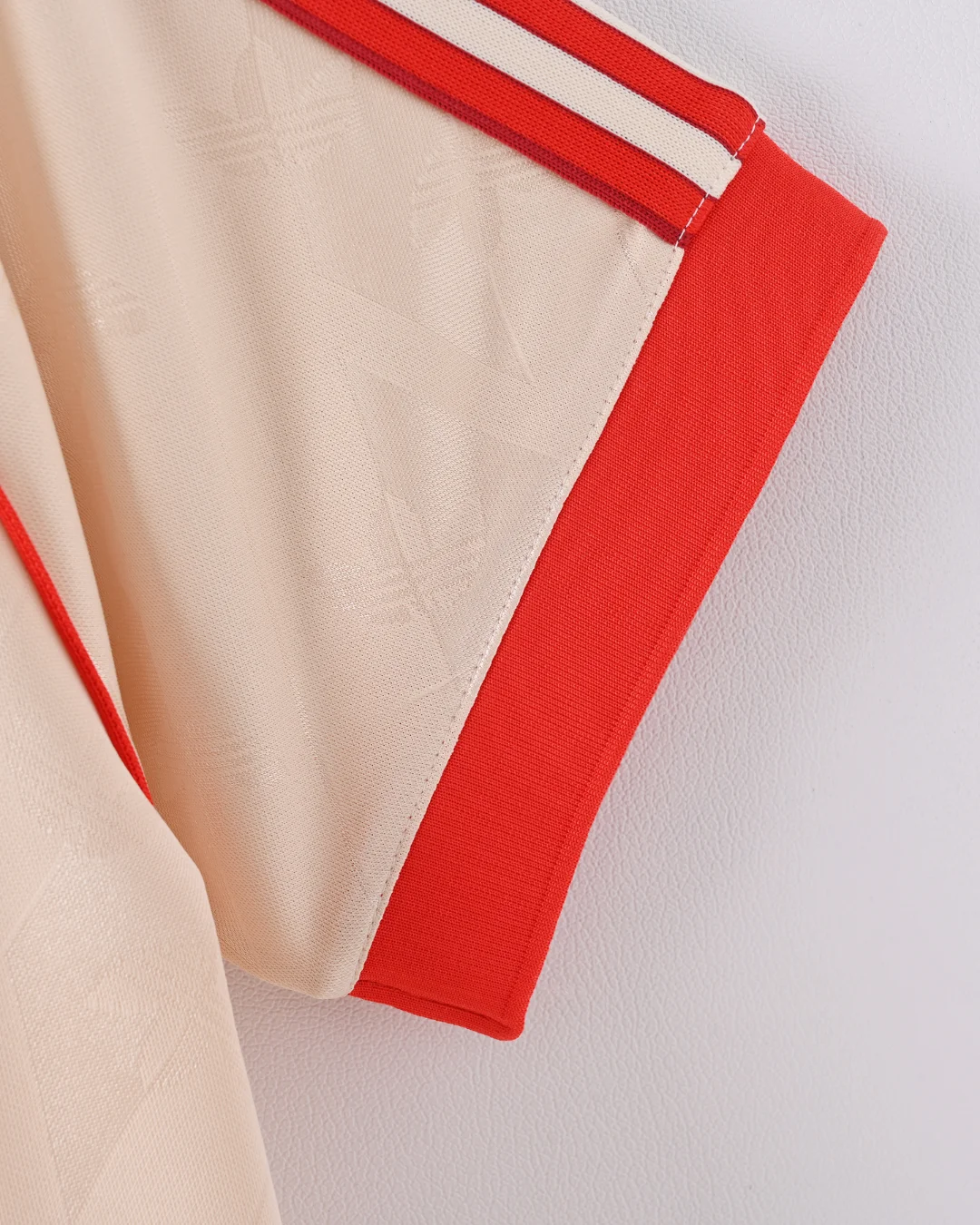 Elegant linen base with bold red collar, trim, and Adidas Trefoil branding