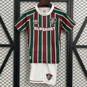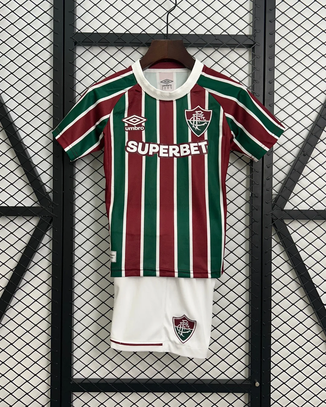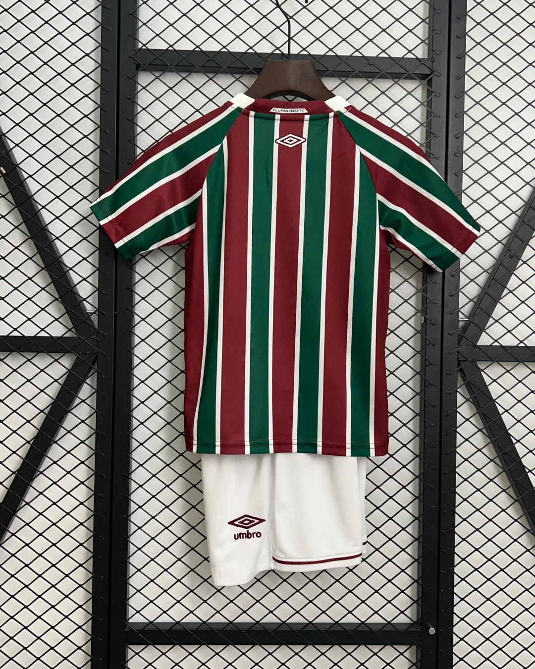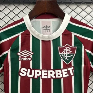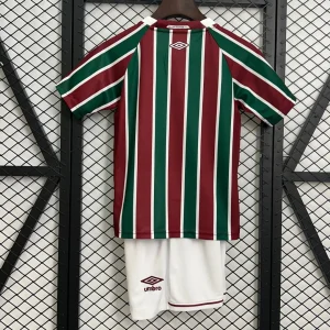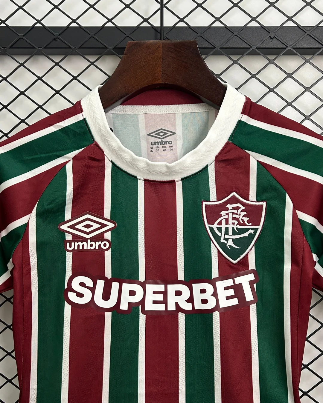 The Umbro Fluminense FC Kids 2025 Home Kit preserves the club’s iconic vertical stripes in traditional claret, green, and white across the body and sleeves, celebrating heritage for young Tricolor fans. This home jersey includes a special front hem label “From Laranjeiras to the world,” honoring Fluminense’s historic Rio neighborhood and 2025 Club World Cup participation, paired with white shorts.