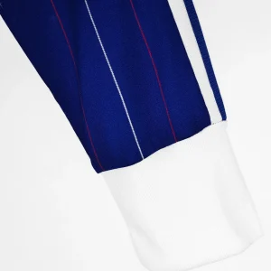 France’s classic 1980 Home Jersey – Long Sleeve from Adidas marked the golden era under coach Michel Hidalgo, featuring a deep blue base with elegant pinstripe detailing and distinctive plunging white inset V-neck collar creating the iconic 70s aesthetic, non-contrasting collar adorned with matching pinstripes, worn during their successful 1982 World Cup qualification campaign. Perfect for vintage collectors and young Les Bleus fans, this retro replica captures Adidas’s golden age design with lightweight acrylic construction replicating the era’s breathable feel, long sleeve, embroidered Gallic rooster FFF crest positioned low on left chest, dainty trefoil Adidas logo on right chest, tricolore three-stripe trim on shoulders.