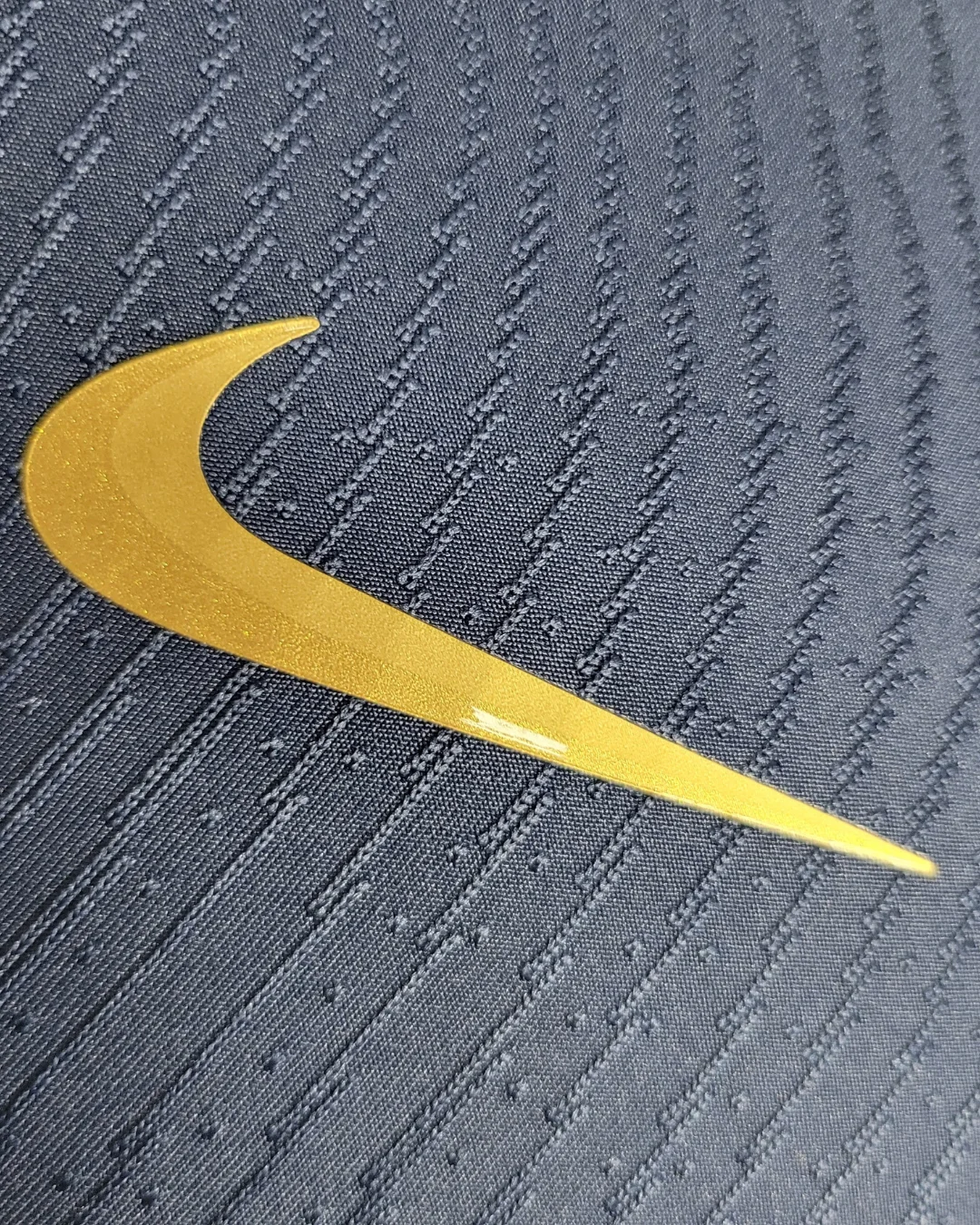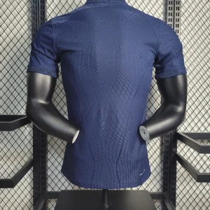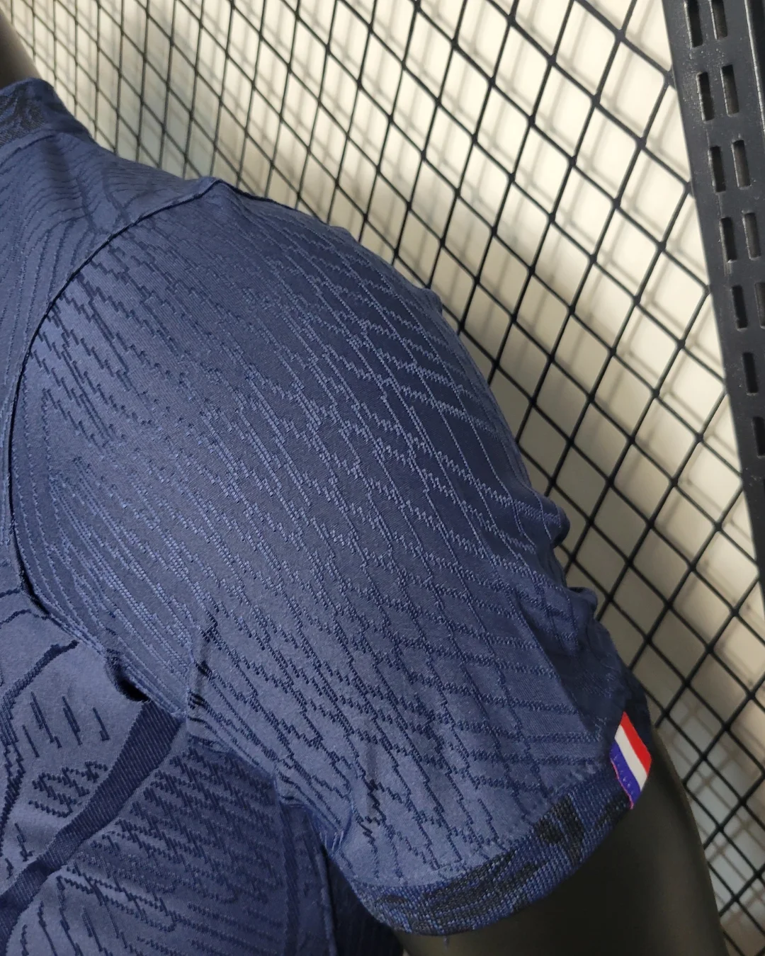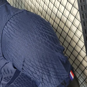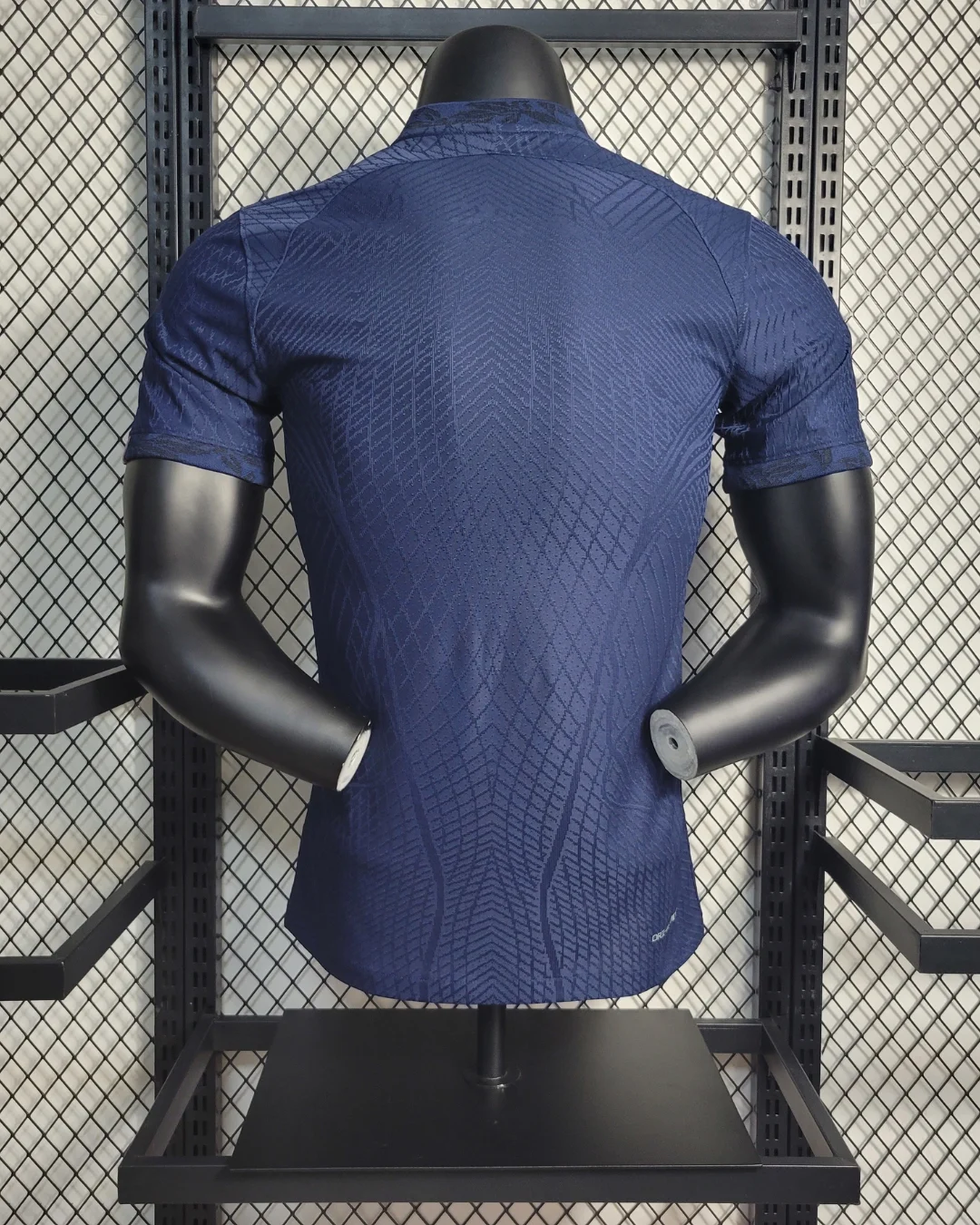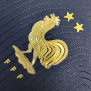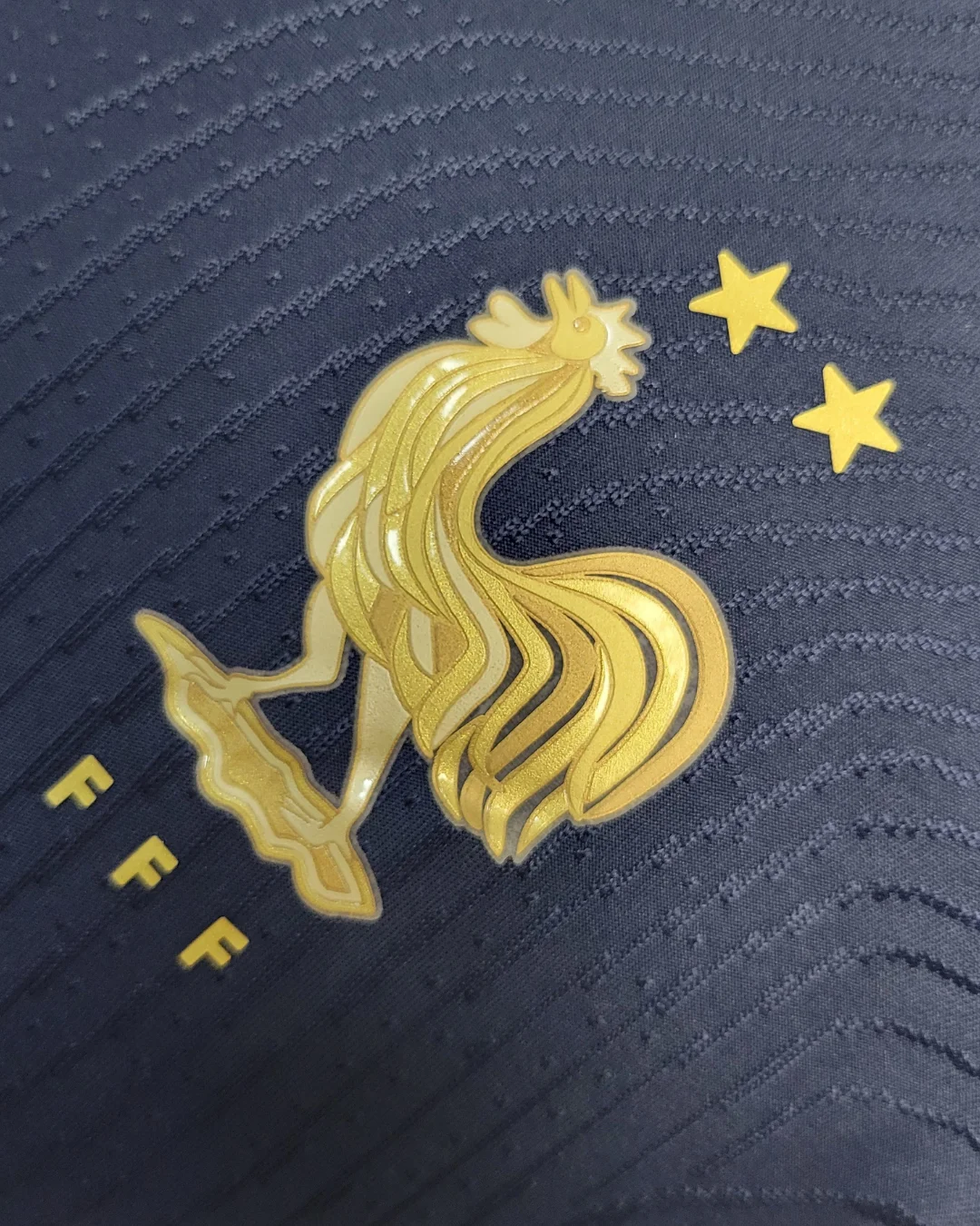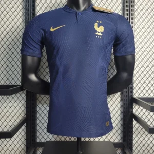 France’s 2022 FIFA World Cup Home Authentic Jersey embodies “New France” heritage with a Midnight Navy base featuring subtle oak leaf and olive branch jacquard patterns symbolizing strength, solidarity, and peace. Metallic gold accents illuminate the double-star cockerel crest, Nike swoosh, tricolor collar cuff inserts, and French flag sleeve details on the precision-engineered Dri-FIT ADV template delivering revolutionary lightweight cooling, 4D stretch, and vapor-like evaporation worn during their Qatar final run.