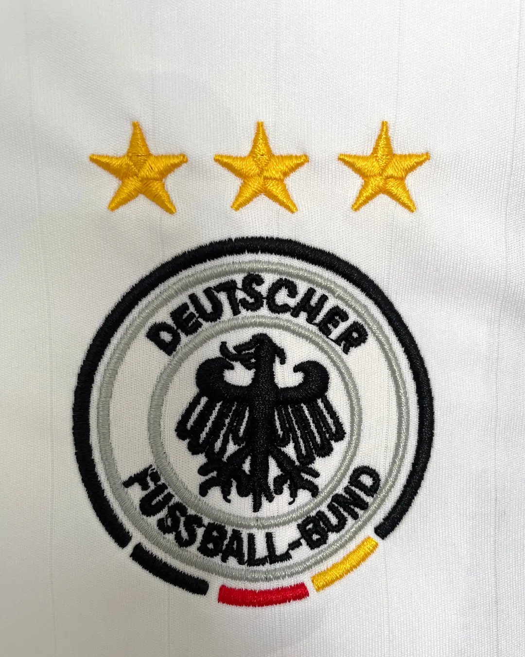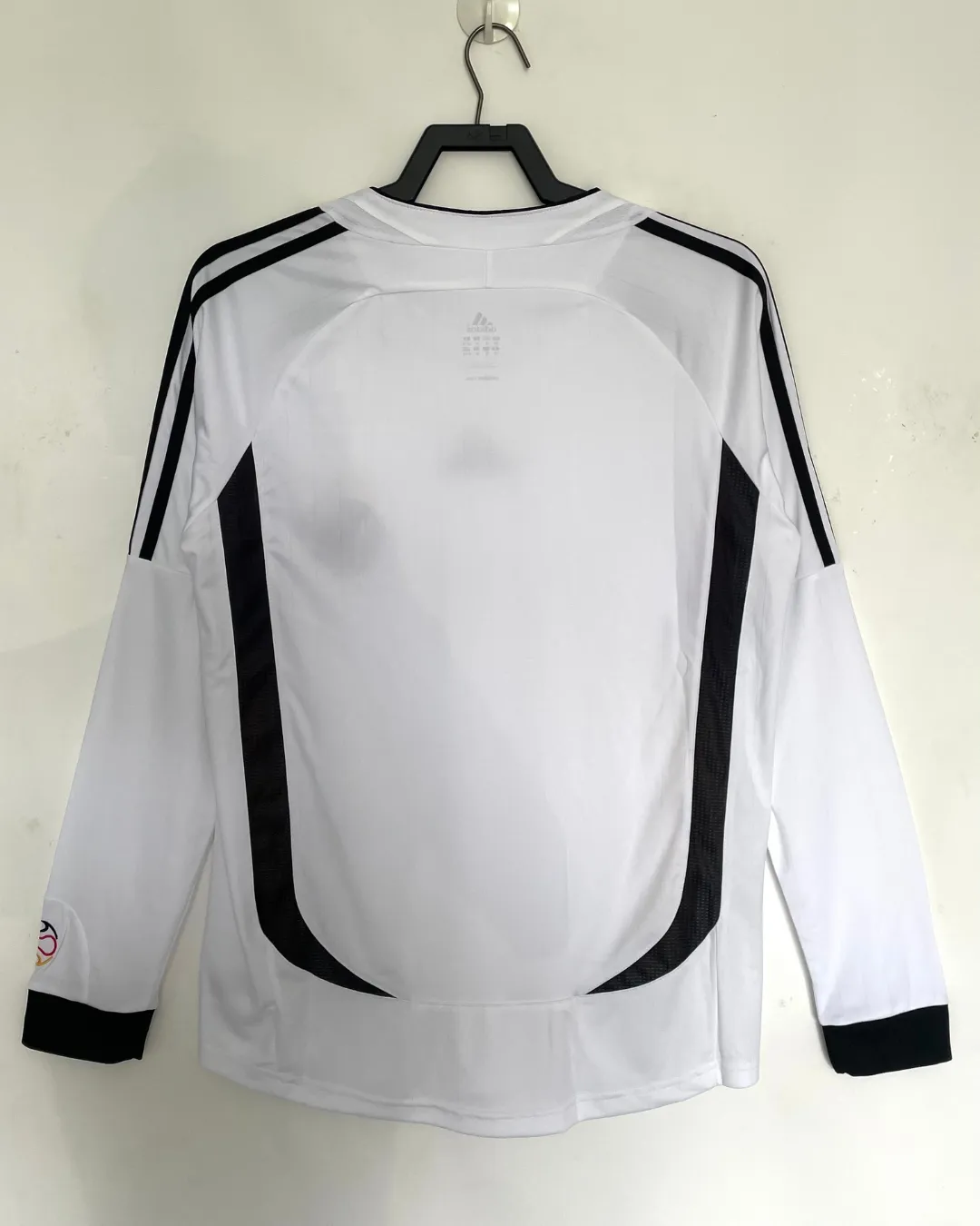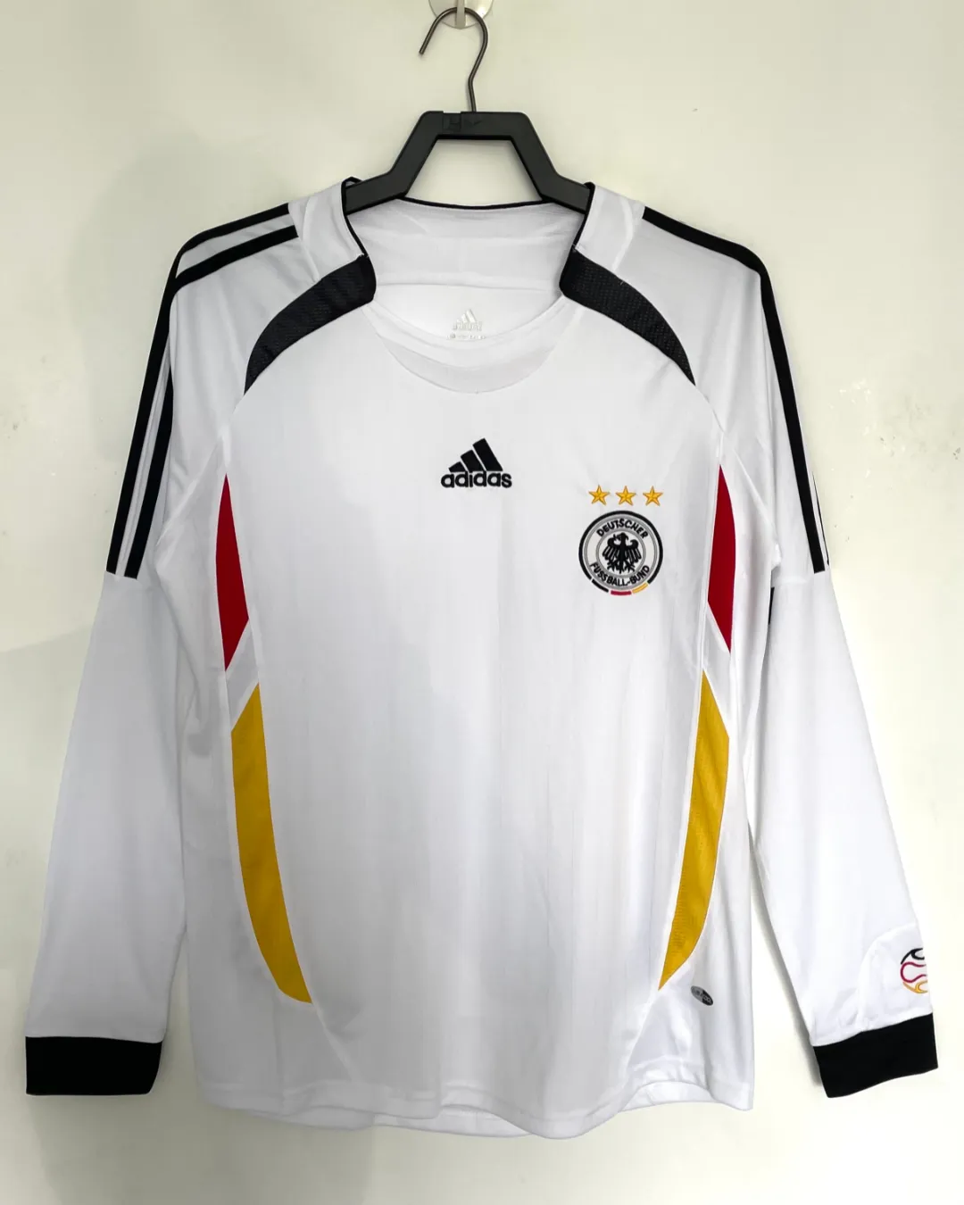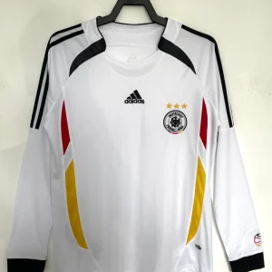 Relive Germany’s passionate Home World Cup run with the 2006 Adidas Home Jersey – Long Sleeve, worn by Michael Ballack, Philipp Lahm, and Miroslav Klose during their bronze medal campaign on home soil. The classic white base features the iconic red-white-yellow tricolour accents on the sides and the embroidered DFB eagle crest on the left chest.