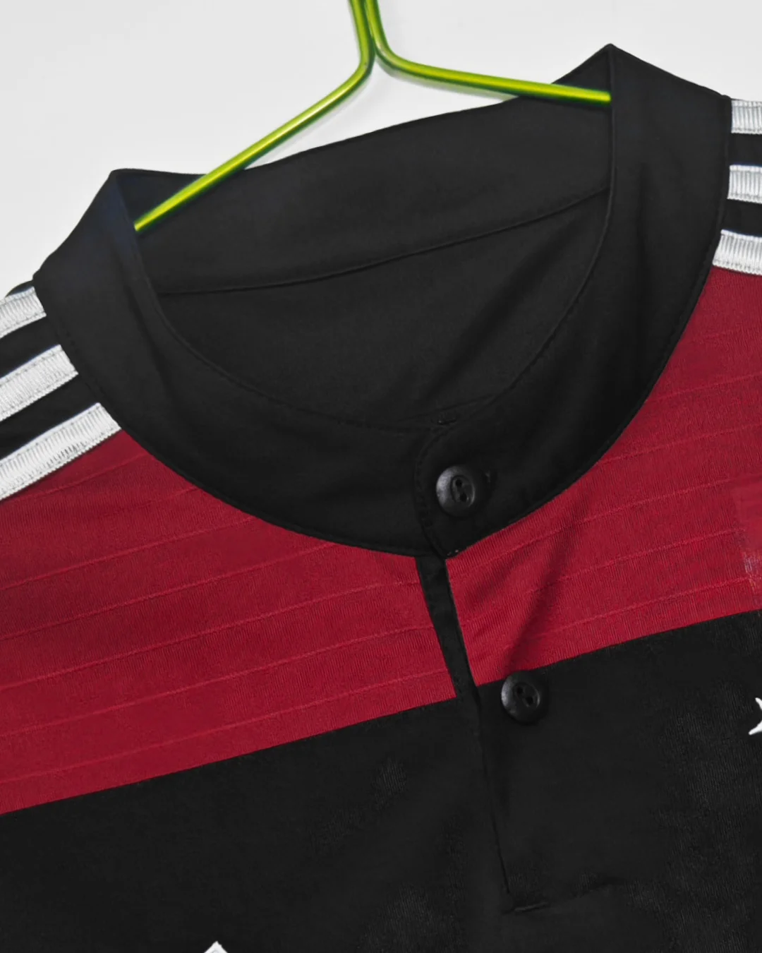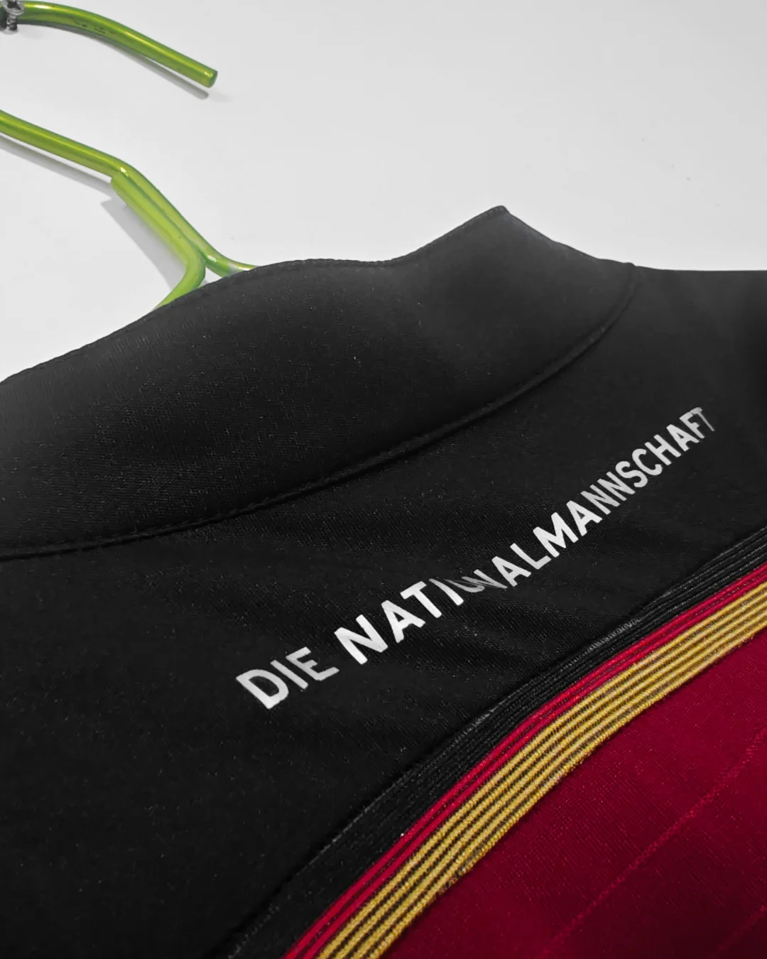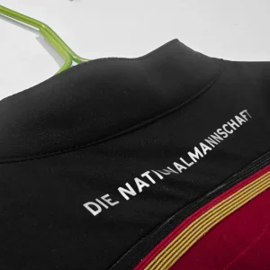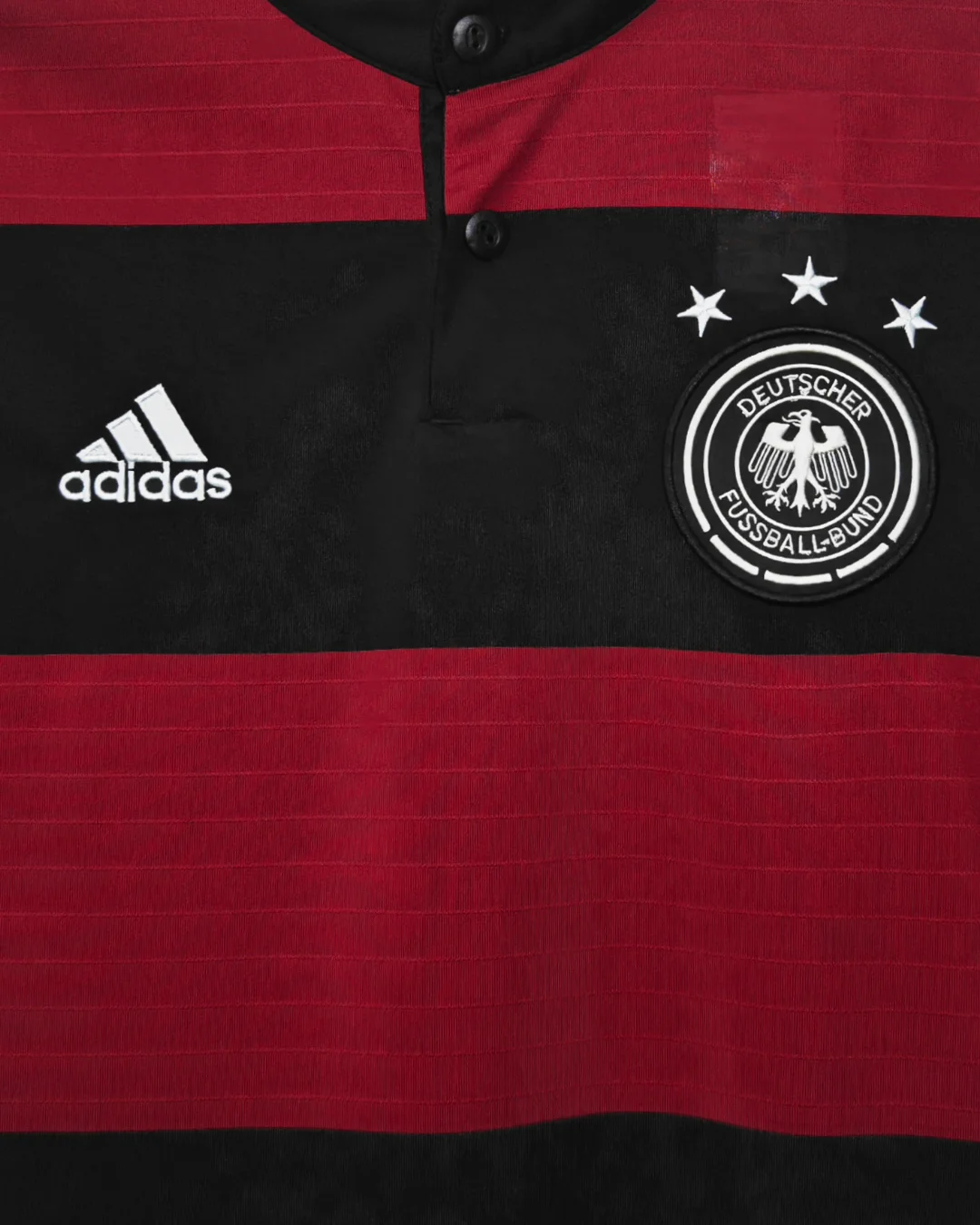 Unique collarless Henley design with button placket and “Die Nationalmannschaft” printed on the back neck
