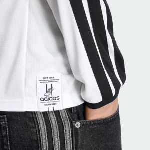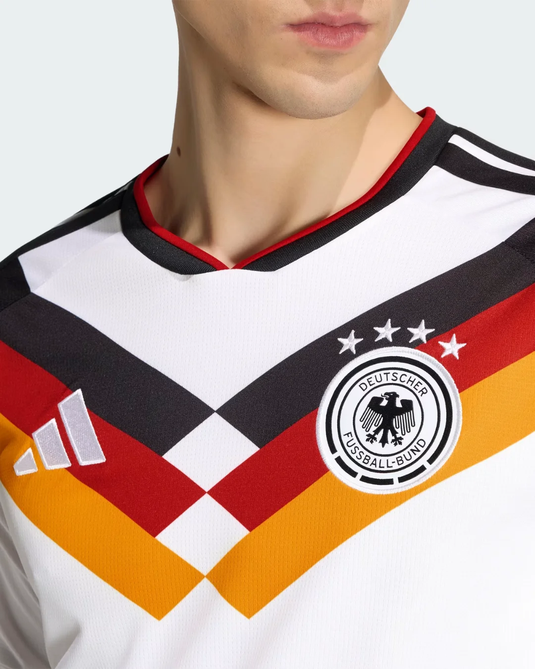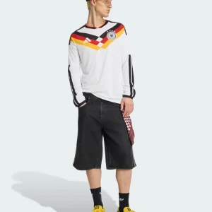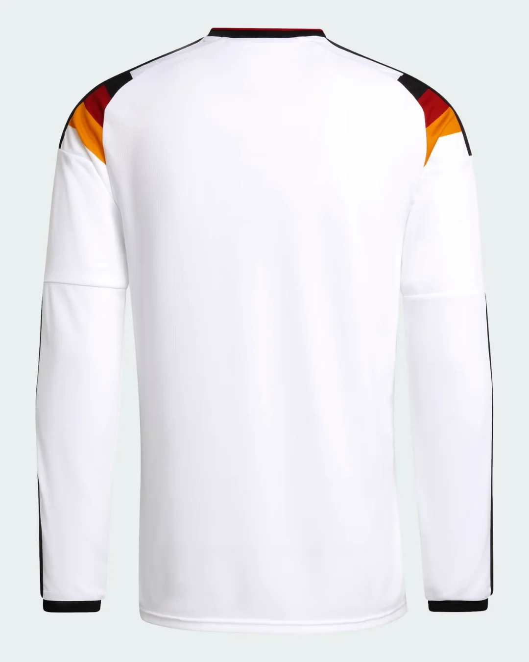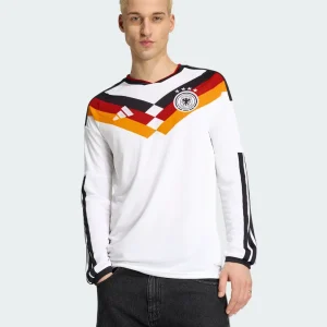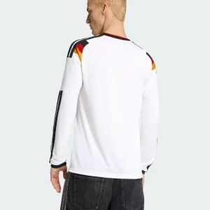 Master cooler climates with the Germany 2026 WC Home Stadium Long Sleeve Jersey from Adidas. Classic white base honors 1990 and 2014 triumphs, featuring striking tricolor V pattern in black, red, and gold across the chest, EQT-style collar with retro vibe, long sleeves with ribbed cuffs, stitched 3-Stripes shoulders, embroidered DFB eagle crest with four stars (1954, 1974, 1990, 2014), special “Adolf Dassler” authentic badge detail, and textured jacquard debuted in European friendlies.