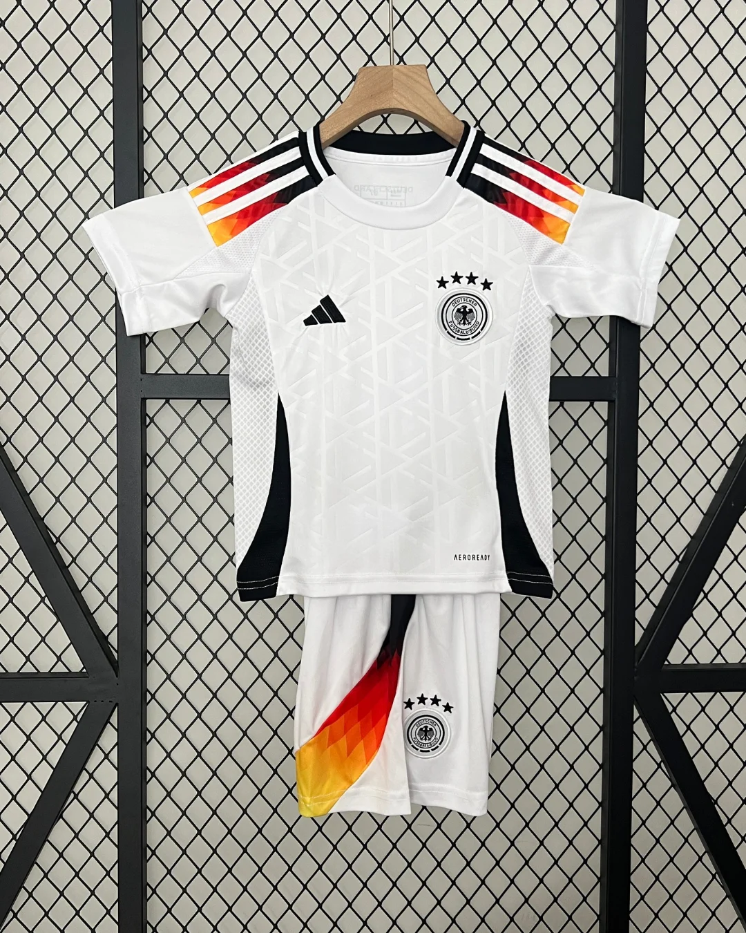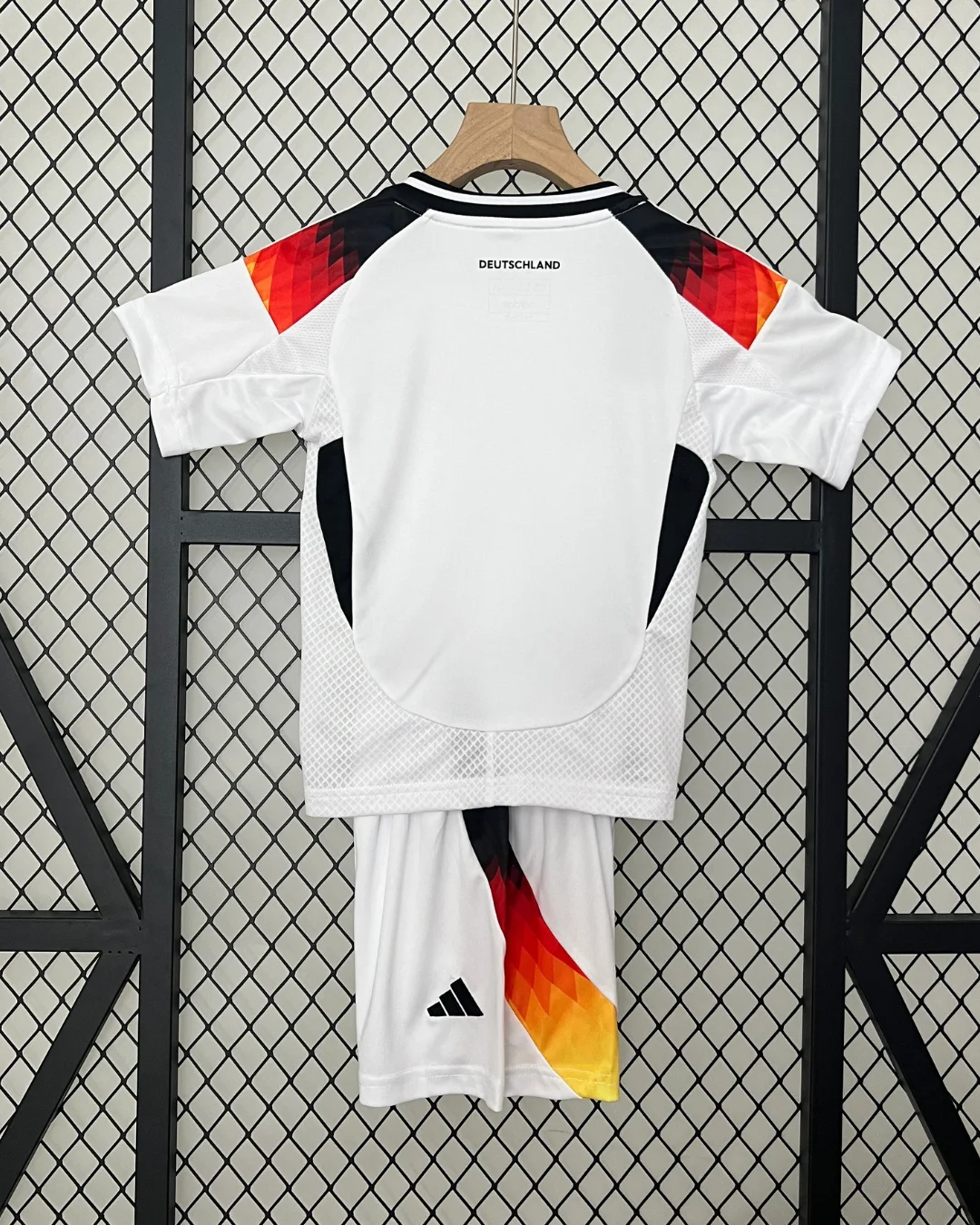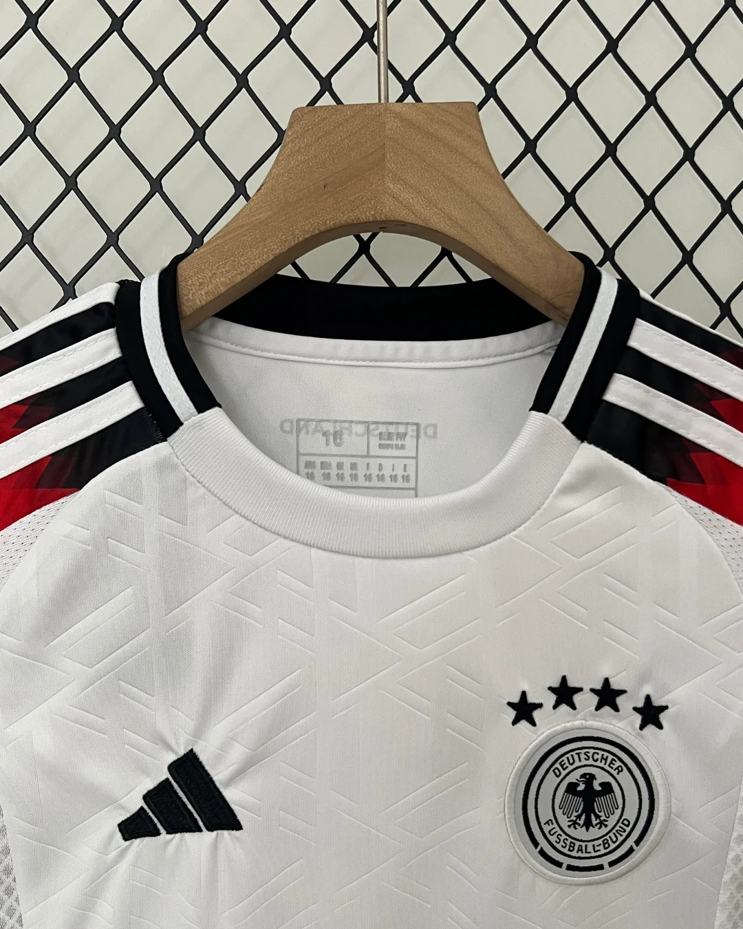 Theย Germany Kids 2024 Home Kitย by adidas features the official home shirt design for the 2024/25 season, modeled after the kit worn by the German national team in major tournaments such as UEFA Euro 2024. It has a predominantly white base with subtle black and red details that reflect the traditional German national colors.