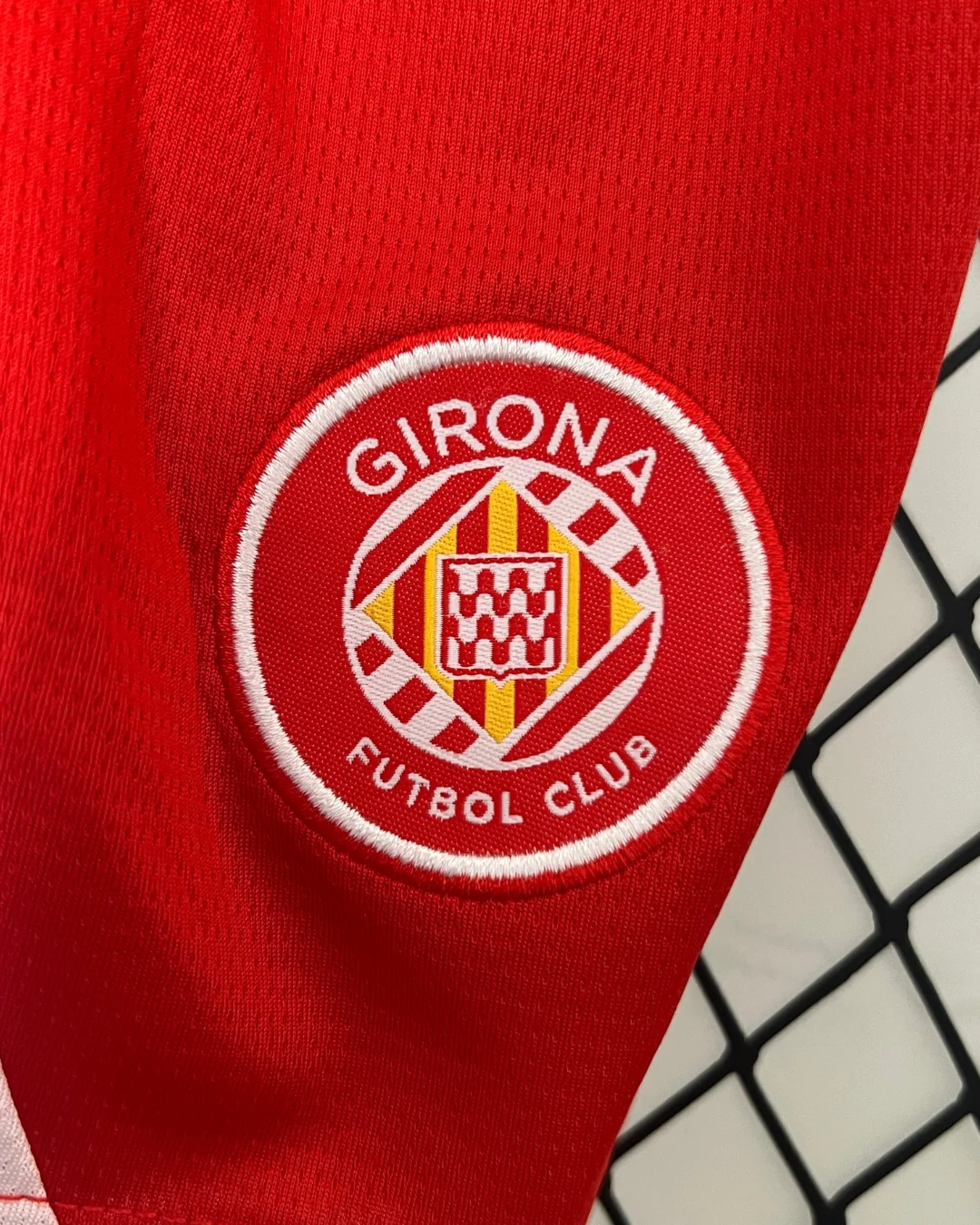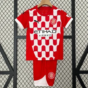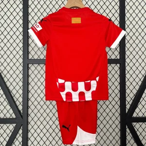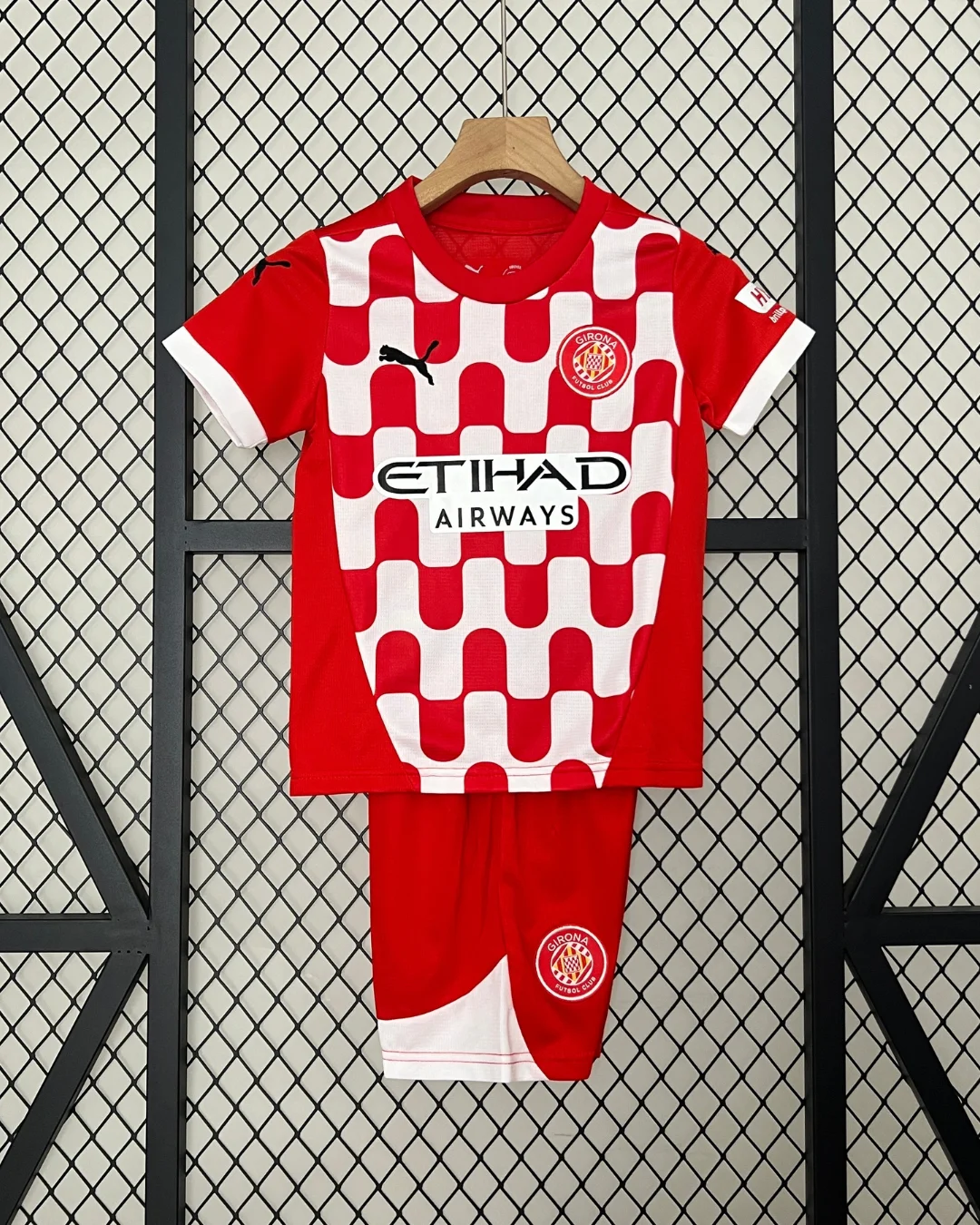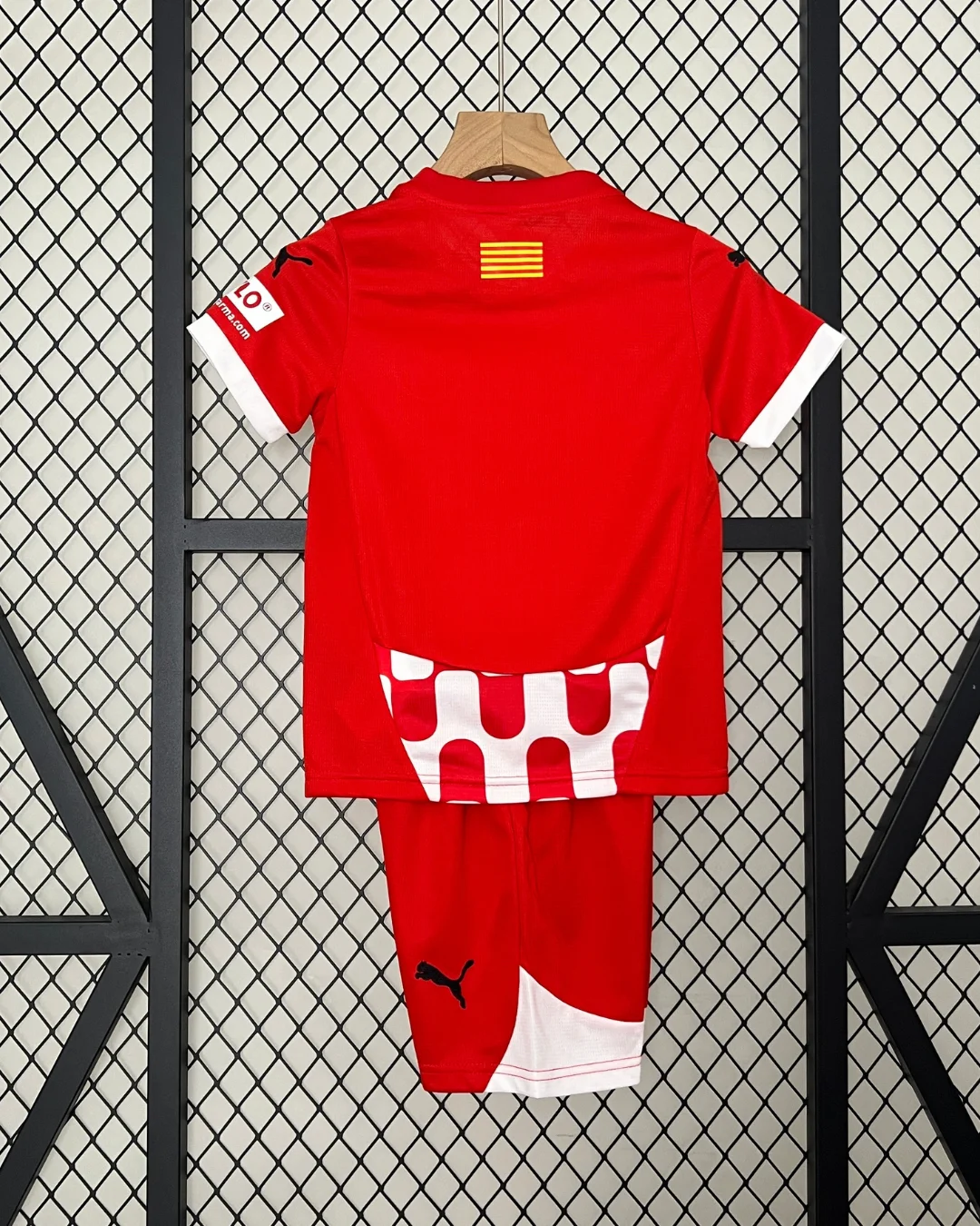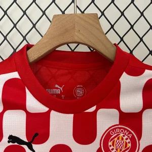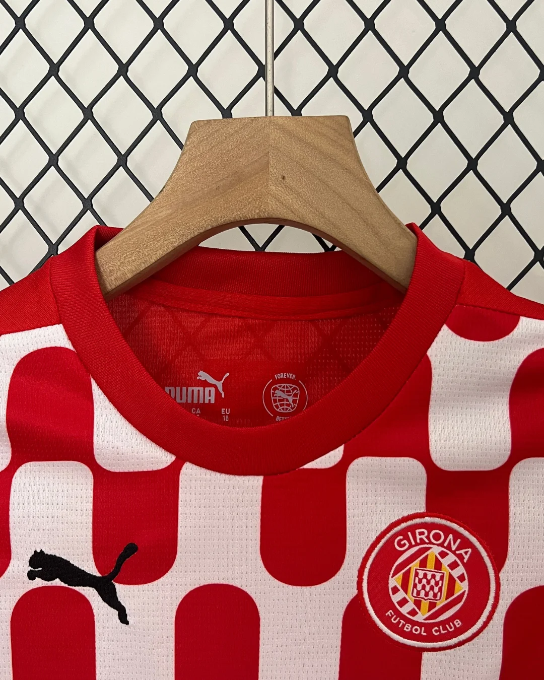 The Puma Girona FC Kids 24/25 Home Kit draws inspiration from the city’s coat of arms and surrounding rivers, featuring a white base with a unique wavy red-and-white pattern symbolizing flowing water for young Blanquivermells.