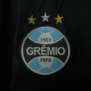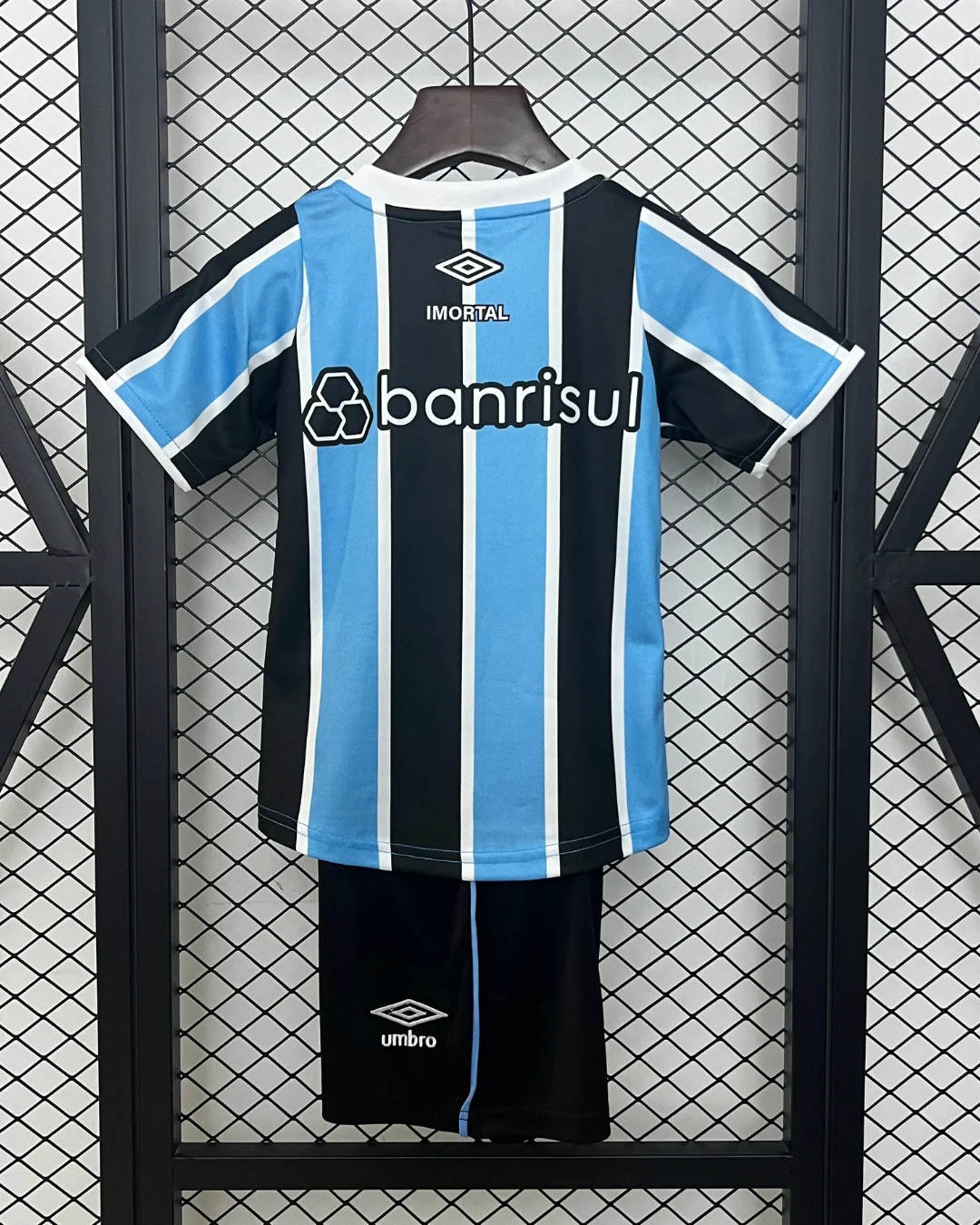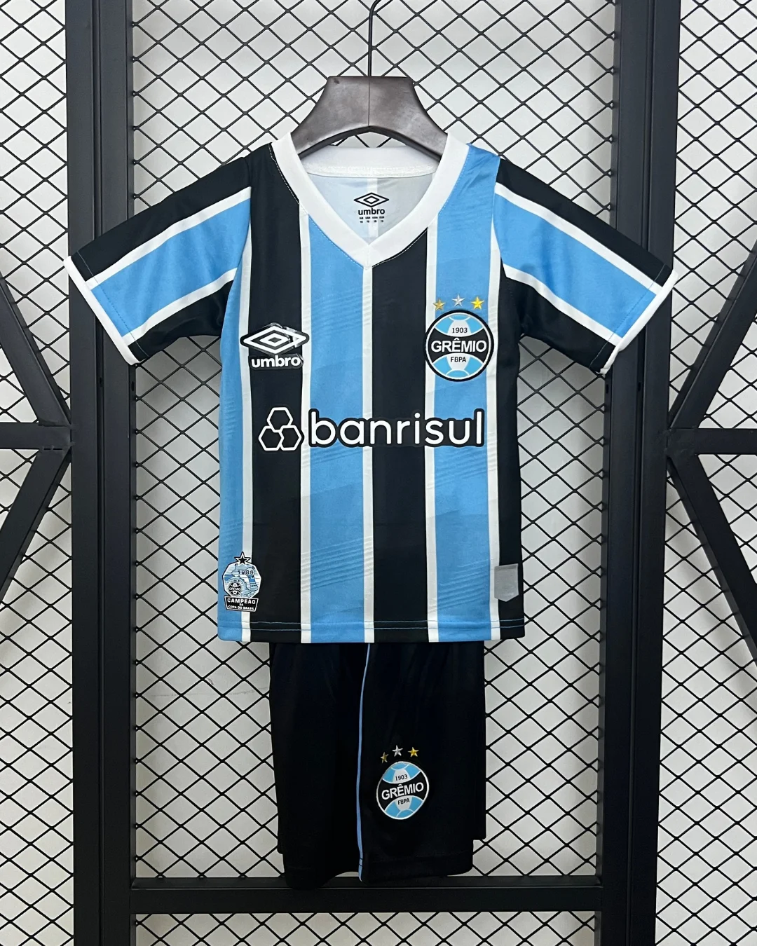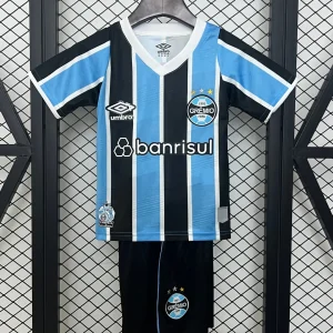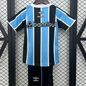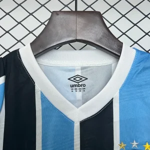 The Umbro Grêmio FBPA Kids 24/25 Home Kit celebrates the 35th anniversary of the club’s first Brazilian Cup victory in 1989, featuring traditional blue and black stripes with thin white lines separating them for young Immortal fans. This home jersey includes subtle front prints of the 1989 cup run results, GFBPA acronym, and year markings, plus white Umbro and Banrisul sponsor logos.