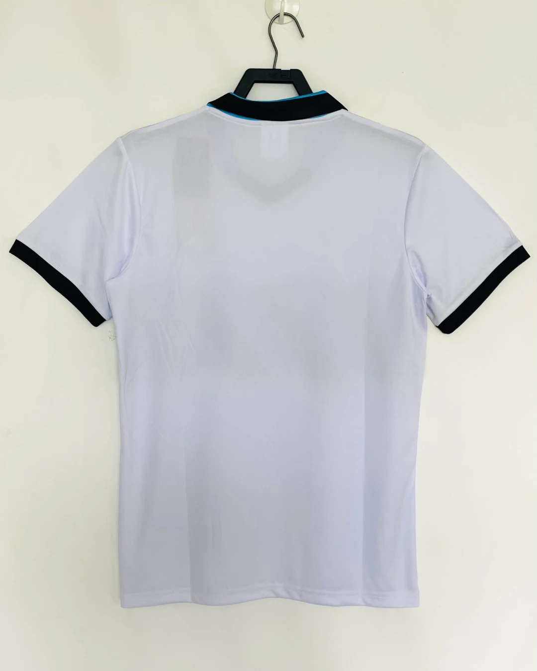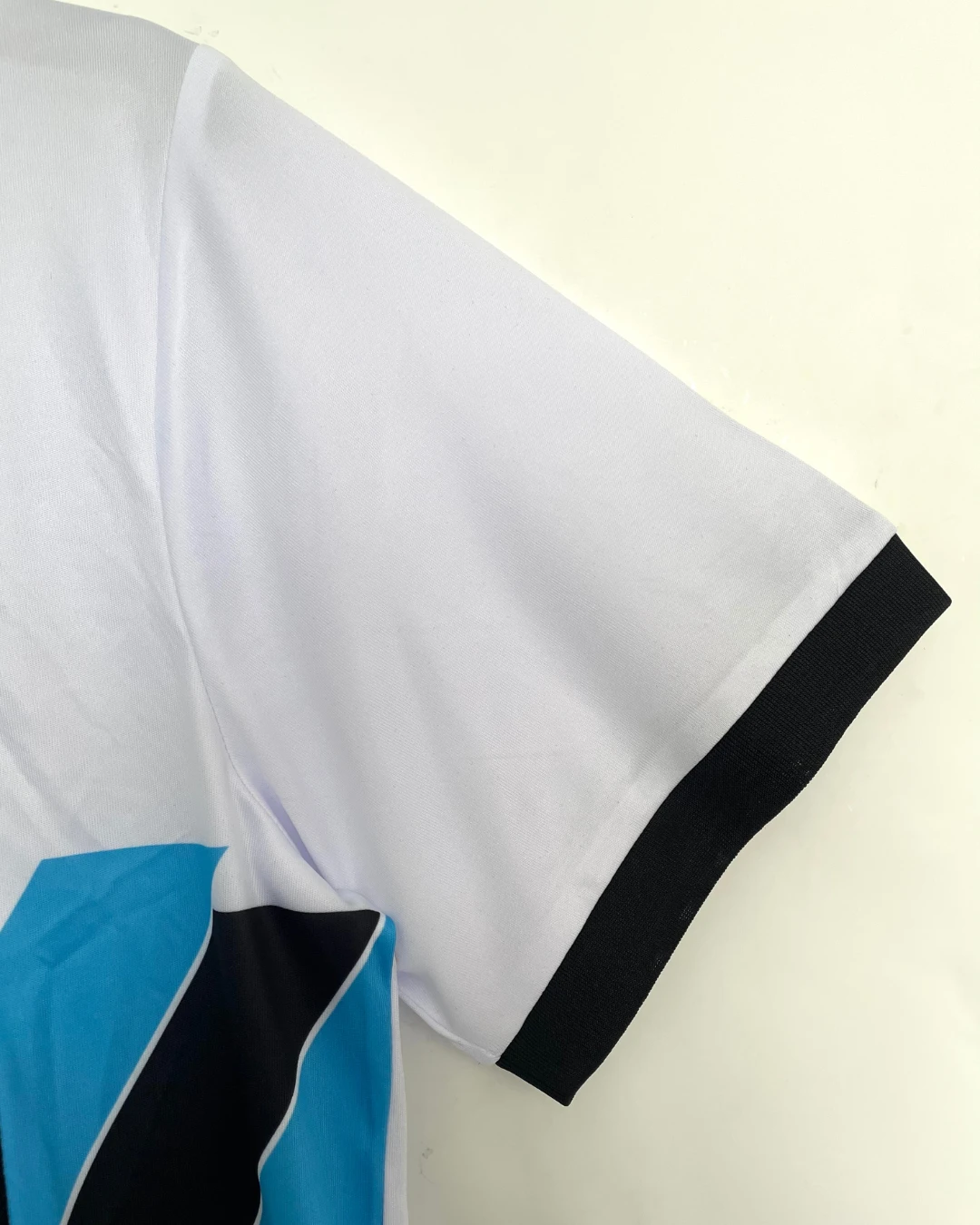 Inter Milan’s iconic 1990/91 Away Jersey from Uhlsport powered Giovanni Trapattoni’s UEFA Cup-winning campaign, featuring World Cup winners Lothar Matthäus, Andreas Brehme, and Jürgen Klinsmann during their triumphant Serie A challenge at the San Siro. The striking white base showcases dynamic diagonal blue and black geometric patterns across the chest, black V-neck collar, Misura sponsor in bold white lettering, embroidered Nerazzurri snake crest on the left chest, and Uhlsport logo opposite, a bold post-Italia ’90 design blending innovation with club heritage.