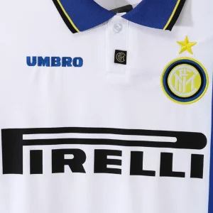 Celebrate a distinct and stylish era of Italian football with the Inter Milan 1997/98 Away Jersey, a standout piece from the late 90s featuring a white base with blue, black and yellow detailing that captures attention on and off the pitch. This jersey highlights the club’s identity with the iconic Inter crest prominently displayed on the chest and the classic Pirelli sponsor logo.
