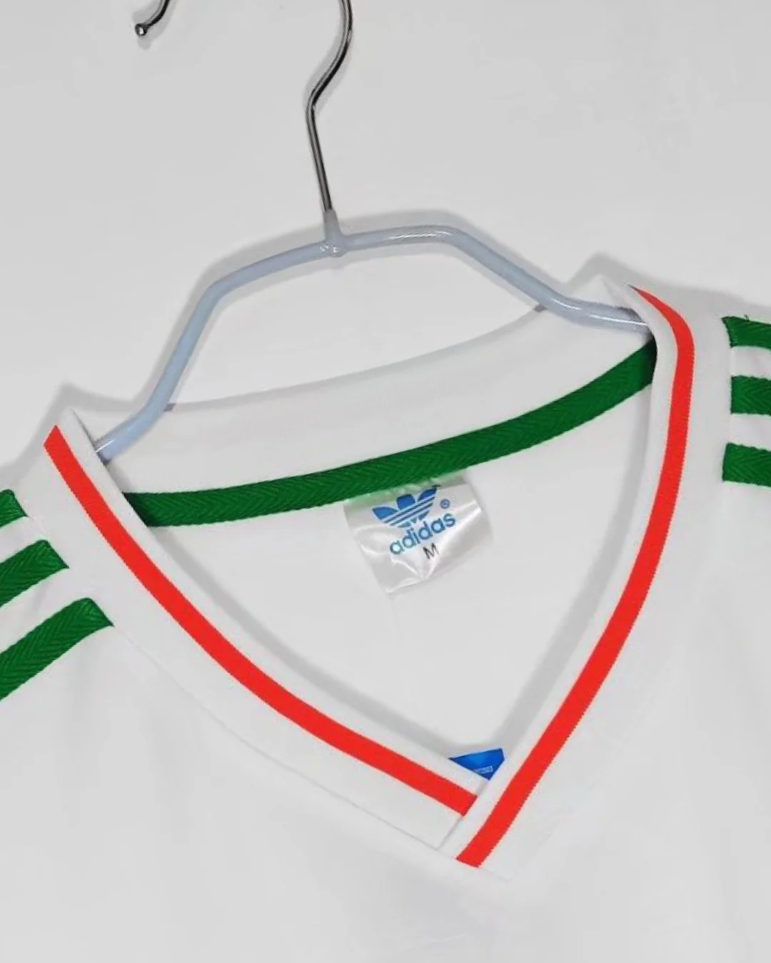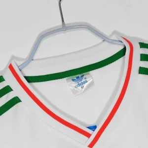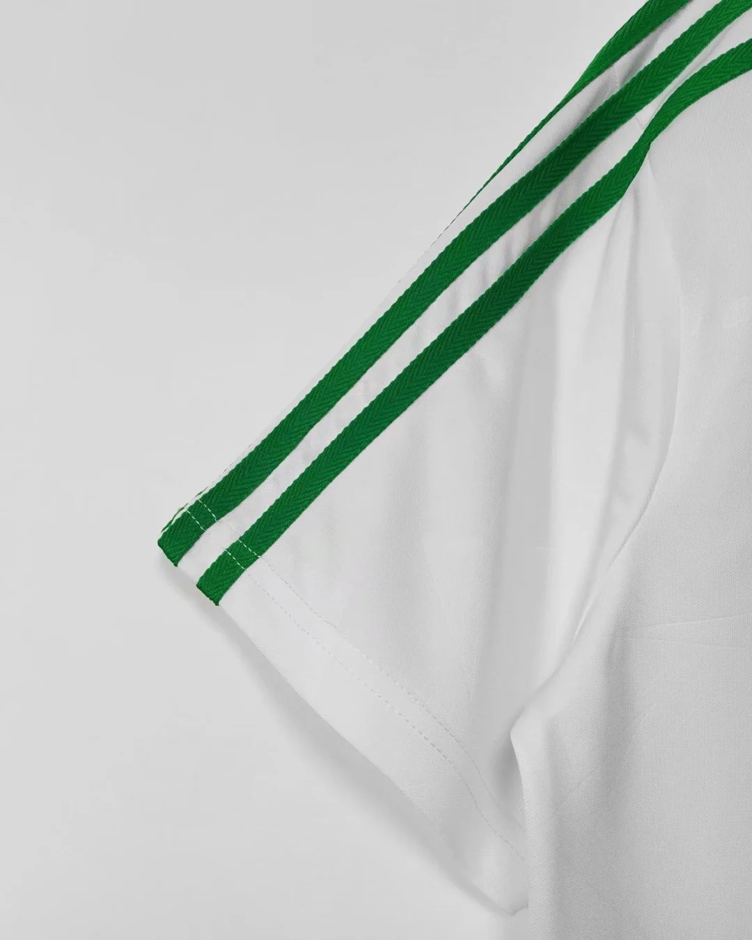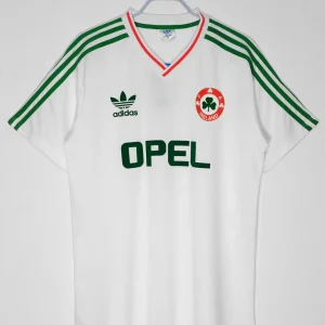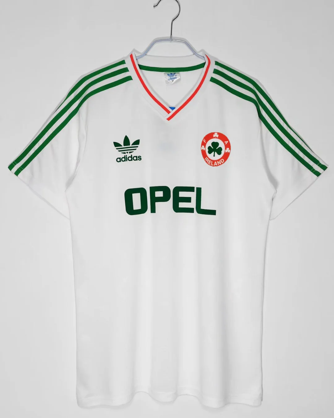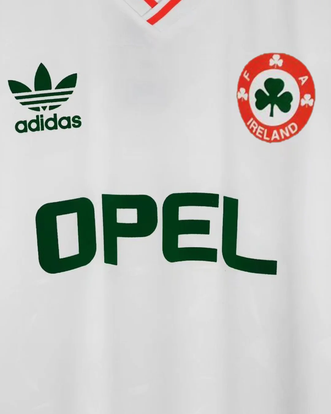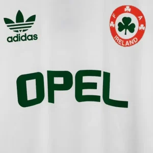 Relive the unforgettable moments of Ireland’s remarkable 1990 FIFA World Cup debut with this authentic Ireland 1990 Away Jersey by Adidas. This classic shirt features a clean white base detailed with the iconic green Adidas three-stripe shoulder accents and the nostalgic Opel sponsorship logo, making it a true vintage treasure for fans and collectors.