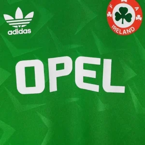 Celebrate Ireland’s historic 1990 FIFA World Cup journey with this authentic 1990 Home Jersey by Adidas. This iconic jersey features the traditional deep green base complemented by subtle white Adidas stripes on the shoulders, symbolizing the pride and spirit of Irish football.