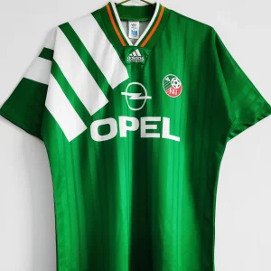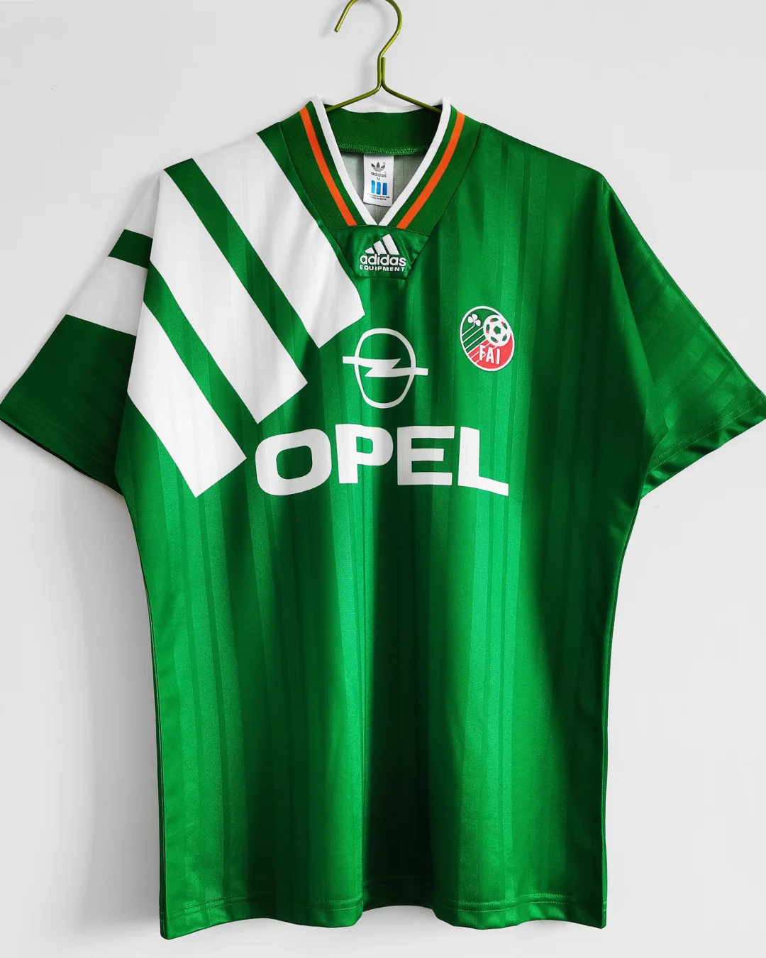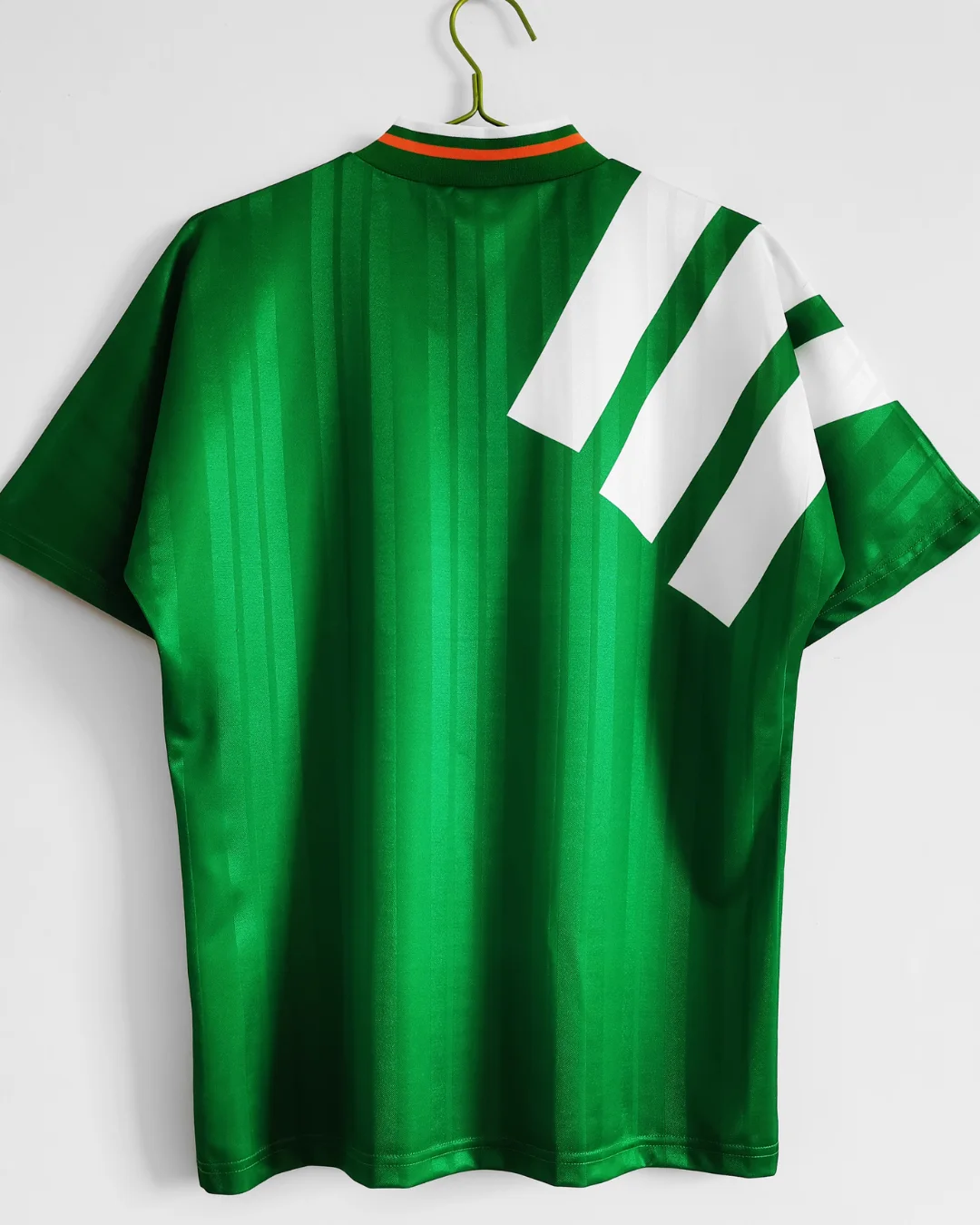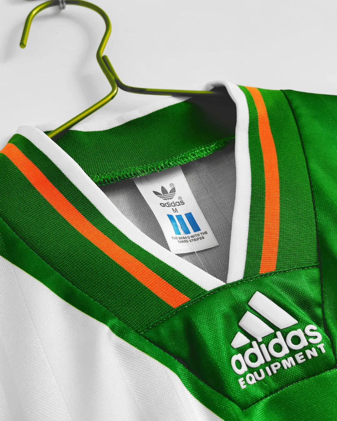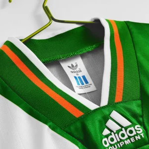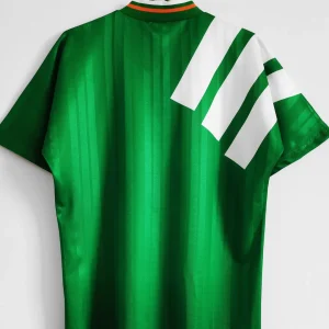 Celebrate the pride and heritage of Irish football with the classic Ireland 1992 Home Jersey, a kit that symbolizes the nation’s spirited presence on the international stage during the early 1990s. Crafted from Adidas, the jersey features a deep green base complemented by white Adidas three-stripe detailing on the shoulders and a contrasting white collar with orange and green trim, representing the colors of the Irish flag.