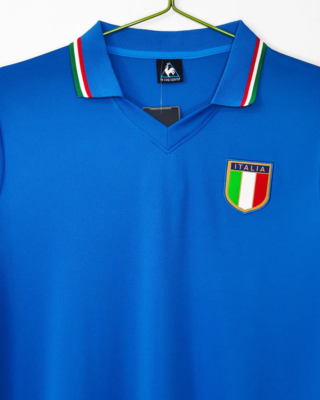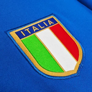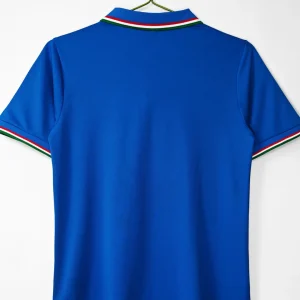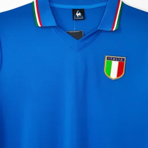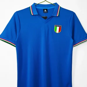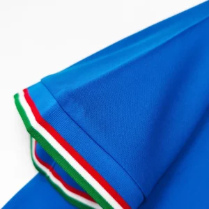Italy’s legendary 1982 World Cup Home Jersey from Le Coq Sportif delivered their third world title in Spain, featuring the iconic deep “Azzurro” blue heavyweight fabric with subtle sheen, distinctive fold-over V-neck collar and sleeve cuffs trimmed in Italian tricolor (green-white-red) stripes symbolizing national pride, clean minimalist design without chest sponsor, worn during their triumphant run past Brazil and West Germany. Perfect for young Azzurri fans, this retro replica uses 100% cotton-blend construction replicating the 80s heavyweight feel, embroidered FIGC shield crest on left chest with vertical lining detail, short sleeves and regular relaxed fit.