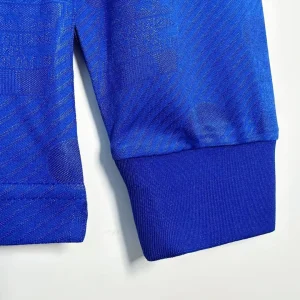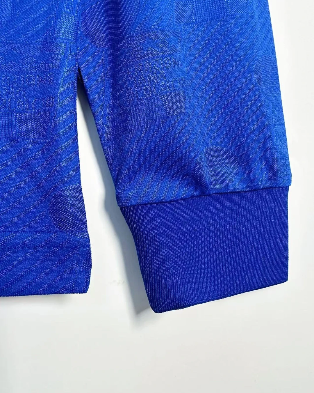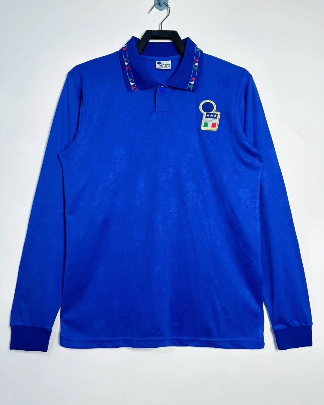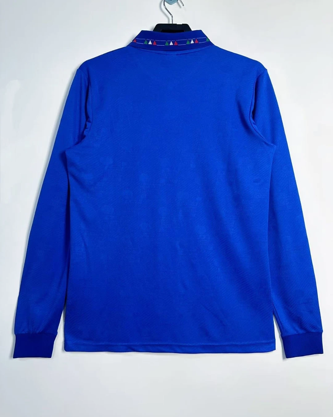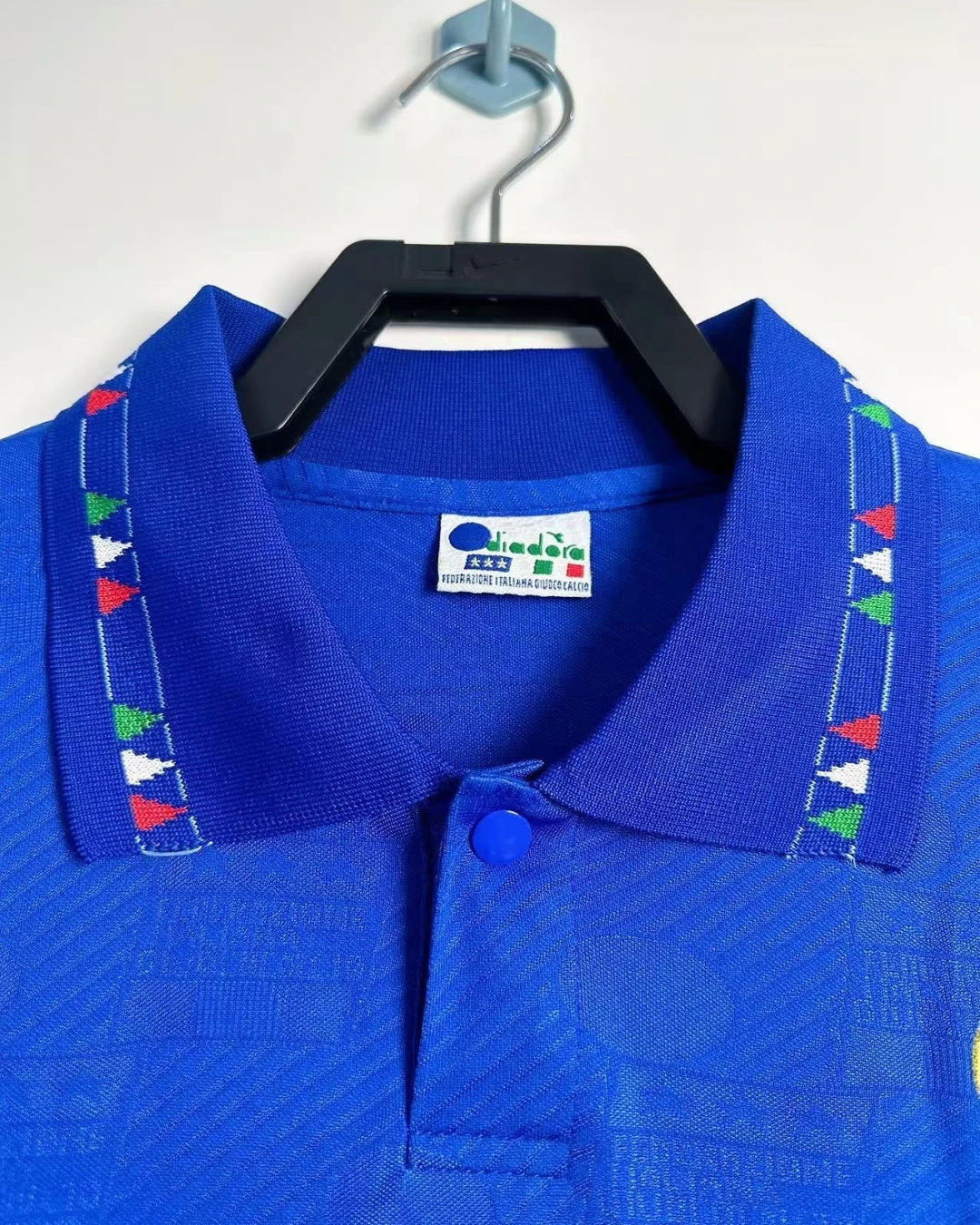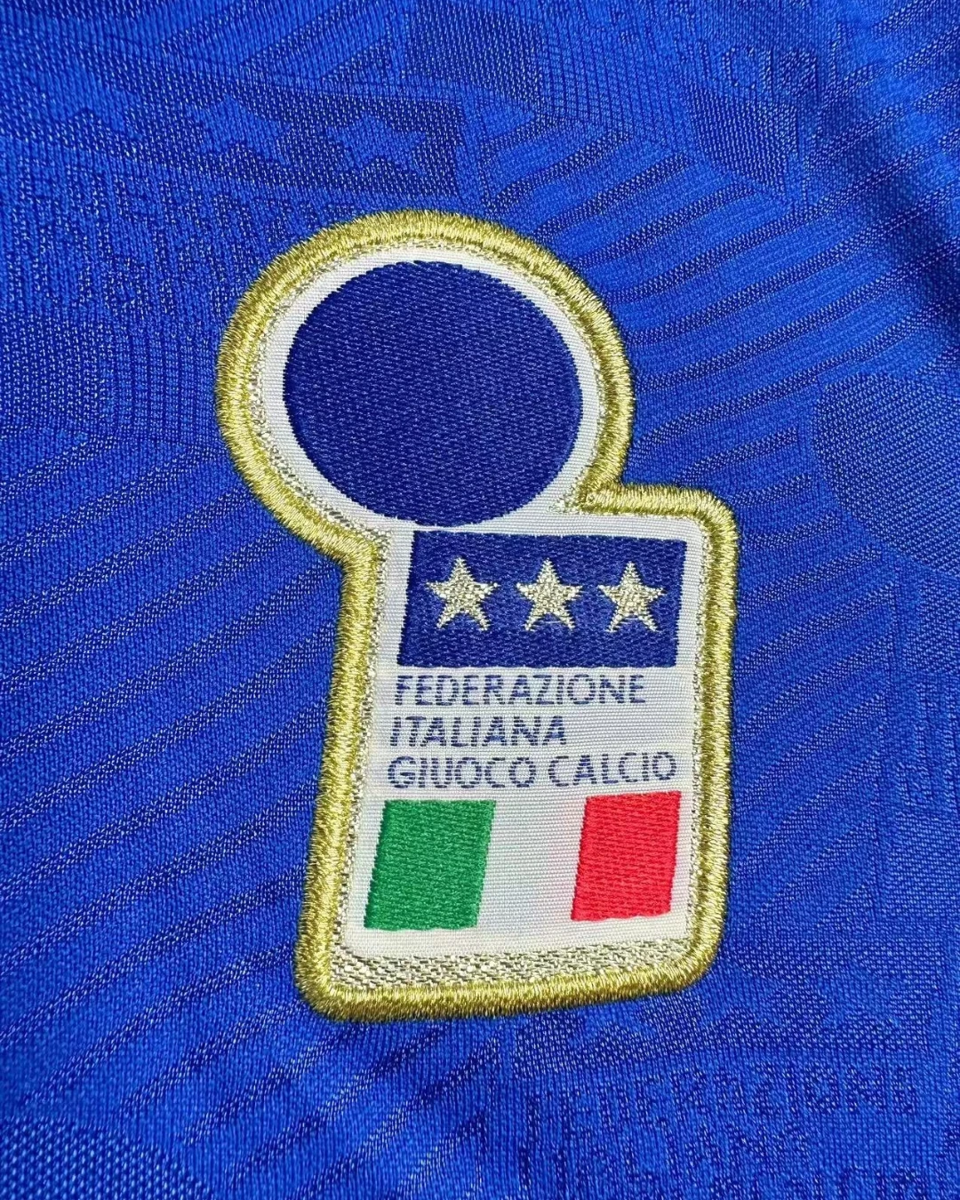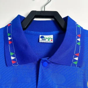 Italy’s 1994 World Cup Home Jersey -Lon from Diadora powered Arrigo Sacchi’s Azzurri to the final in the USA, worn by Roberto Baggio, Salvatore Schillaci, Franco Baresi, and Daniele Massaro during their dramatic penalty shootout heartbreak against Brazil at the Rose Bowl. The iconic Azzurri blue base features an embossed geometric pattern with repeated FIGC logos, tricolor polo collar and sleeve cuffs, embroidered Italian Football Federation badge on the left chest, and no central sponsor for tournament purity, one of football’s most recognizable designs.