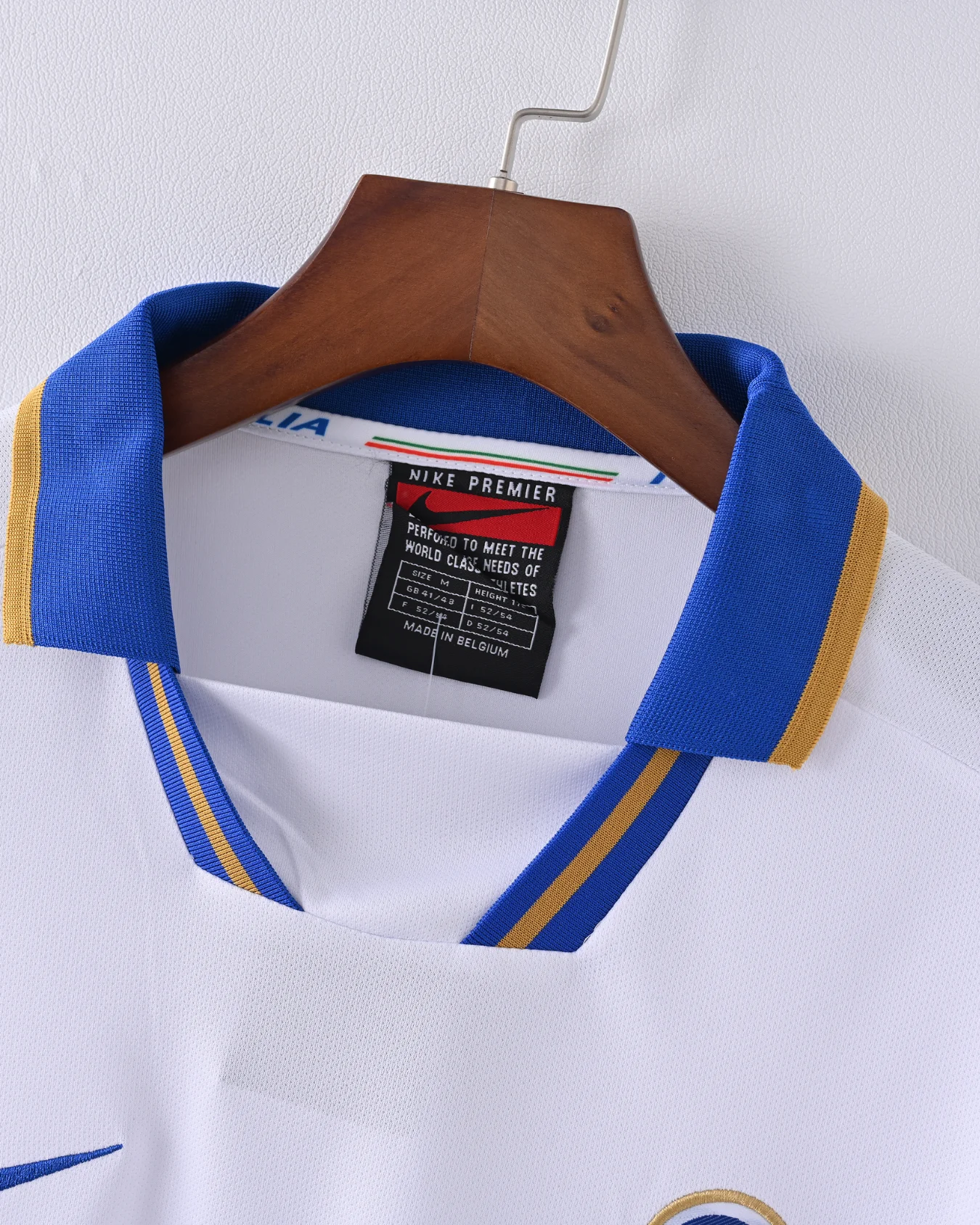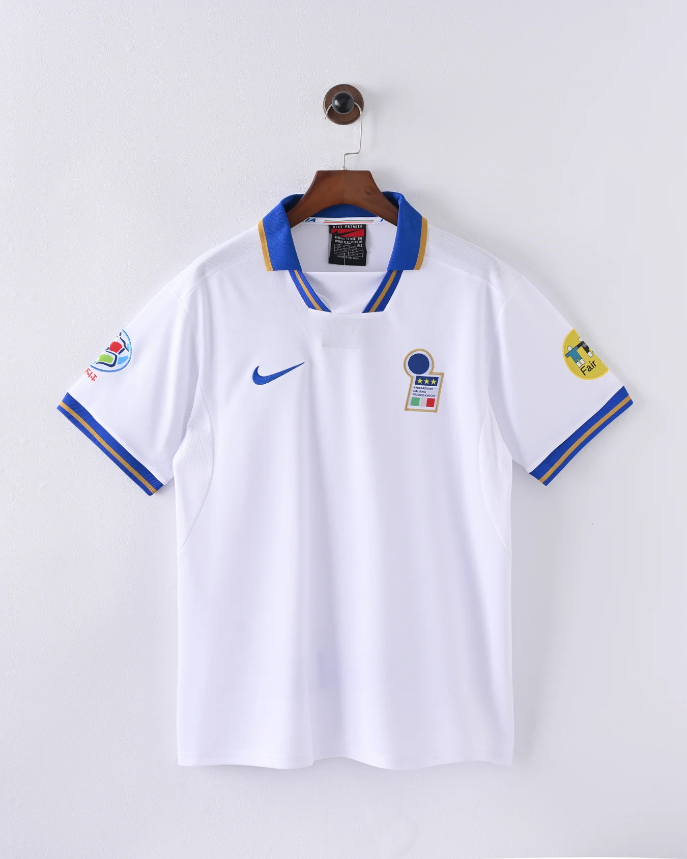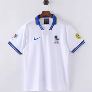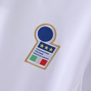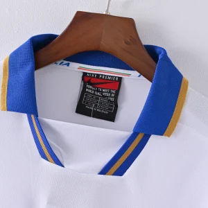 The Italy 1996 Away Jersey is a masterclass in understated style — a crisp white canvas subtly framed by the regal touches of blue and gold. Worn during the UEFA Euro ’96 campaign, this jersey echoes an era where Italian football combined tactical discipline with undeniable flair, led by icons like Roberto Baggio and Alessandro Del Piero.