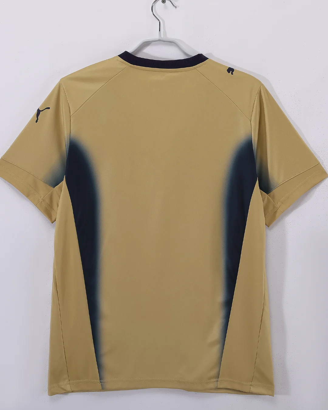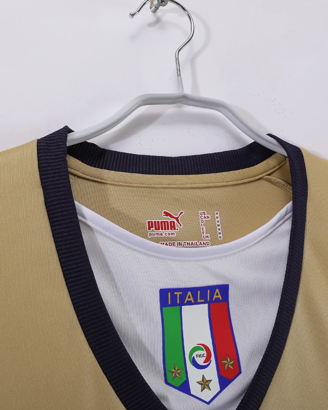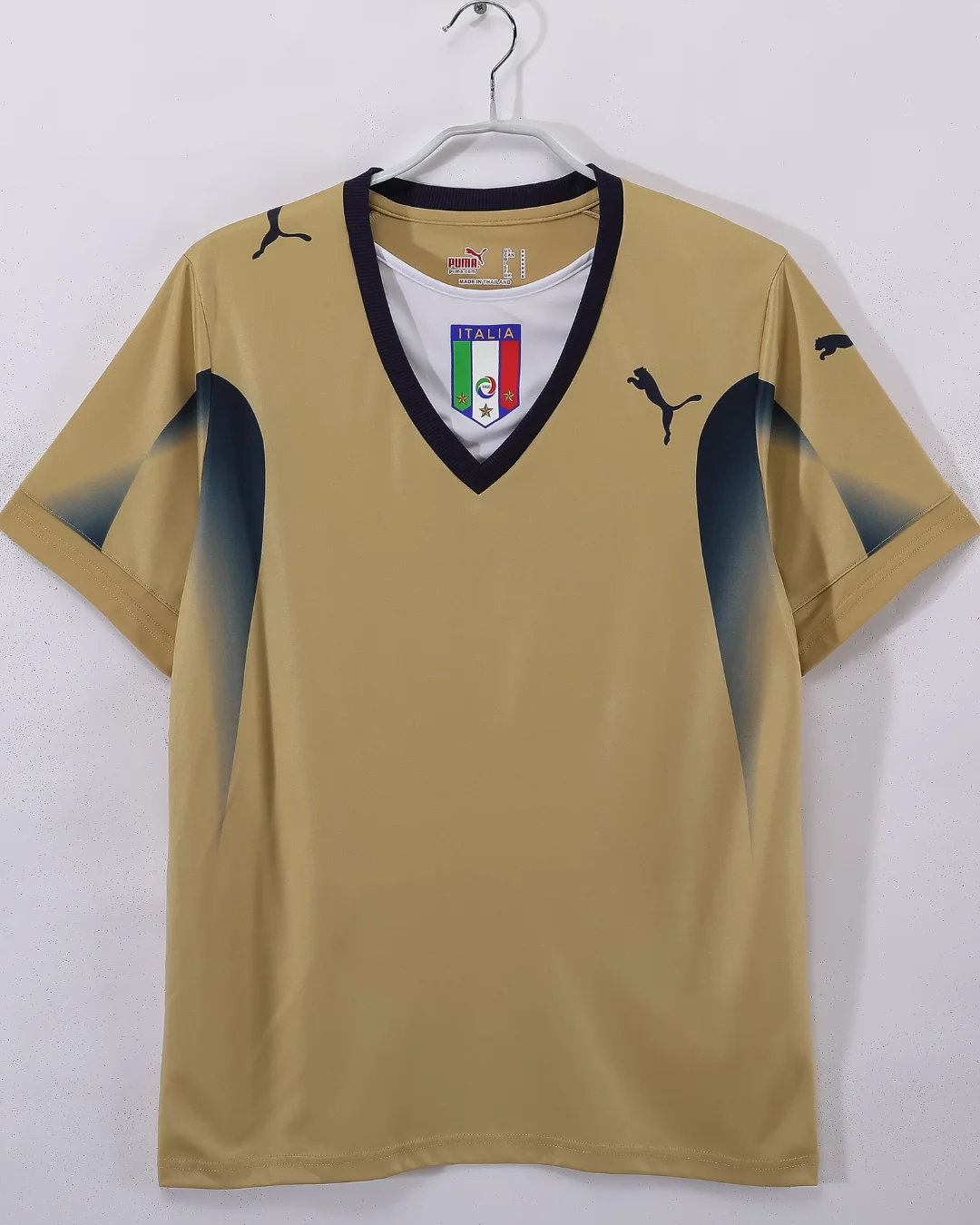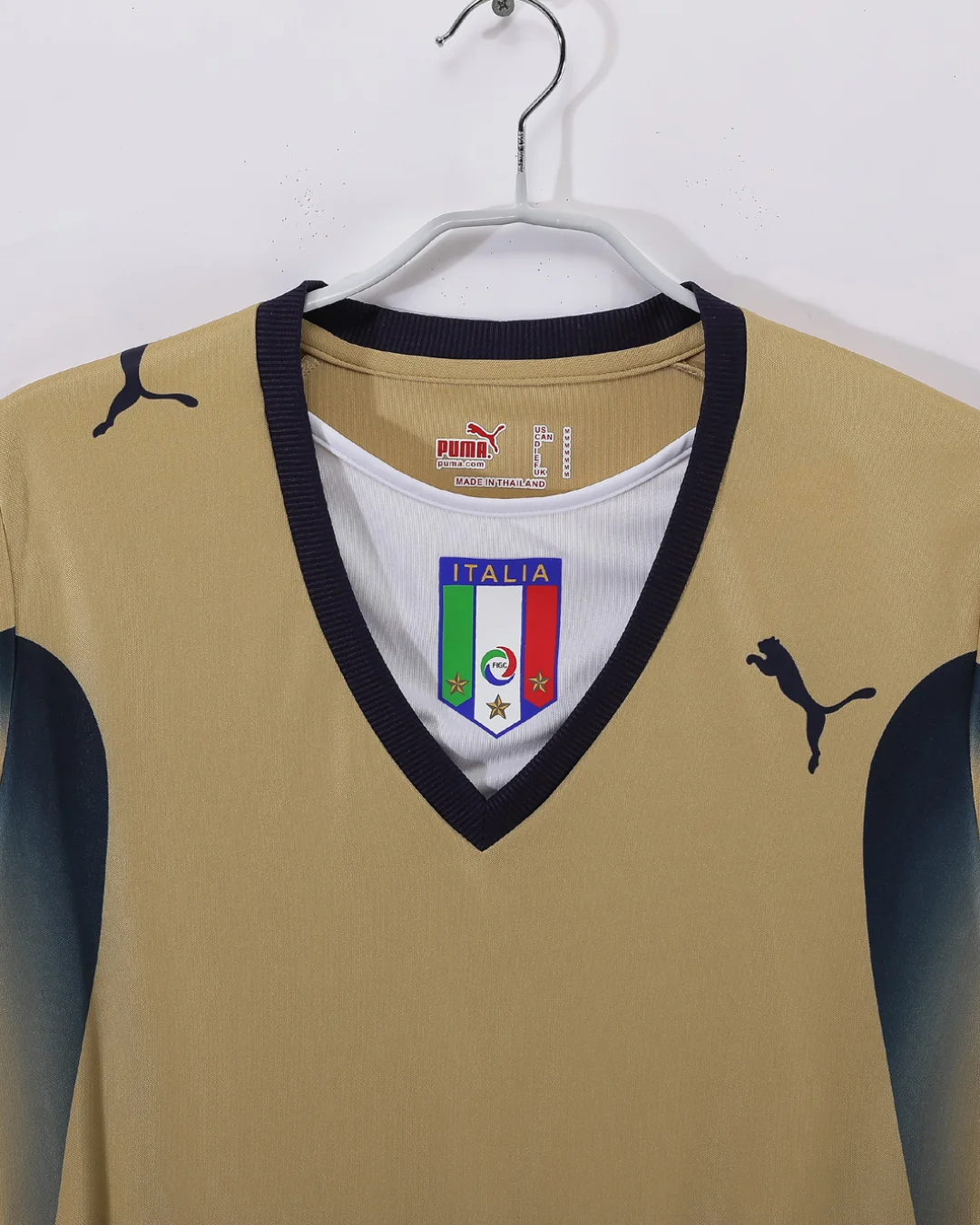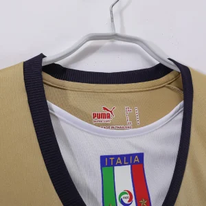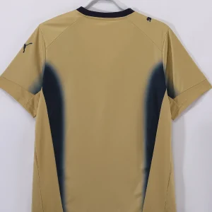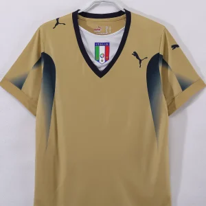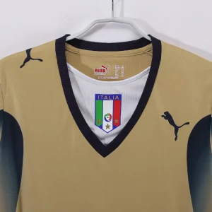 Celebrate the legendary performance of Italy’s last line of defense with the Italy 2006 Goalkeeper Jersey, famously worn by Gianluigi Buffon during Italy’s victorious FIFA World Cup campaign. This iconic jersey features a bold gold base color with blue accents, embodying Italian elegance and the grit that led them to lift the trophy.