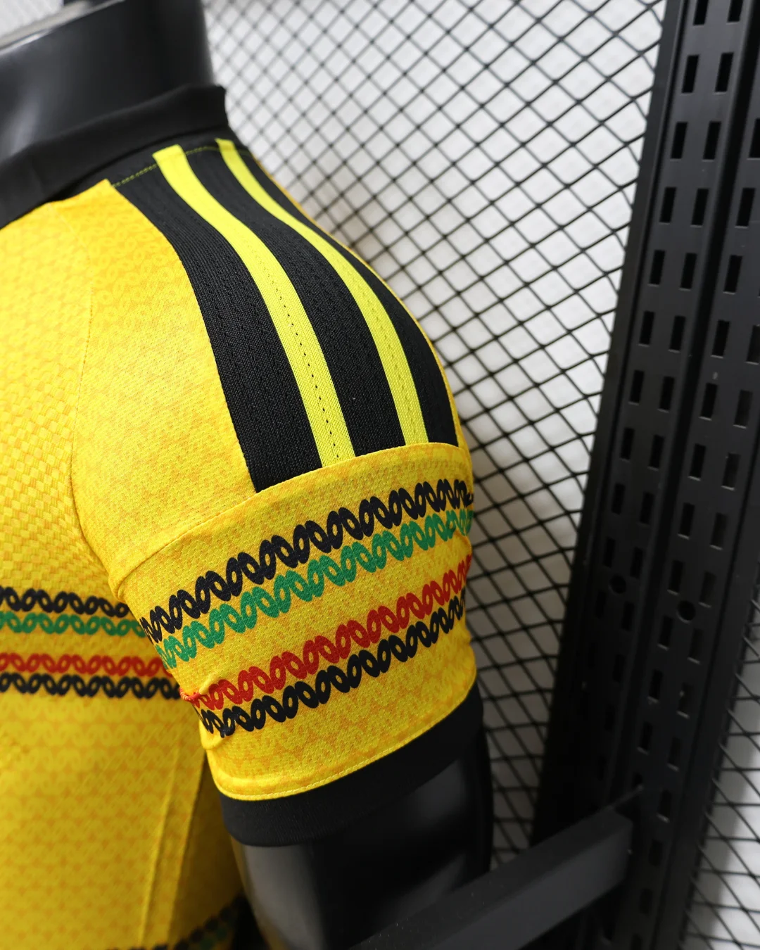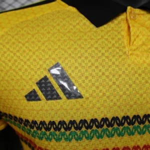 Fuel the Reggae Boyz’ rhythmic World Cup charge with the Jamaica 26 x Bob Marley Home Authentic Jersey from Adidas. Featuring a vibrant Bold Gold base with vivid green, pure ruby and black accents echoing reggae colors and island heritage, it showcases subtle jacquard patterns inspired by Bob Marley’s iconic legacy and “Football Is Freedom” spirit. Engineered from 100% recycled polyester with Climacool+ technology, this jersey delivers superior moisture-wicking, breathability, and a slim authentic fit for elite match performance. Essential for fans channeling Jamaica’s irie vibes and unyielding island pride.