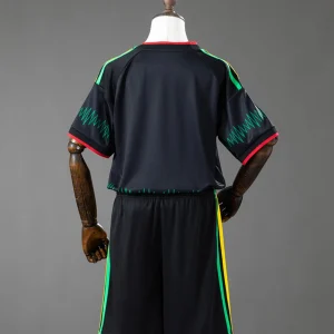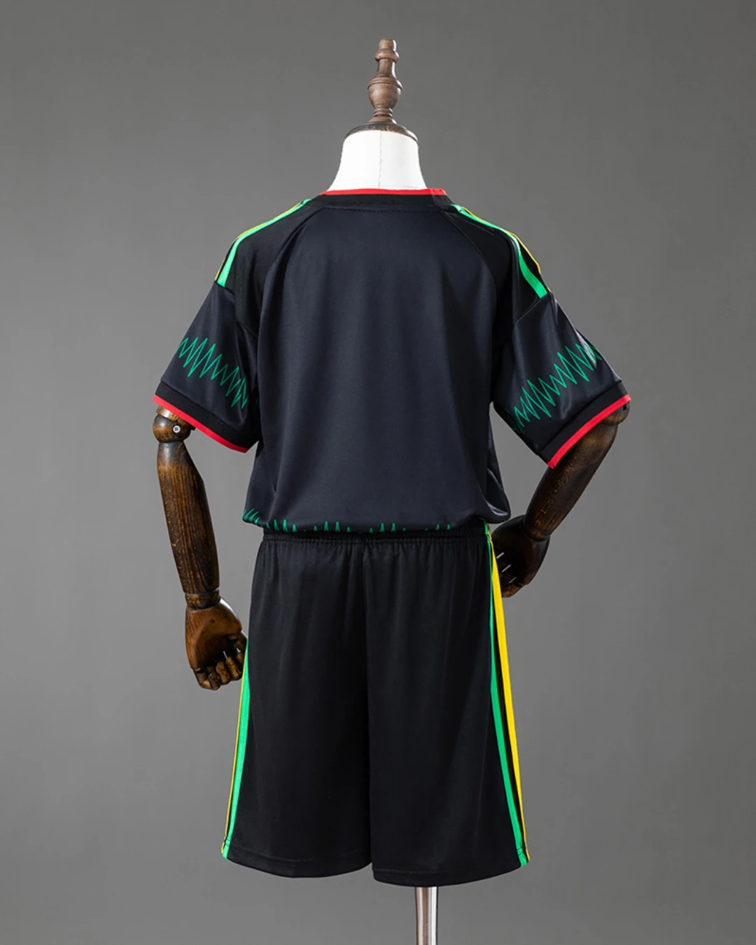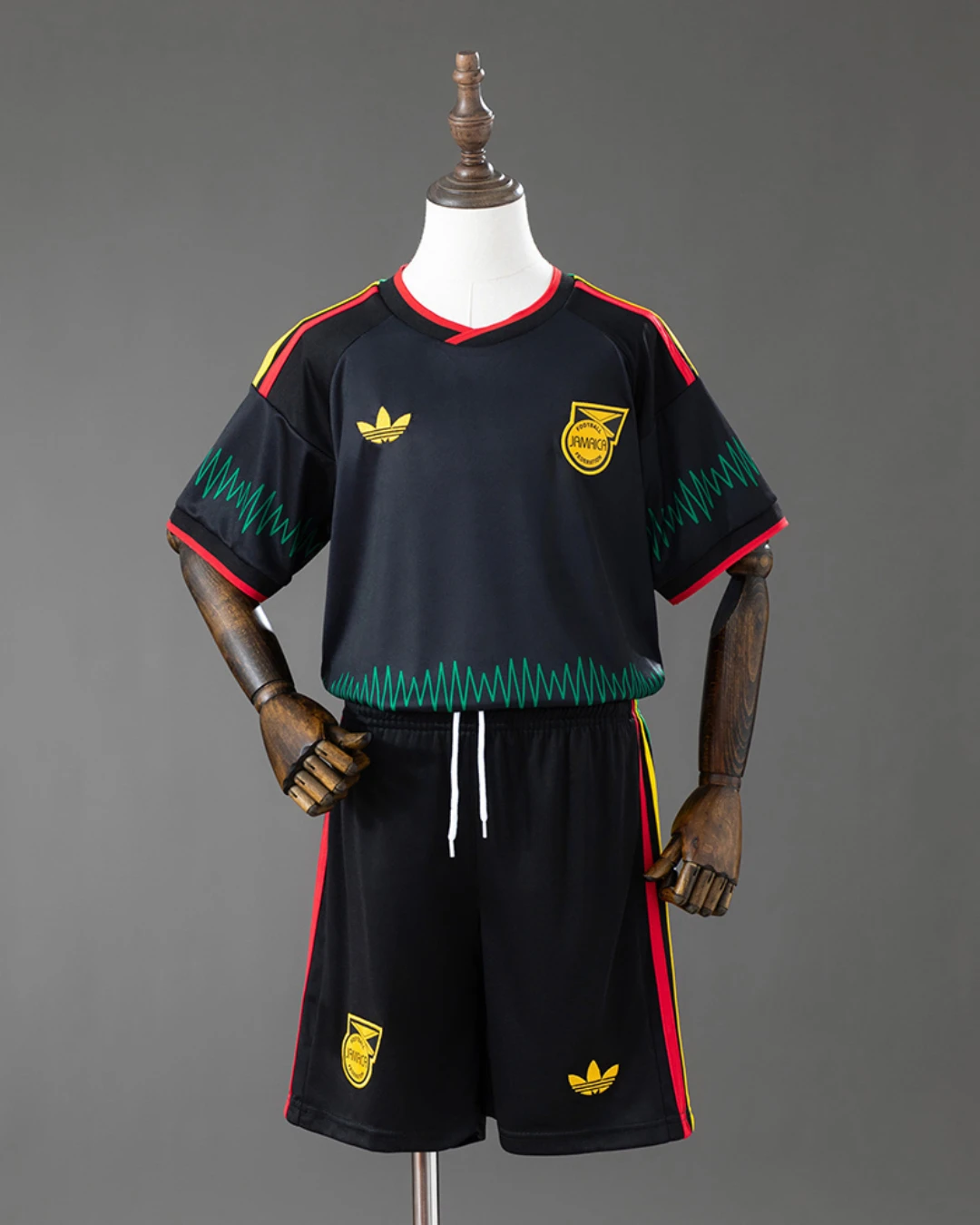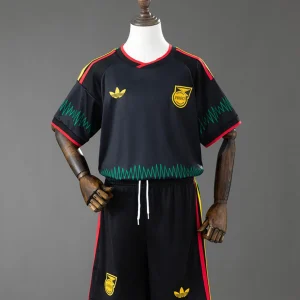 The Jamaica 26 x Bob Marley Kids Away jersey brings a bold black look to young fans, inspired by Bob Marley’s legacy and the vibrant energy of Jamaican football. It features striking red, gold, and green accents, soundwave-inspired graphics, and vinyl record details that celebrate Jamaica’s reggae culture in a modern away-kit design. Made for comfort on and off the pitch, this adidas kids jersey uses CLIMACOOL technology to help wick away sweat and keep children cool and dry during play.