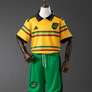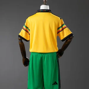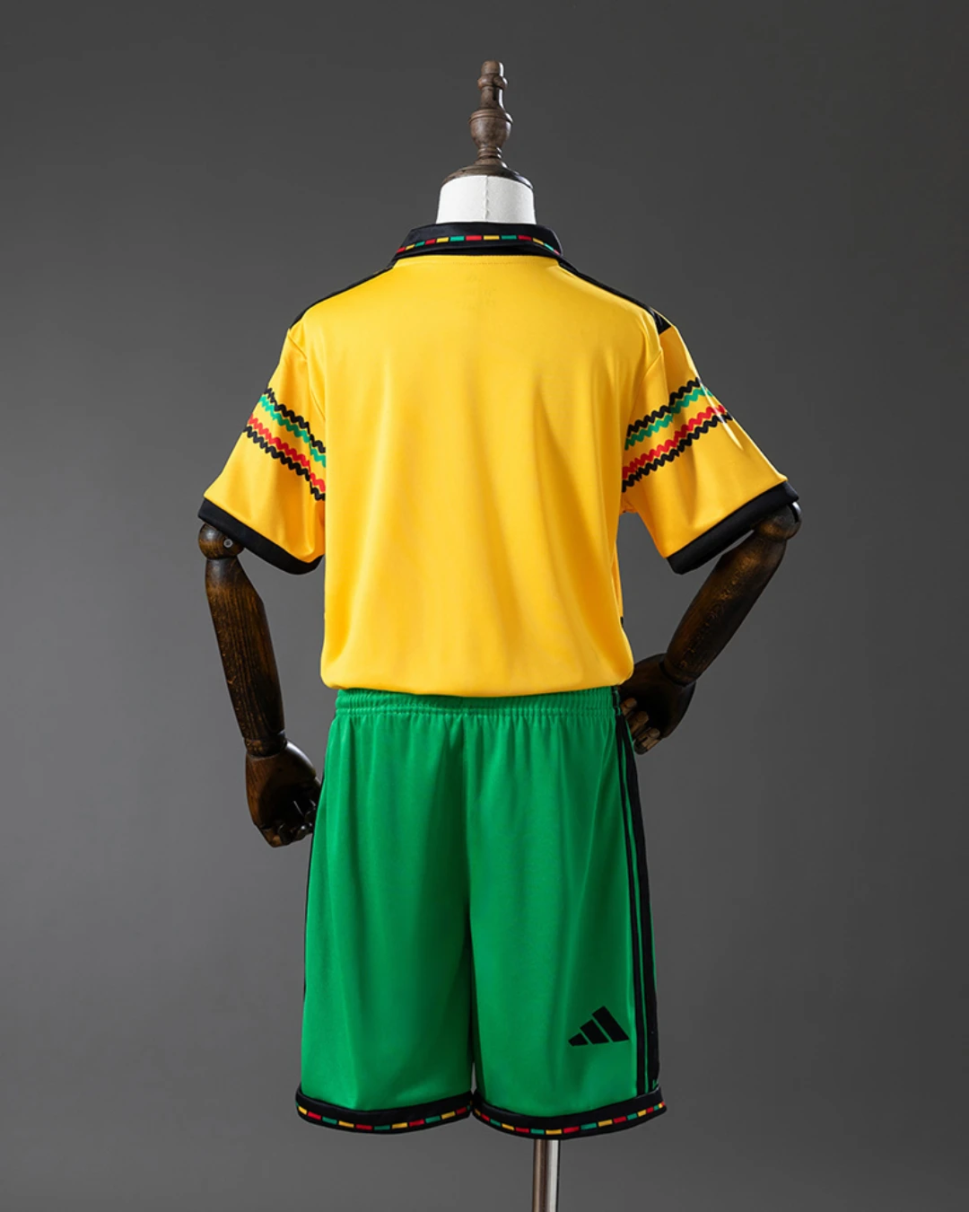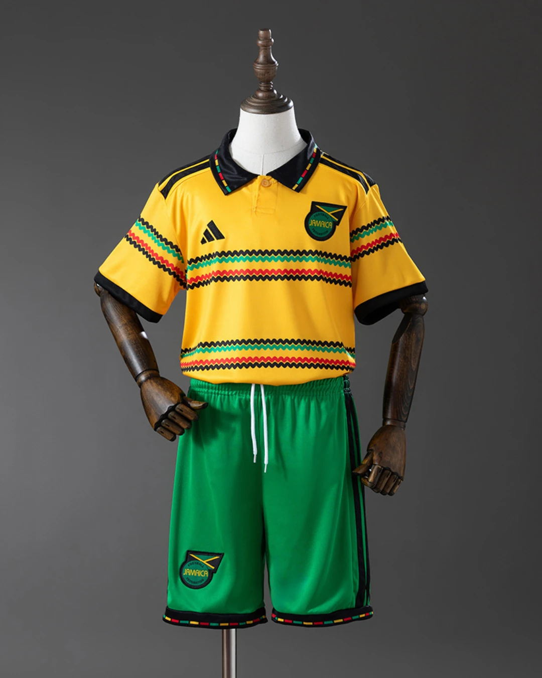 The Jamaica 26 x Bob Marley Kids Home jersey celebrates reggae culture and Jamaican football with a bold gold base, accented by vivid green, red, and black details inspired by Bob Marley’s legacy. The design includes an all-over woven pattern influenced by crocheted garments and Rasta headwear, giving the shirt a unique retro feel with modern national-team style. Built for young supporters, this adidas kids jersey uses Climacool technology for a cool, dry feel during play and everyday wear.