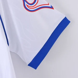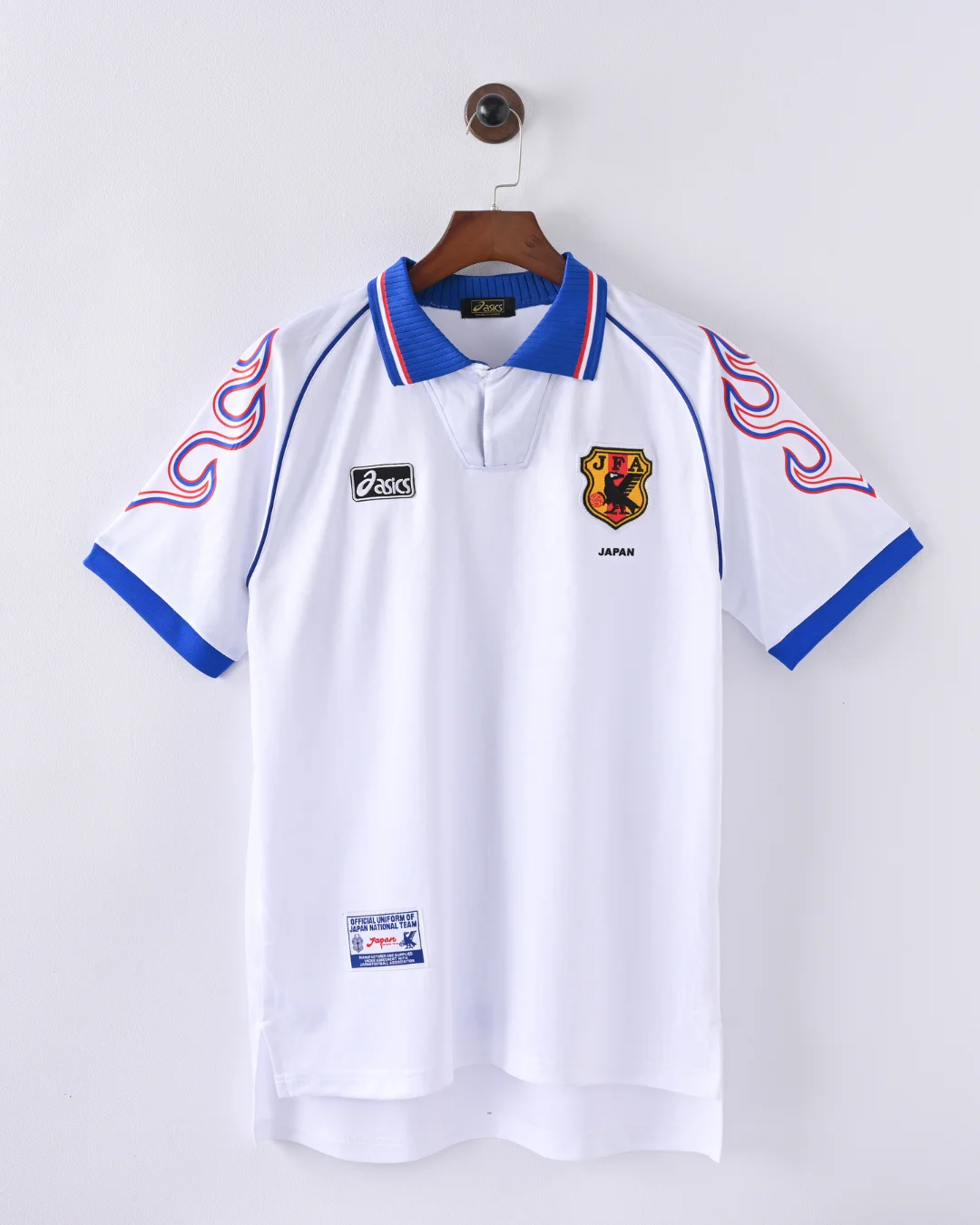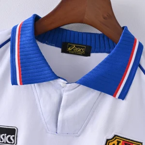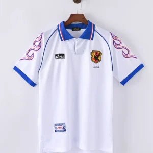 The Japan 1998 Away Jersey is a legendary retro football shirt that marks Japan’s historic debut at the FIFA World Cup in France. Designed by Asics, this iconic kit features a striking white base with bold blue and red flame-inspired patterns on the sleeves, symbolizing the fiery spirit of the Samurai Blue. This jersey is a must-have for collectors and fans celebrating Japan’s rise on the global football stage.