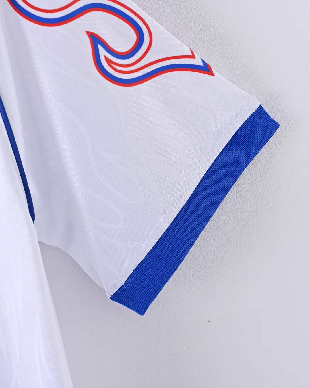 White base with distinctive blue and red flame patterns on sleeves