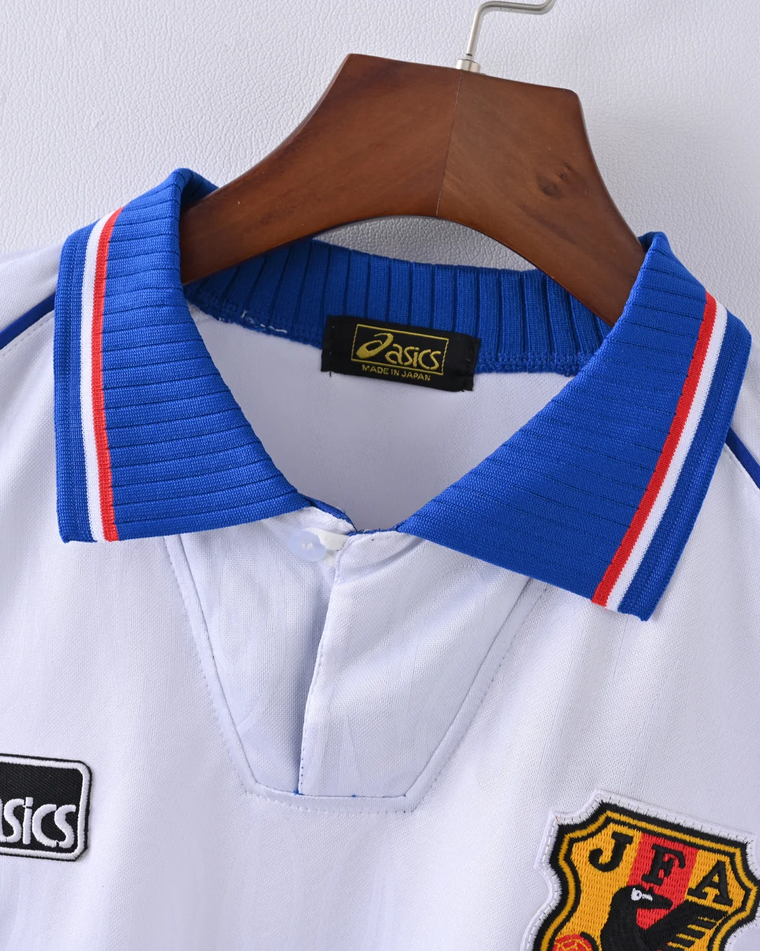 Embroidered Japan Football Association (JFA) crest and Asics logo