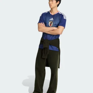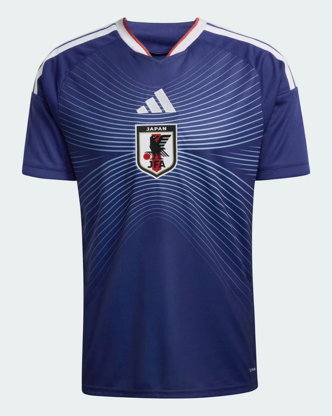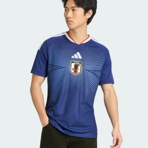 Power Samurai Blue’s global ambitions with the Japan 2026 WC Home Stadium Jersey from Adidas, symbolizing horizons beyond limits. Predominantly Japan Blue base evoking national identity, it features dynamic wave-like graphic patterns in ash blue linear details across the chest, representing the ocean-sky horizon haze and team ambition, complemented by modern crew neck collar with white and red trim, thicker white Adidas 3-Stripes on shoulders, stitched JFA crest, Adidas 3-Bar logo, Japanese flag at back neck, and breathable mesh ventilation panels debuted in Asian qualifiers.