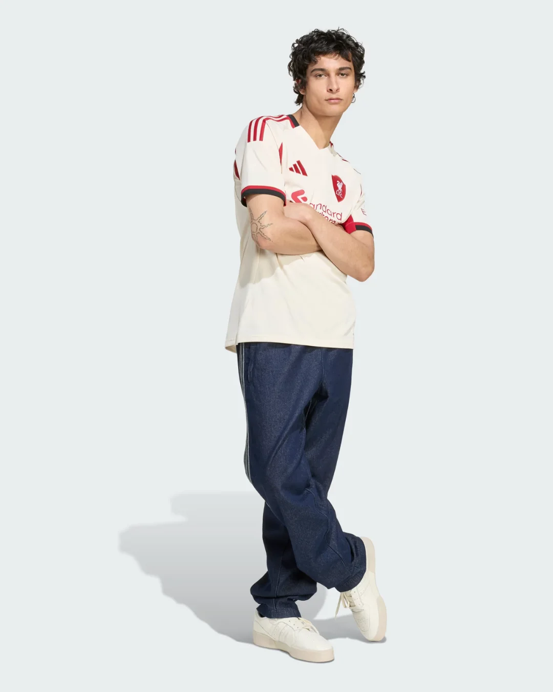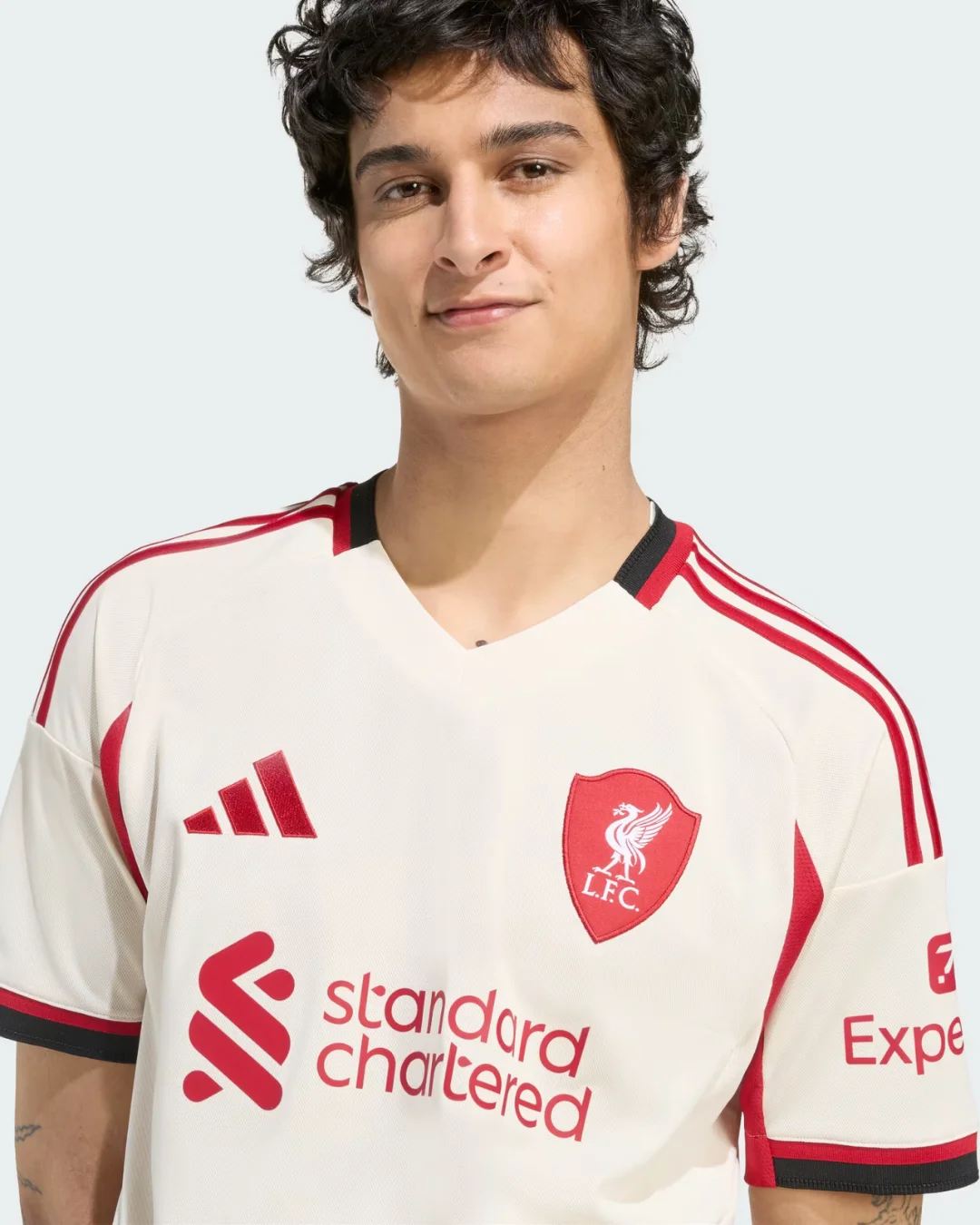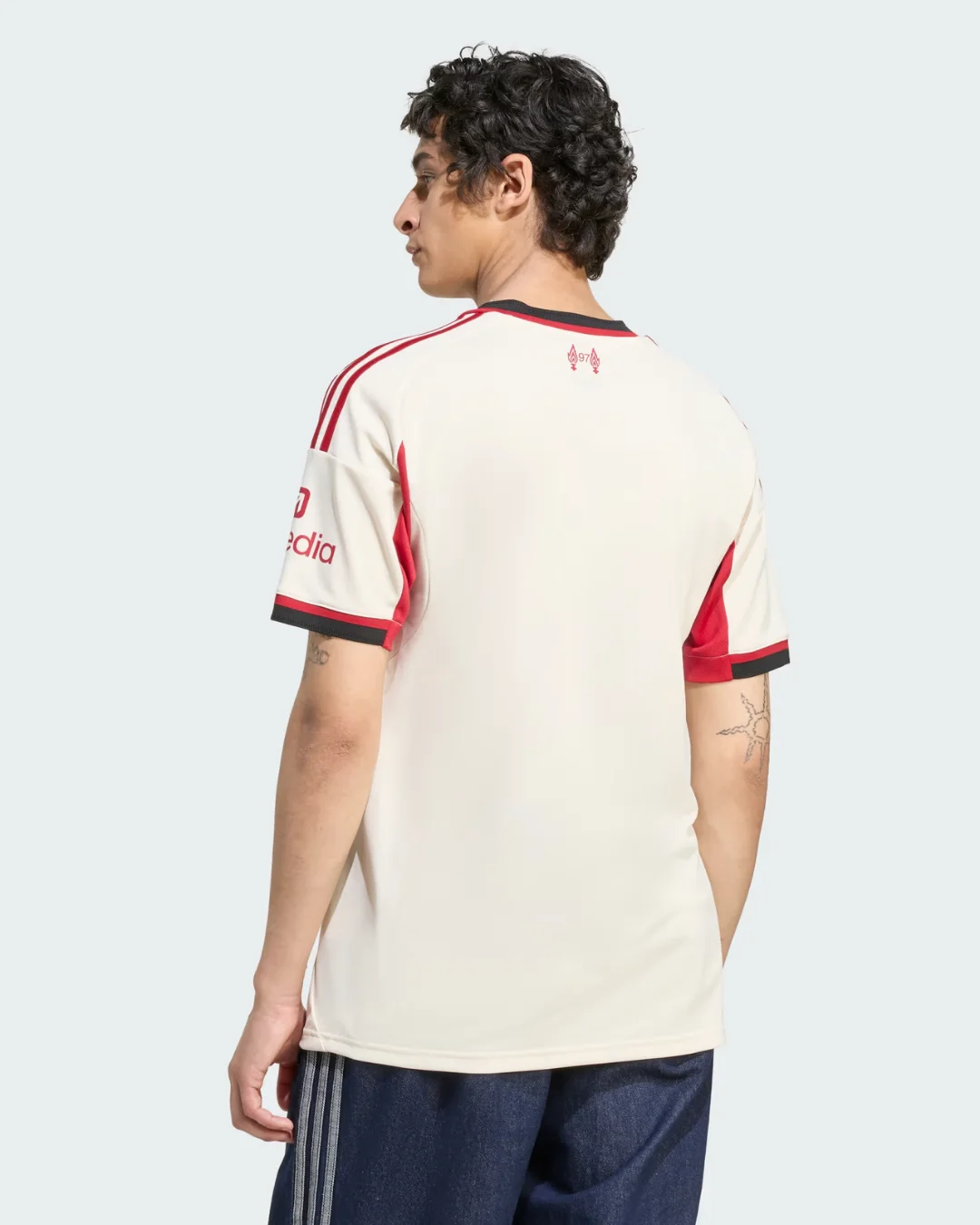 The Liverpool FC 2025/26 Away Stadium Jersey by adidas blends club tradition and modern comfort, designed for passionate fans globally. Drawing inspiration from Liverpool’s rich history, this jersey features a refined cream off-white base highlighted with black and red accents, evoking the classic away kits of Liverpool’s past.
