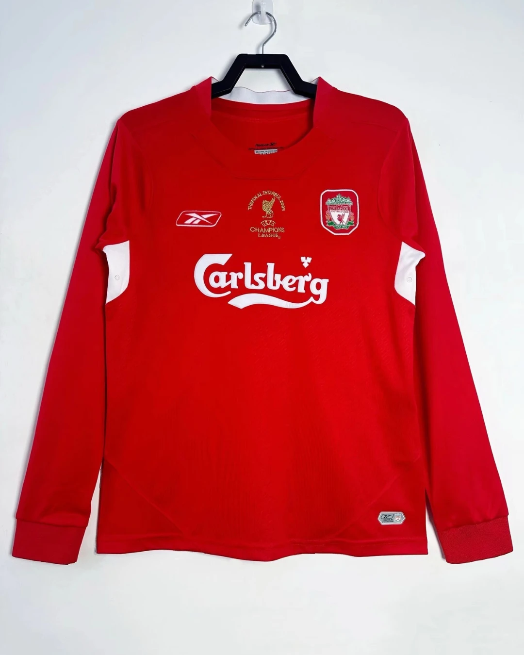 Liverpool FC’s legendary 2004/05 Long Sleeve Home Jersey from Reebok powered Rafael Benítez’s miraculous Champions League triumph in Istanbul, worn by Steven Gerrard, Jamie Carragher, Xabi Alonso, and Luis García during their epic 3-0 comeback against AC Milan. The iconic red base features crew neck collar, embroidered Liverbird crest on left chest, Reebok logo opposite, and prominent Carlsberg sponsor across the front, classic design embodying “You’ll Never Walk Alone” spirit through the greatest final turnaround in modern football.