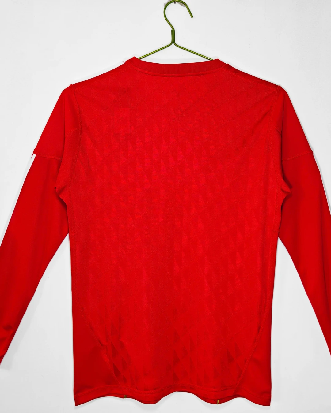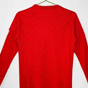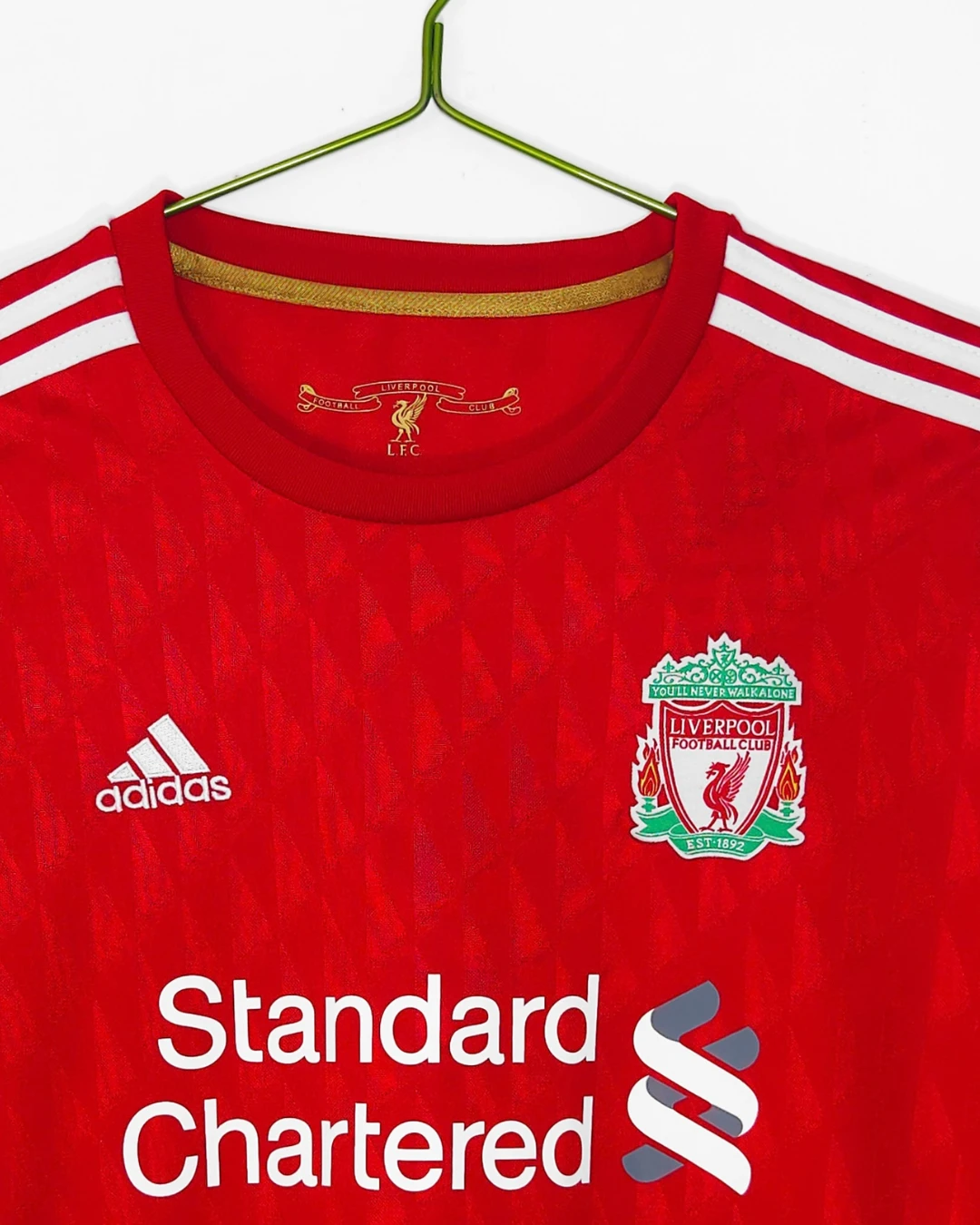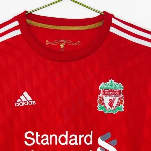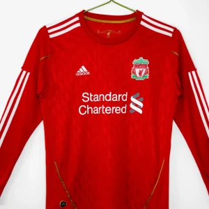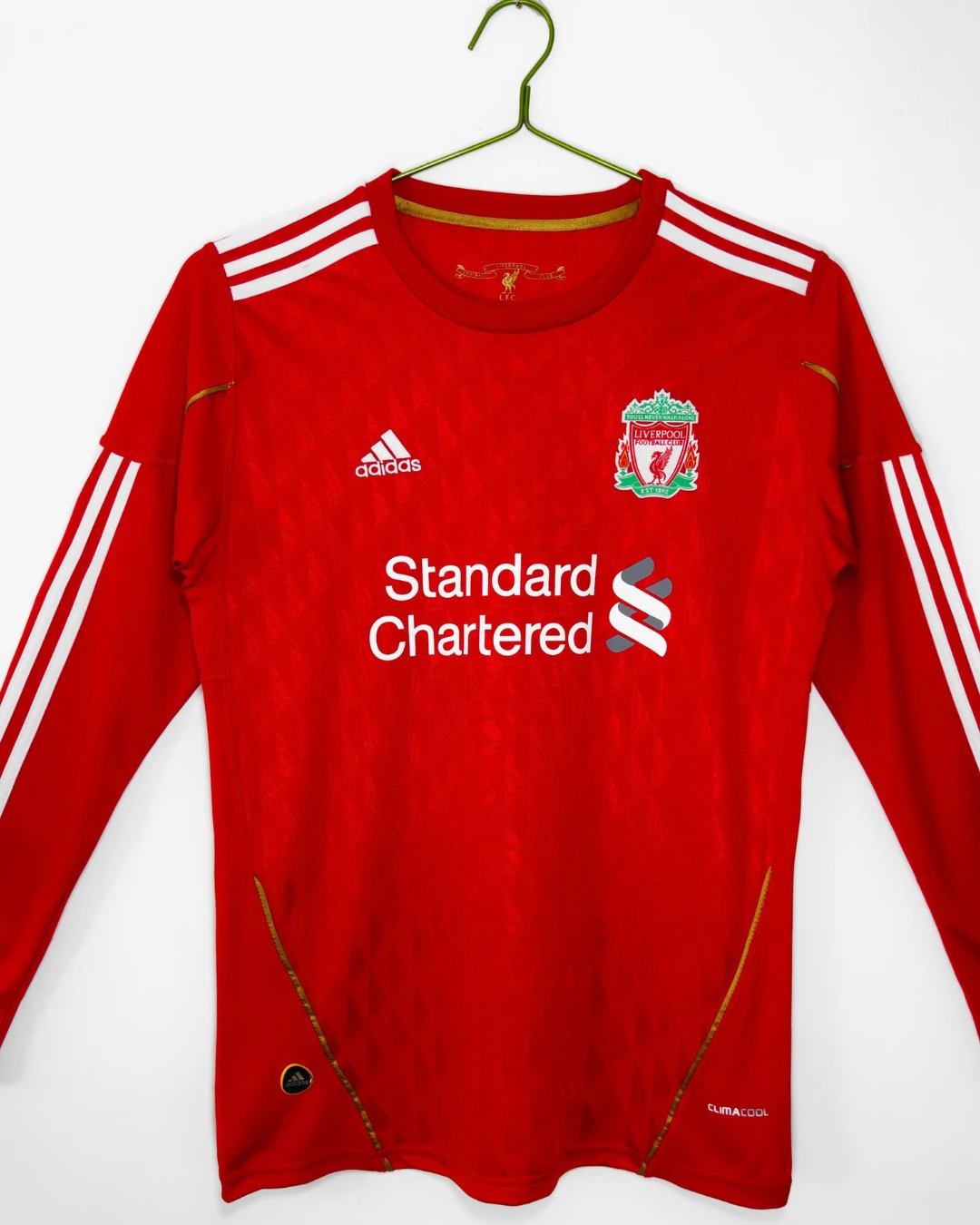 Liverpool’s 2010/11 Home Jersey – Long Sleeve from Adidas marked a transitional Premier League season under new ownership, featuring the iconic bright red base with subtle tone-on-tone diamond jacquard pattern inspired by the 1989/90 championship kit worn by Barnes, Beardsley, and Rush, classic crew-neck collar, debut Standard Chartered sponsor in white replacing Carlsberg after 18 years, ClimaCool breathable fabric with metallic gold side piping symbolizing their 5 European Cups, worn during their Europa League campaign. Perfect for young Reds fans, this long-sleeve retro replica uses thick yet breathable 100% polyester construction with embroidered textured Liverbird crest on left chest, white Adidas 3-stripes on shoulders, ribbed long cuffs for secure fit and regular relaxed fit.