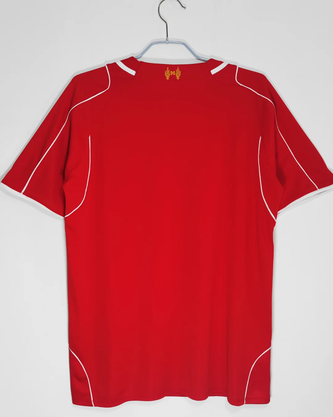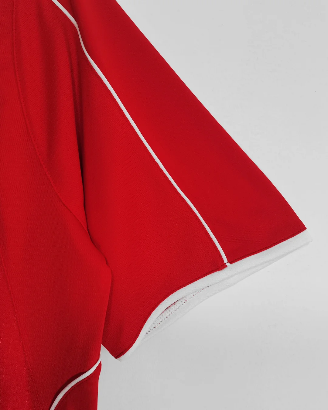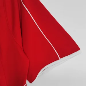 Classic red color with subtle white piping accents on sleeves and collar for a clean look
