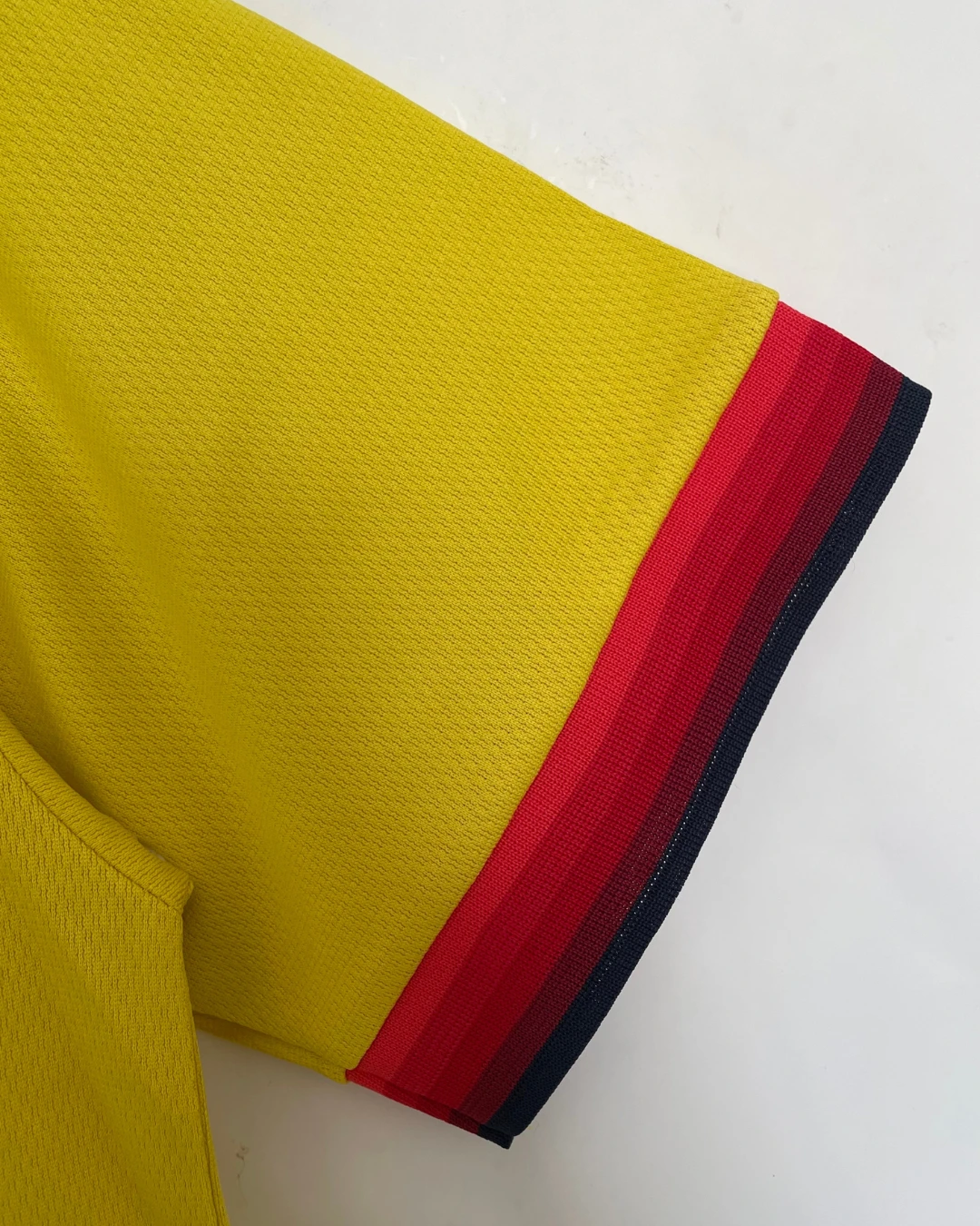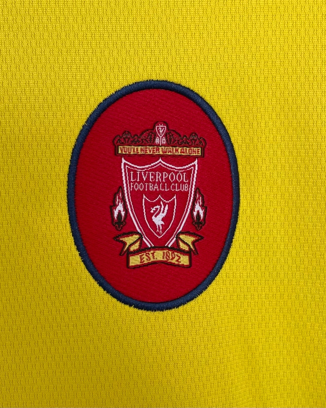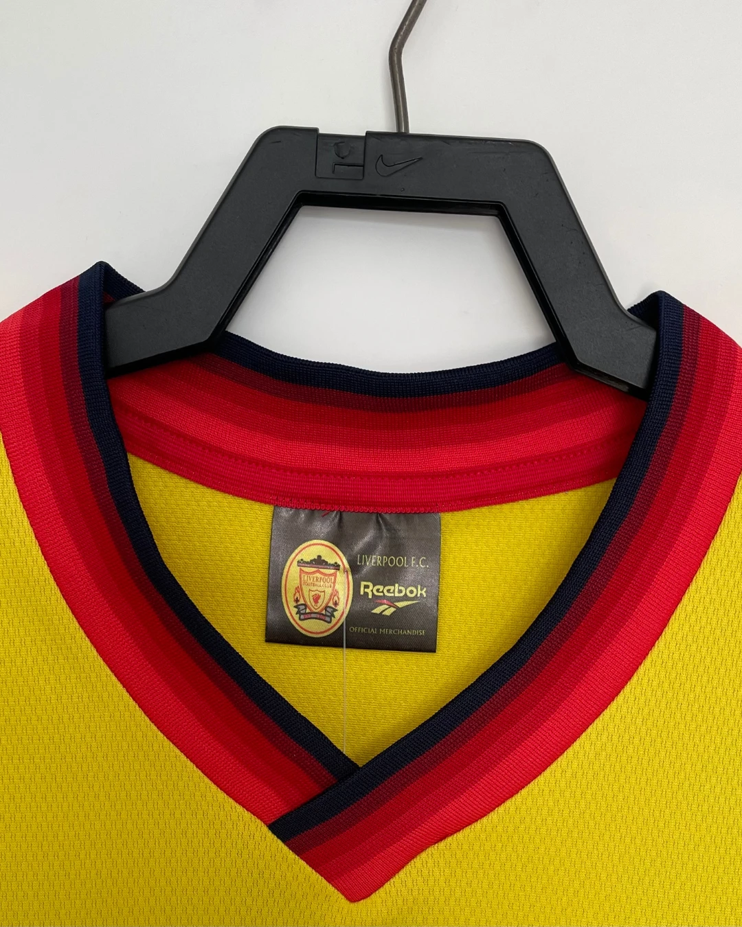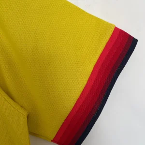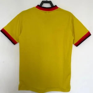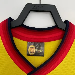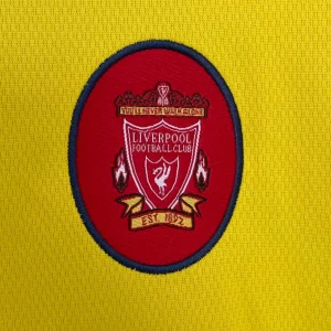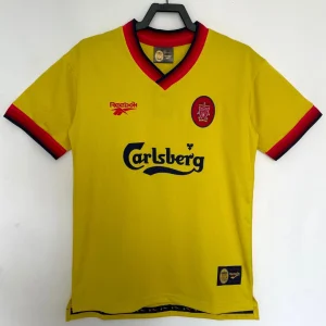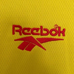 Liverpool FC 1997/98 Away Jersey from Reebok marked Roy Evans’ final full season at Anfield, finishing third in the Premier League while worn by breakthrough stars Michael Owen, Robbie Fowler, Jamie Carragher, and Steve McManaman during their title challenge against Arsenal and Manchester United. The iconic bright yellow base with red and black accents features the embroidered club crest on the left chest, Reebok logo opposite, V-neck collar with black and red ribbed trim, and prominent “Carlsberg” sponsor, quintessential late-90s vibrancy launching the Owen era.