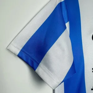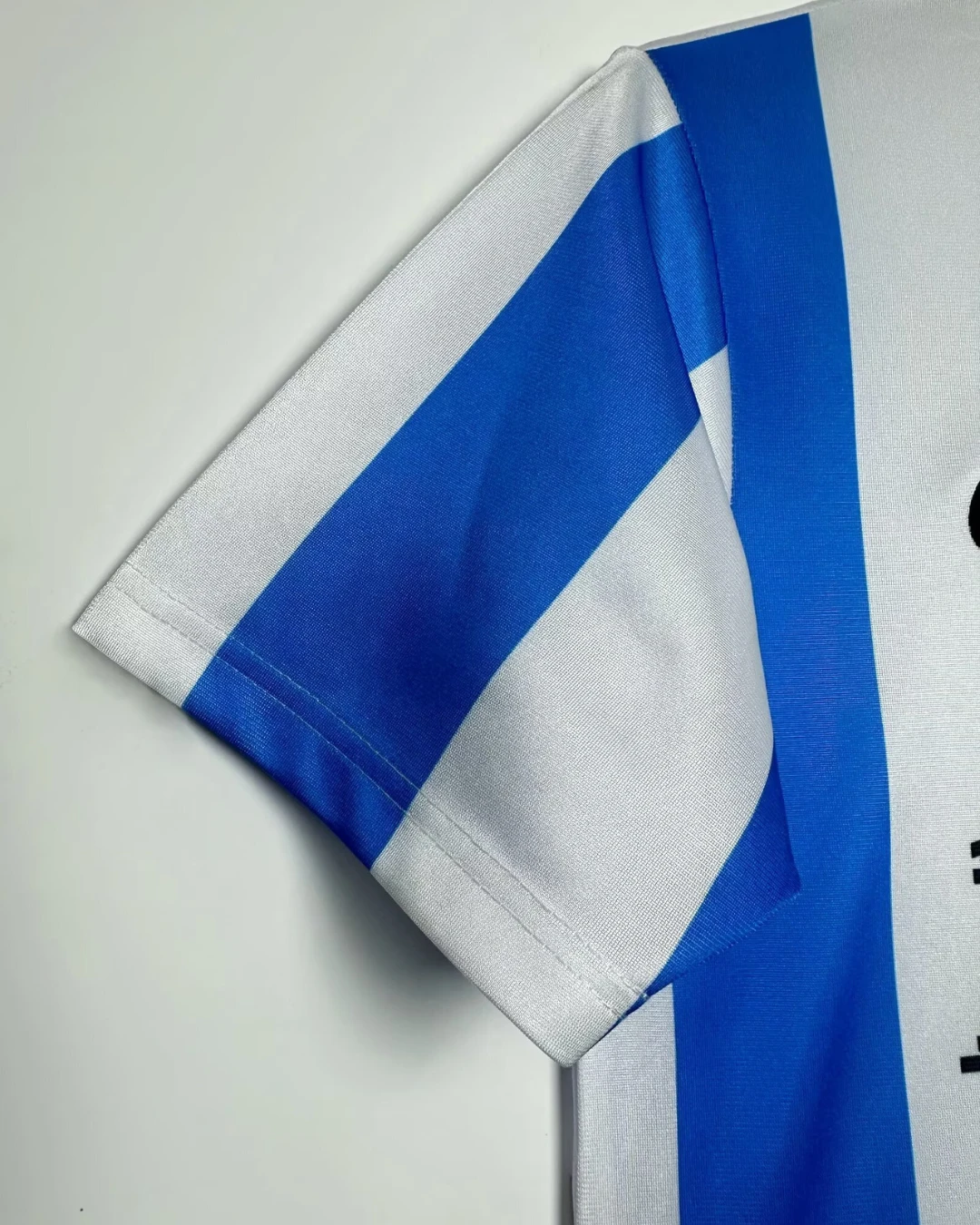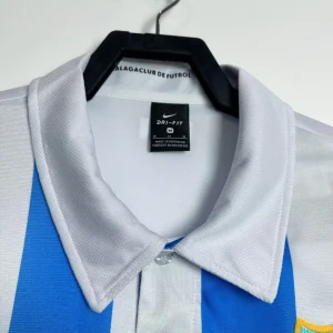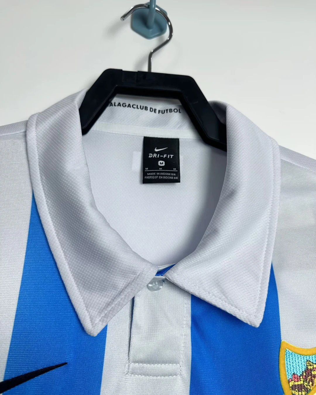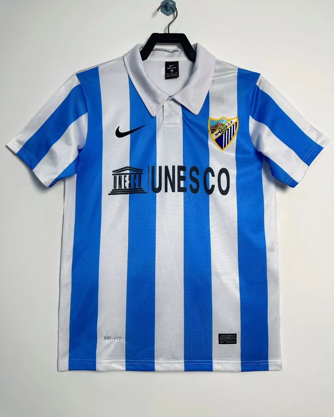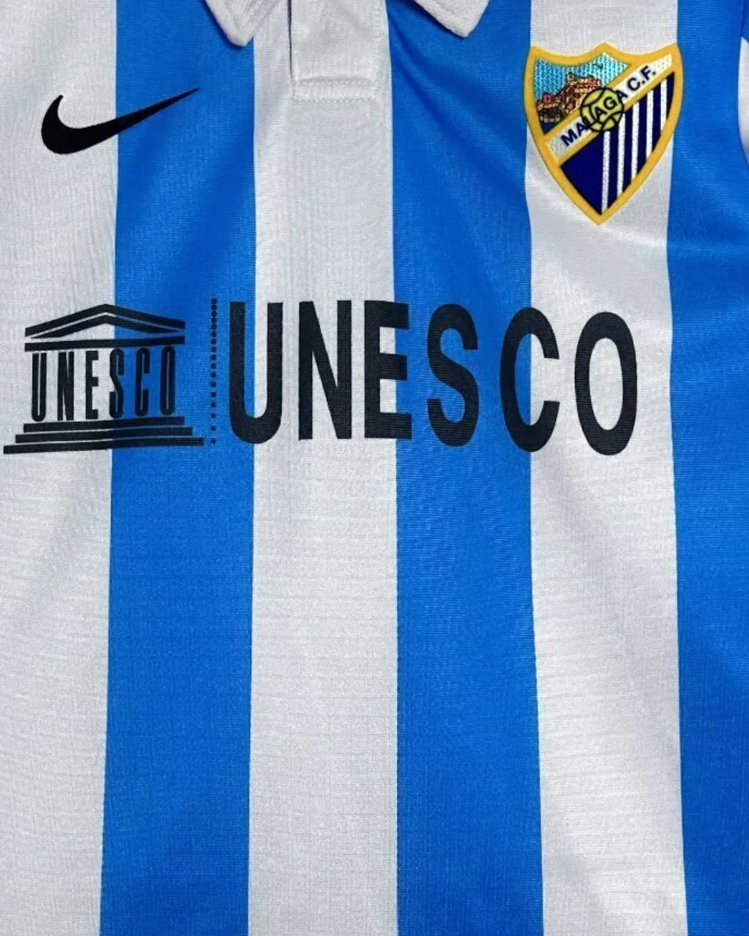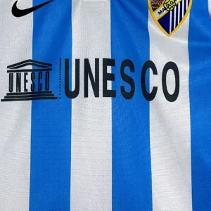 Málaga CF’s 2012/13 Home Jersey from Nike powered their unforgettable Champions League quarterfinal run under Manuel Pellegrini at La Rosaleda, worn by Isco, Joaquín, Roque Santa Cruz, and Willy Caballero during dramatic victories over Porto, AC Milan, and Zenit. The classic sky blue and white vertical stripes feature a crisp white polo collar with button placket, black embroidered Nike Swoosh on right chest, UNESCO sponsor prominently printed in black across center, and Málaga CF crest over the heart, elegant design celebrating Andalusian heritage during their European golden era.
