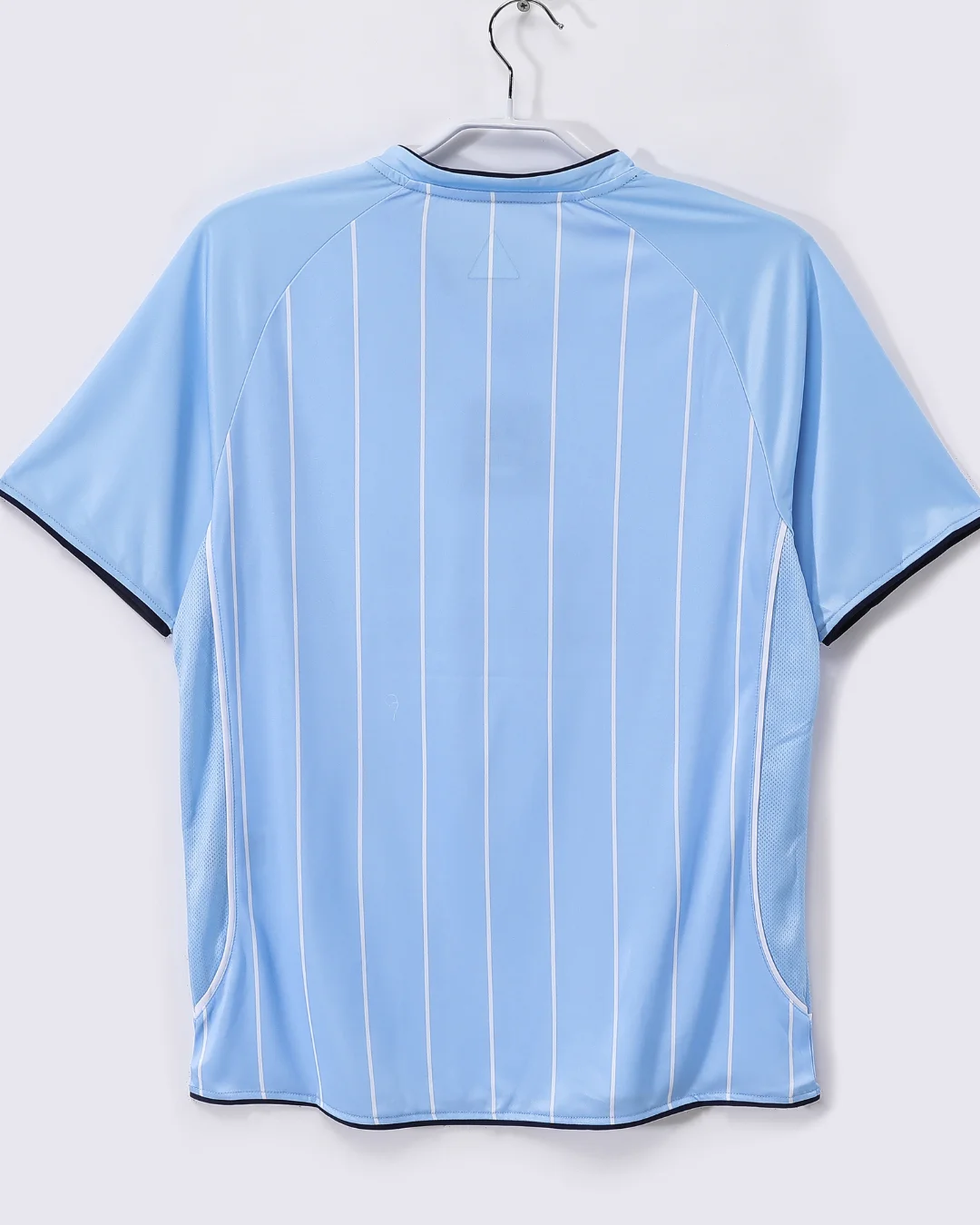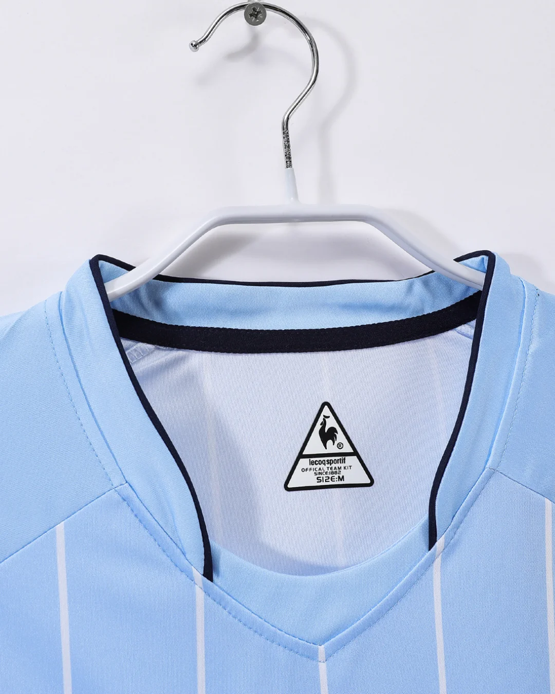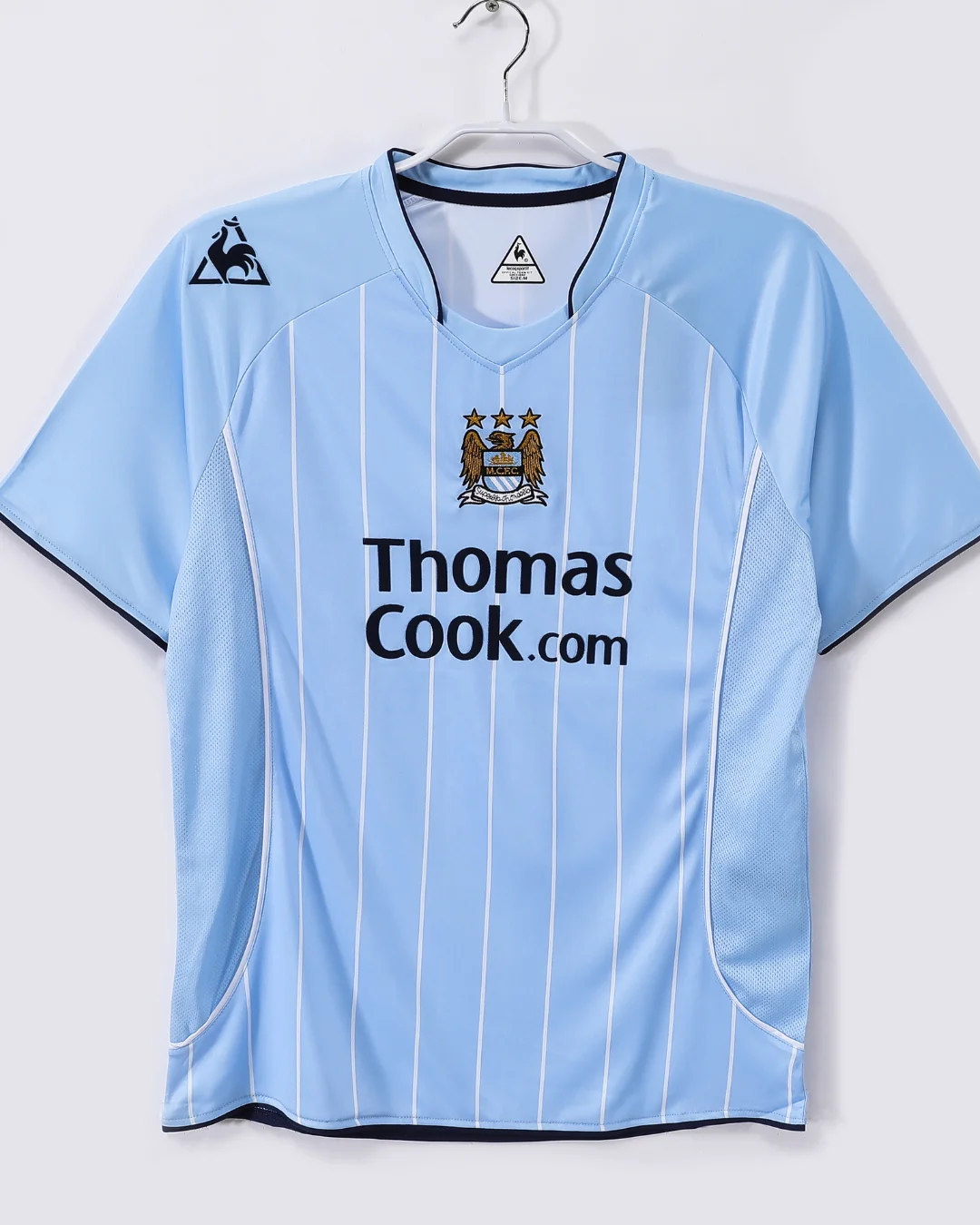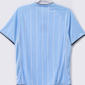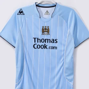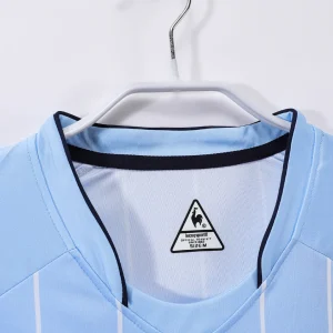 Celebrate the spirit and style of Manchester City’s 2007/08 season with this official home jersey, a design created by Le Coq Sportif that marks a distinctive era in the club’s history. Featuring the club’s traditional sky blue color, the jersey is accented with subtle navy details on the sponsorship logos and white pinstripes, a first in the club’s history, adding a unique touch to this classic design.