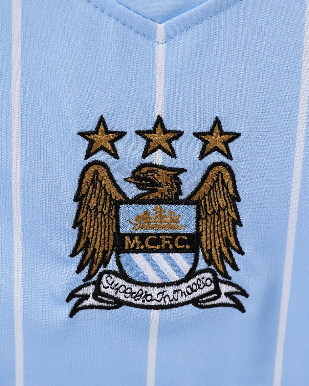Embroidered Manchester City crest and Le Coq Sportif logo