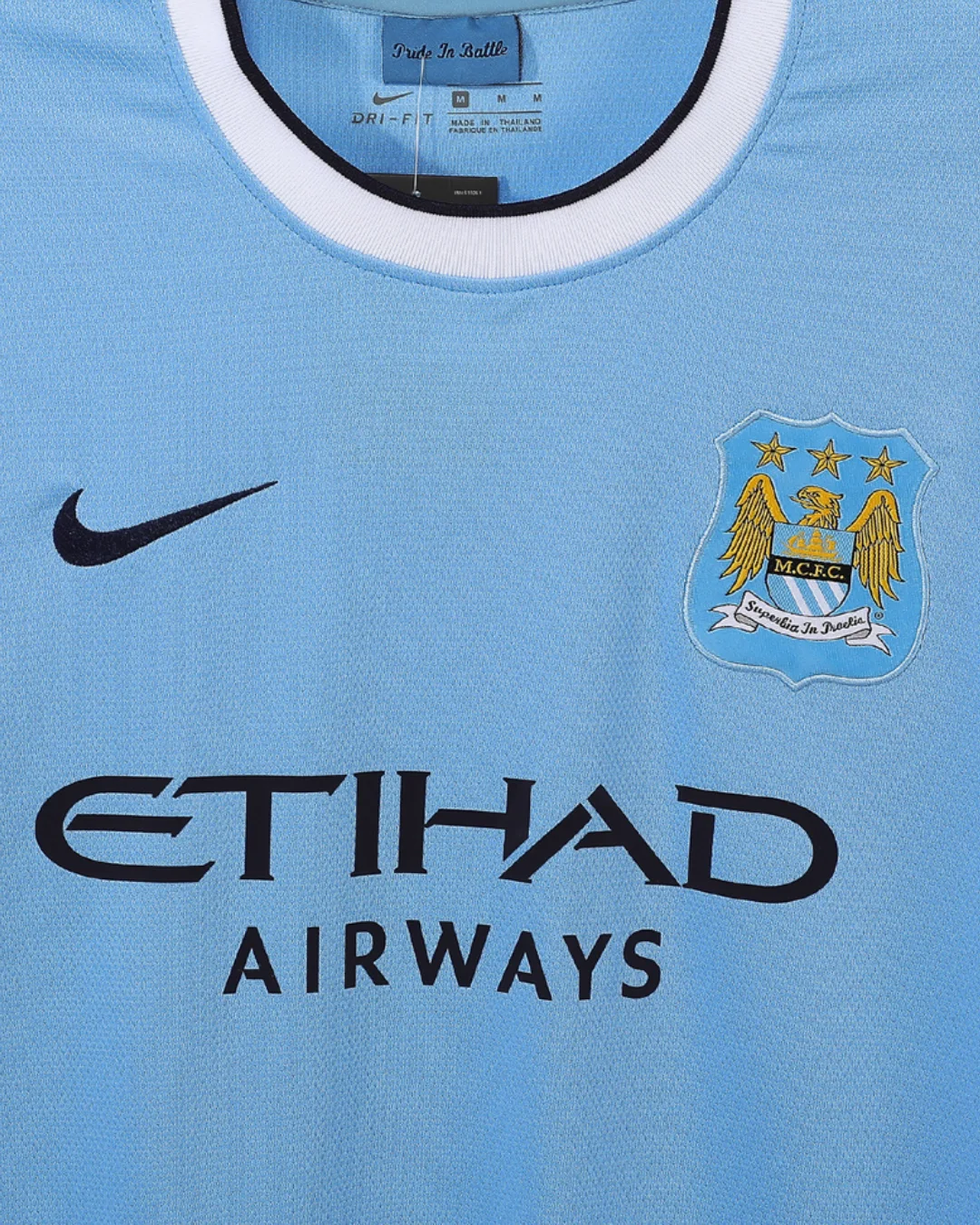Embroidered Manchester City crest, Nike swoosh, and Etihad Airways sponsor logo