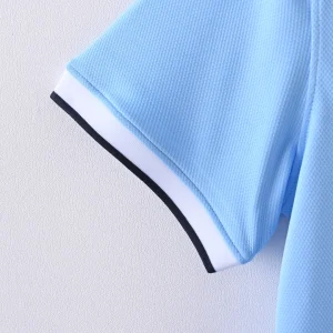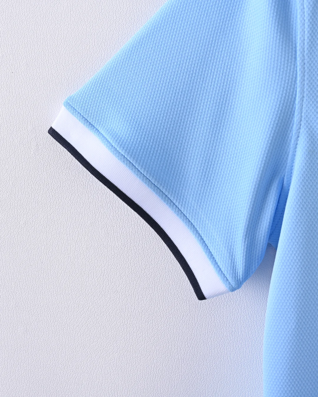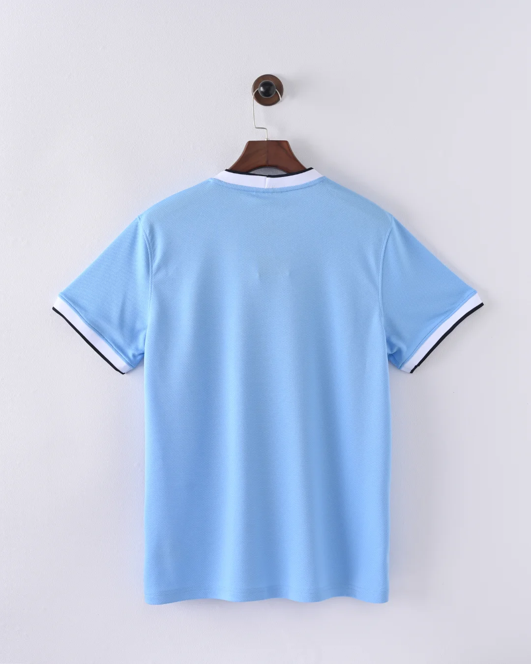 Iconic sky blue base with white crew neck and cuffs, navy trim