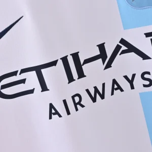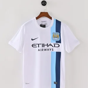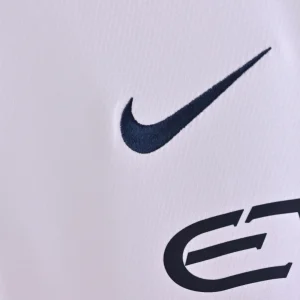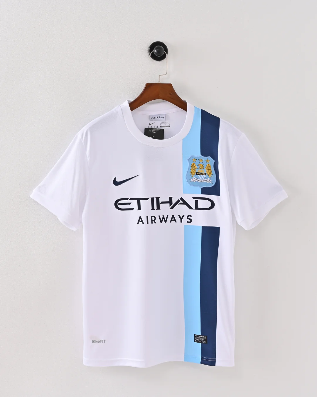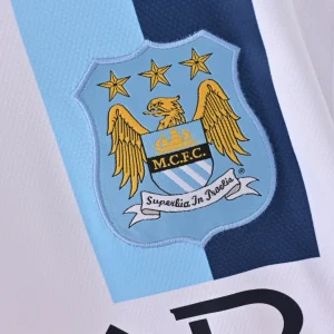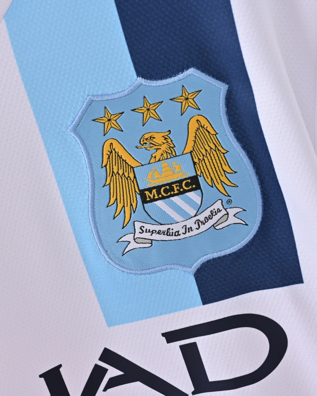 Unveil a bold new look with the Manchester City 13/14 Third Jersey, an instantly recognizable kit introduced for the 2013/14 season as the club’s alternative choice for cup competitions and away matches. This jersey features a striking white base with navy blue and light blue stripes cascading down the left side in a modern interpretation of the traditional sash design, giving the shirt a fresh yet classic vibe.