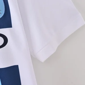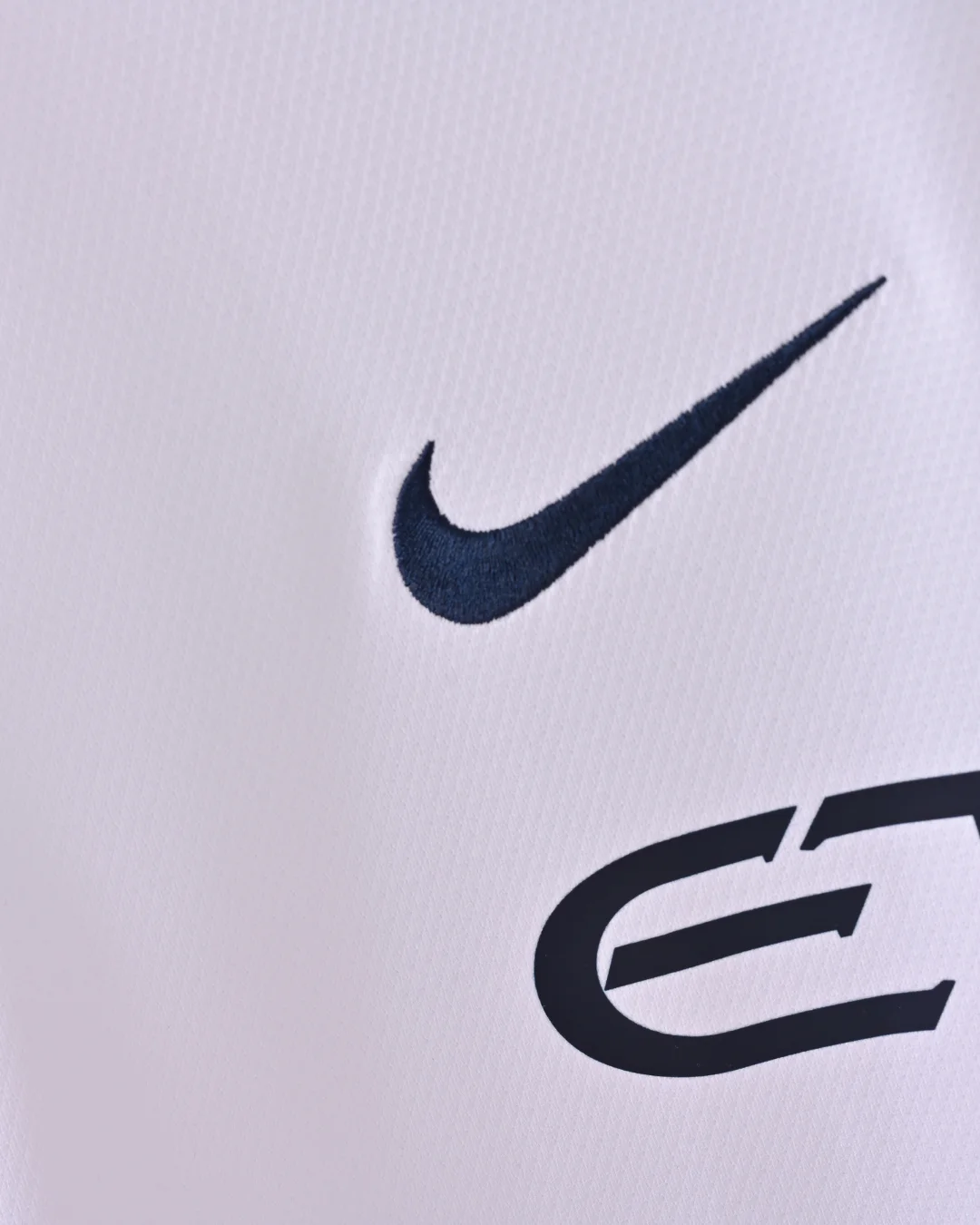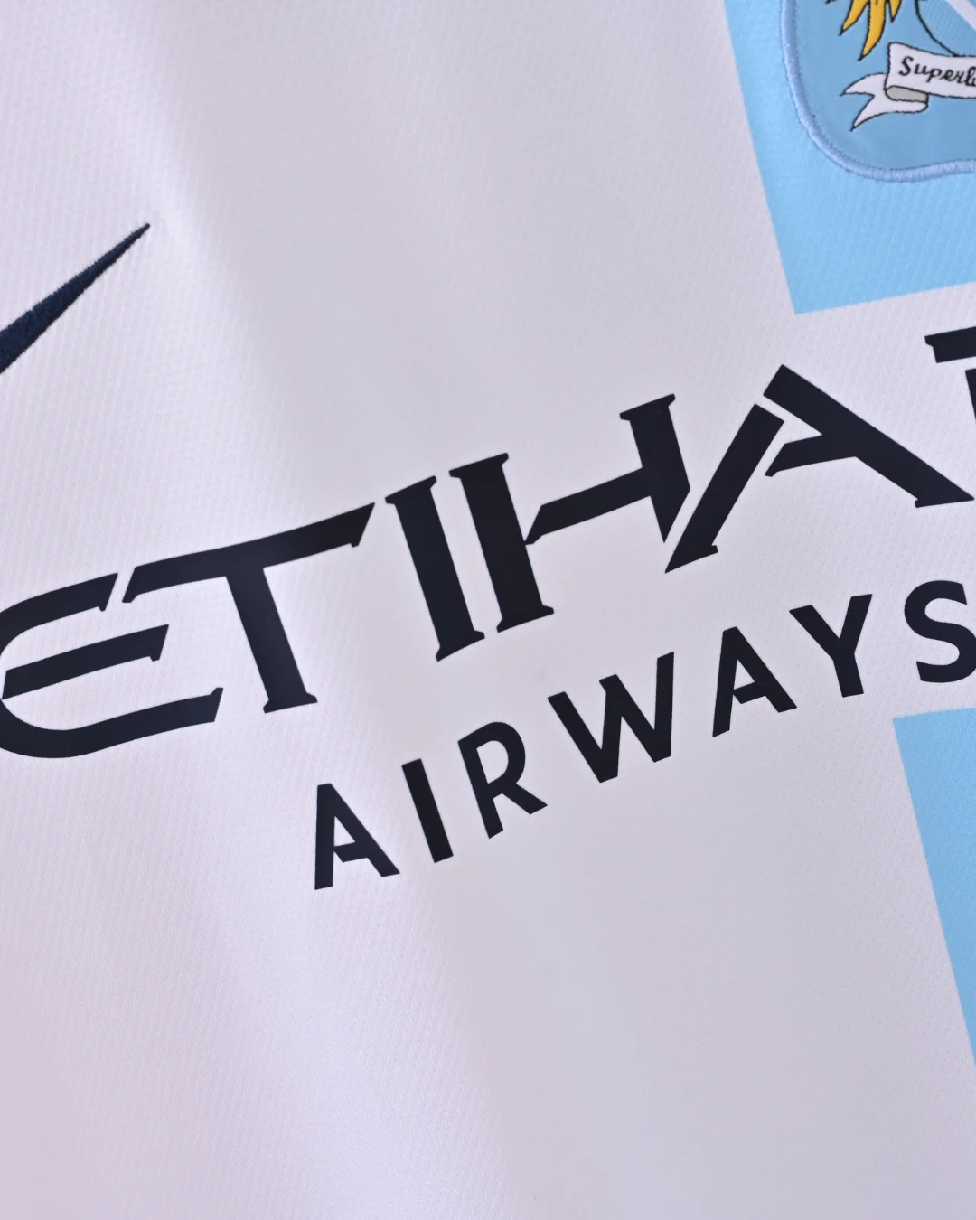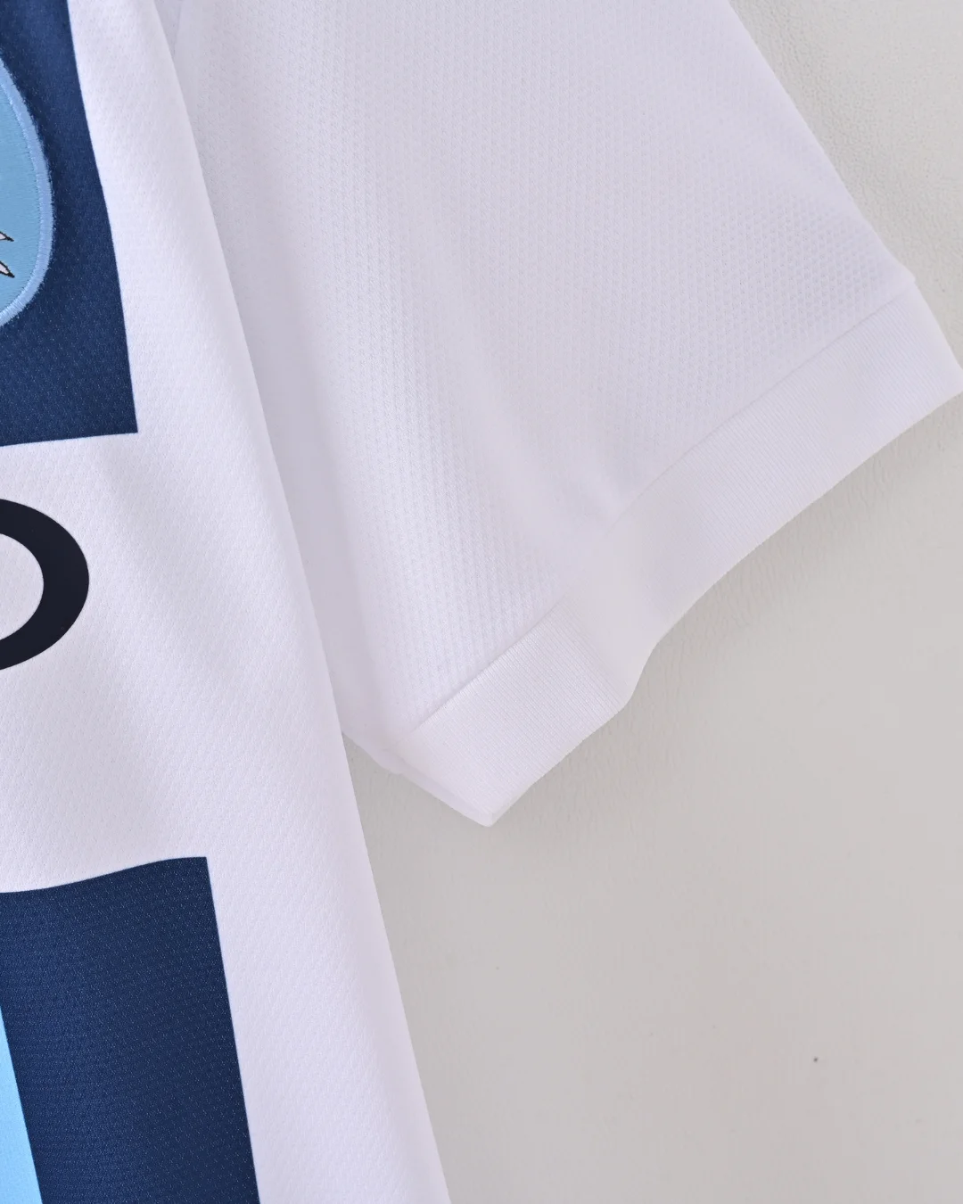 Unveil a bold new look with the Manchester City 13/14 Third Jersey, an instantly recognizable kit introduced for the 2013/14 season as the club’s alternative choice for cup competitions and away matches. This jersey features a striking white base with navy blue and light blue stripes cascading down the left side in a modern interpretation of the traditional sash design, giving the shirt a fresh yet classic vibe.