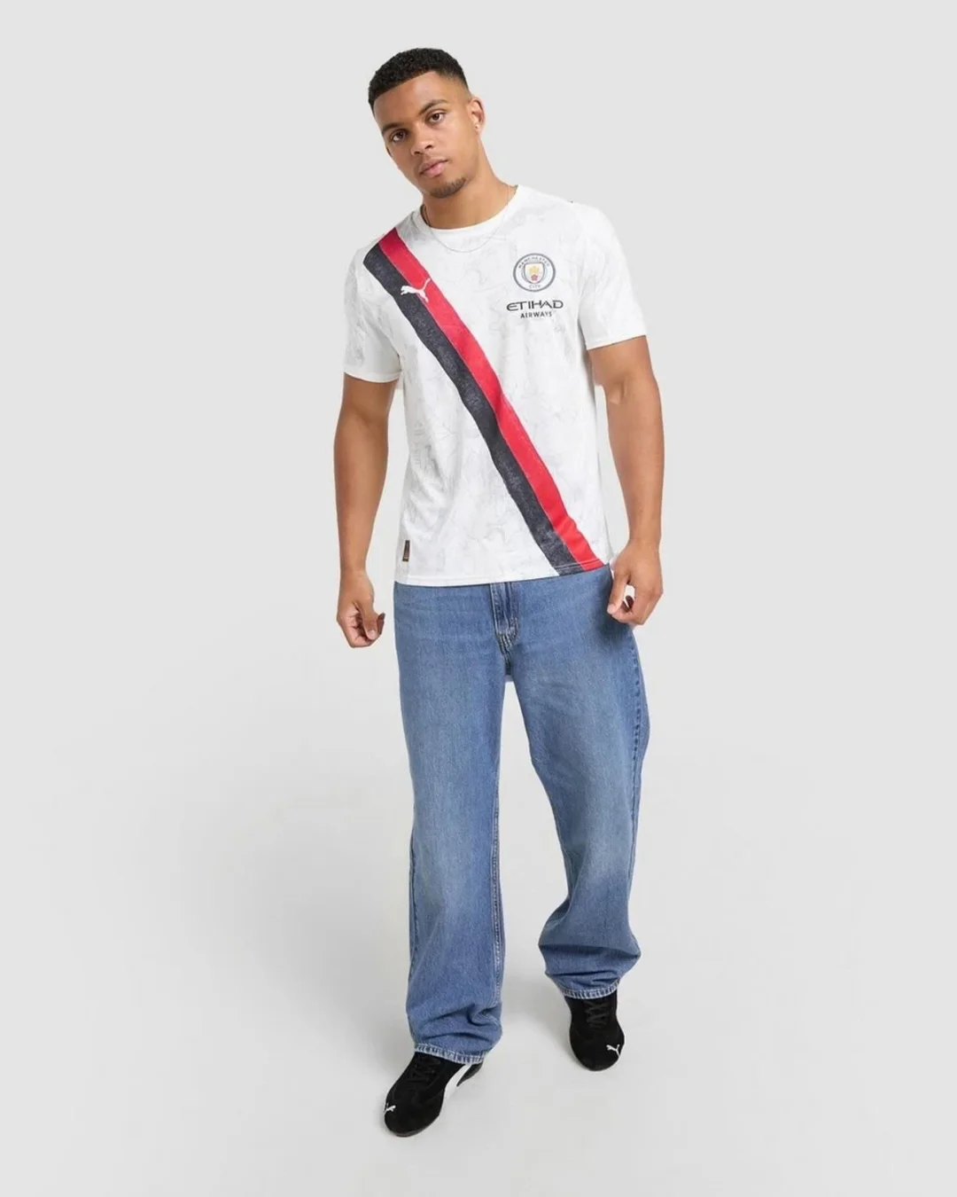 Celebrate Manchester City’s historic participation in the 2025 FIFA Club World Cup with the exclusive Home Stadium Jersey, designed by Puma in collaboration with New York streetwear label KidSuper. This special edition kit features a predominantly white base adorned with a striking dual-tone red and black sash running diagonally across the chest, a bold nod to the club’s iconic 2009-11 third shirt. The sash’s hand-drawn, felt-tip pen style adds a unique artistic flair, making this jersey stand out as a true collector’s piece.
