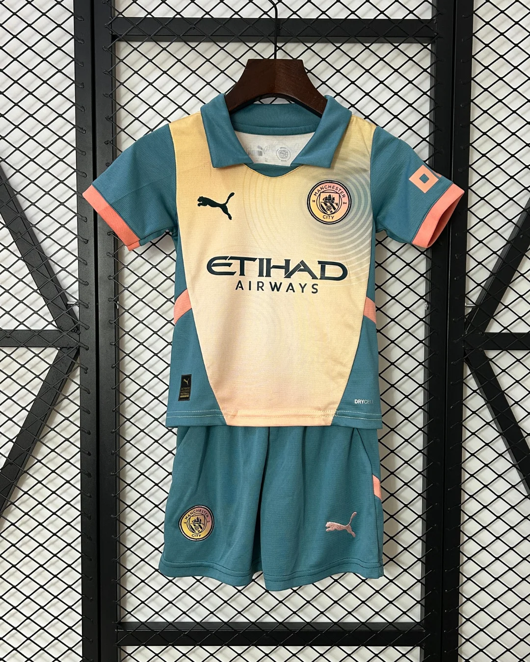 The Manchester City Kids 24/25 Fourth Kit by Puma is a special edition kit designed for the junior fans of Manchester City, celebrating the club’s iconic identity with a fresh and bold look. This kit is commonly referred to as the “Definitely City” kit, inspired by Manchester City’s vibrant fan culture and local pride. Although detailed specific design elements for the fourth kit in kids’ sizes are relatively rare, it typically features the club’s sky blue color palette or complementary tones with Puma’s advanced fabric technology, offering lightweight, breathable comfort and moisture-wicking performance ideal for active kids.