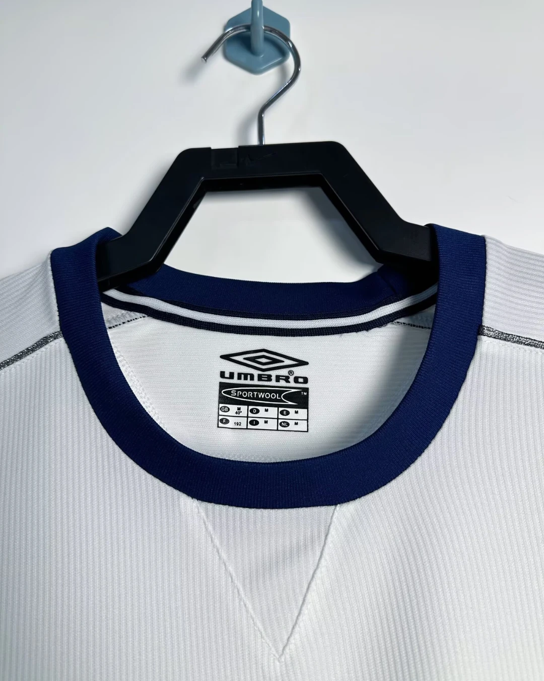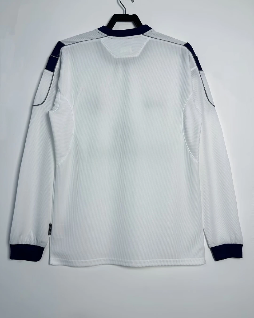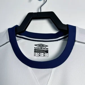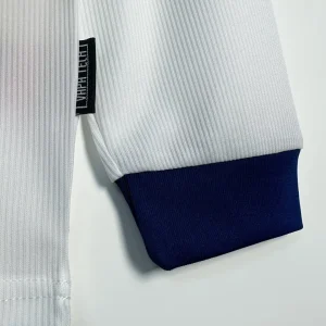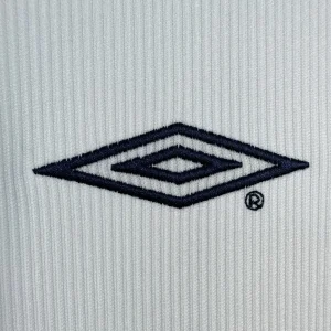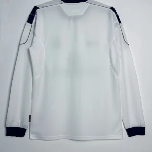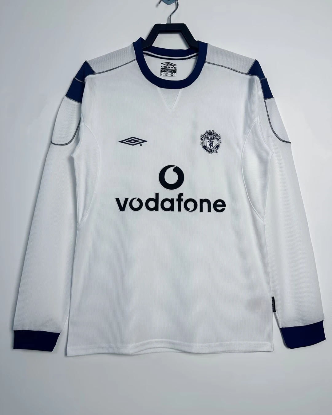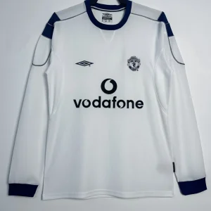 Manchester United’s 2000/01 Long Sleeve Away Jersey from Umbro powered Sir Alex Ferguson’s third straight Premier League title triumph, worn by Roy Keane, David Beckham, and Paul Scholes during Champions League campaigns and crucial winter fixtures at Old Trafford. The clean white base features subtle shadow pinstripe texture, navy crew neck collar, double diamond Umbro logo on right chest, embroidered Red Devil crest opposite, and prominent “Vodafone” sponsor in navy, minimalist design blending elegance with Y2K performance innovation.