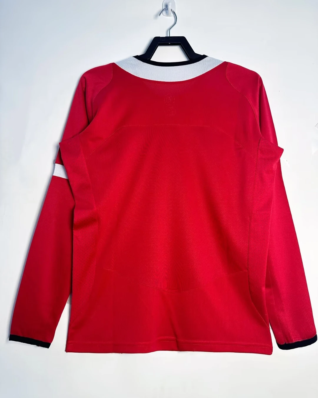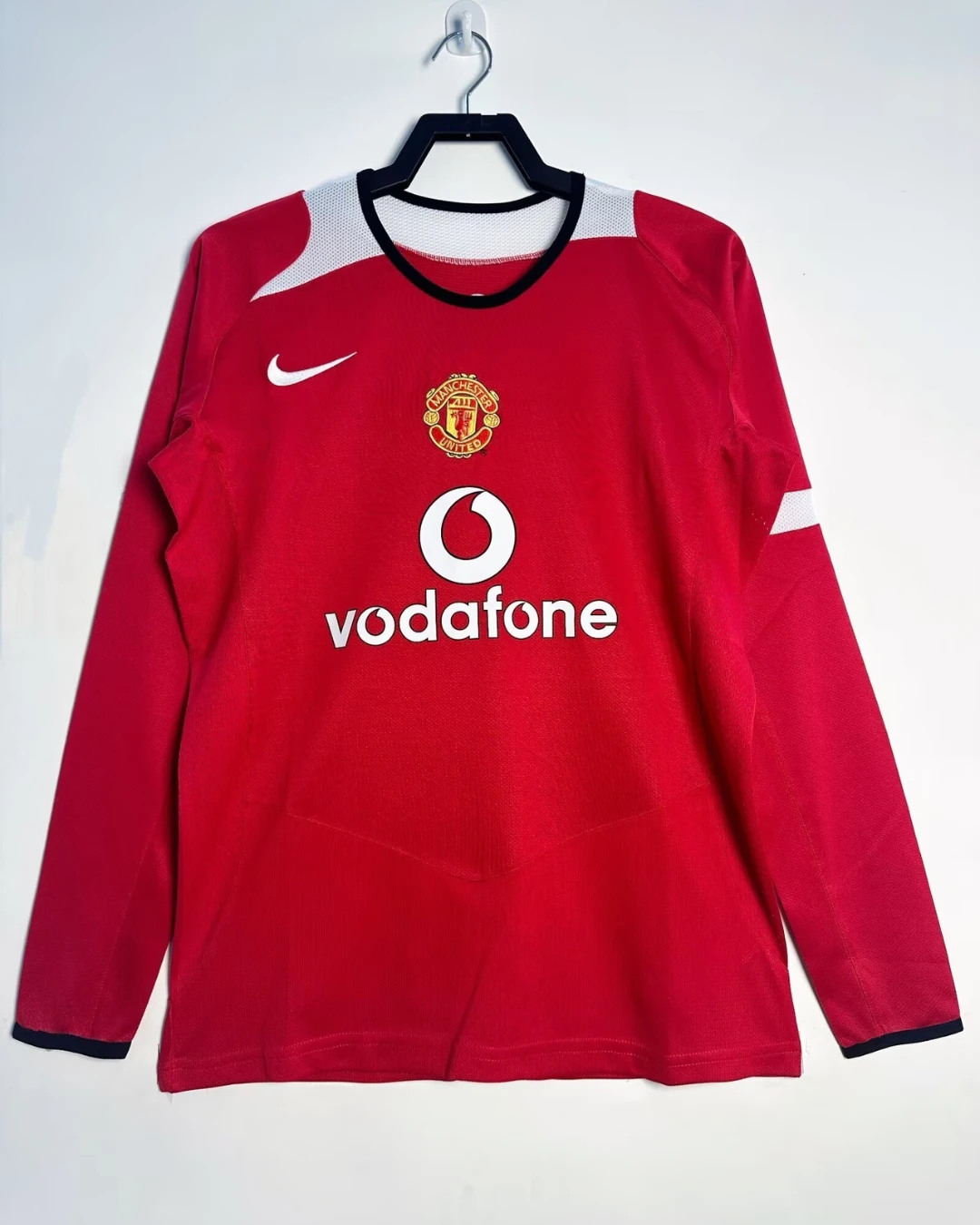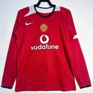 Manchester United’s iconic 2004-06 Long Sleeve Home Jersey from Nike defined Sir Alex Ferguson’s Premier League dominance, winning the 2005/06 title and League Cup while featuring Cristiano Ronaldo’s breakthrough alongside Wayne Rooney, Ruud van Nistelrooy, Paul Scholes, and Ryan Giggs during their Old Trafford dynasty. The classic bright red base with white sleeve panels and black crew neck collar showcases embroidered club crest on the center, prominent Vodafone sponsor centered across the chest, and Nike swoosh on the left, timeless Red Devils design blending tradition with mid-2000s precision engineering.