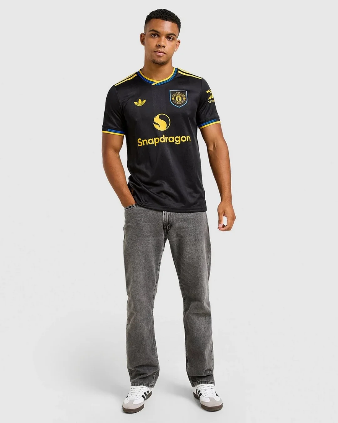 Heat-applied modern black-and-yellow shield crest and classic adidas Trefoil on the chest