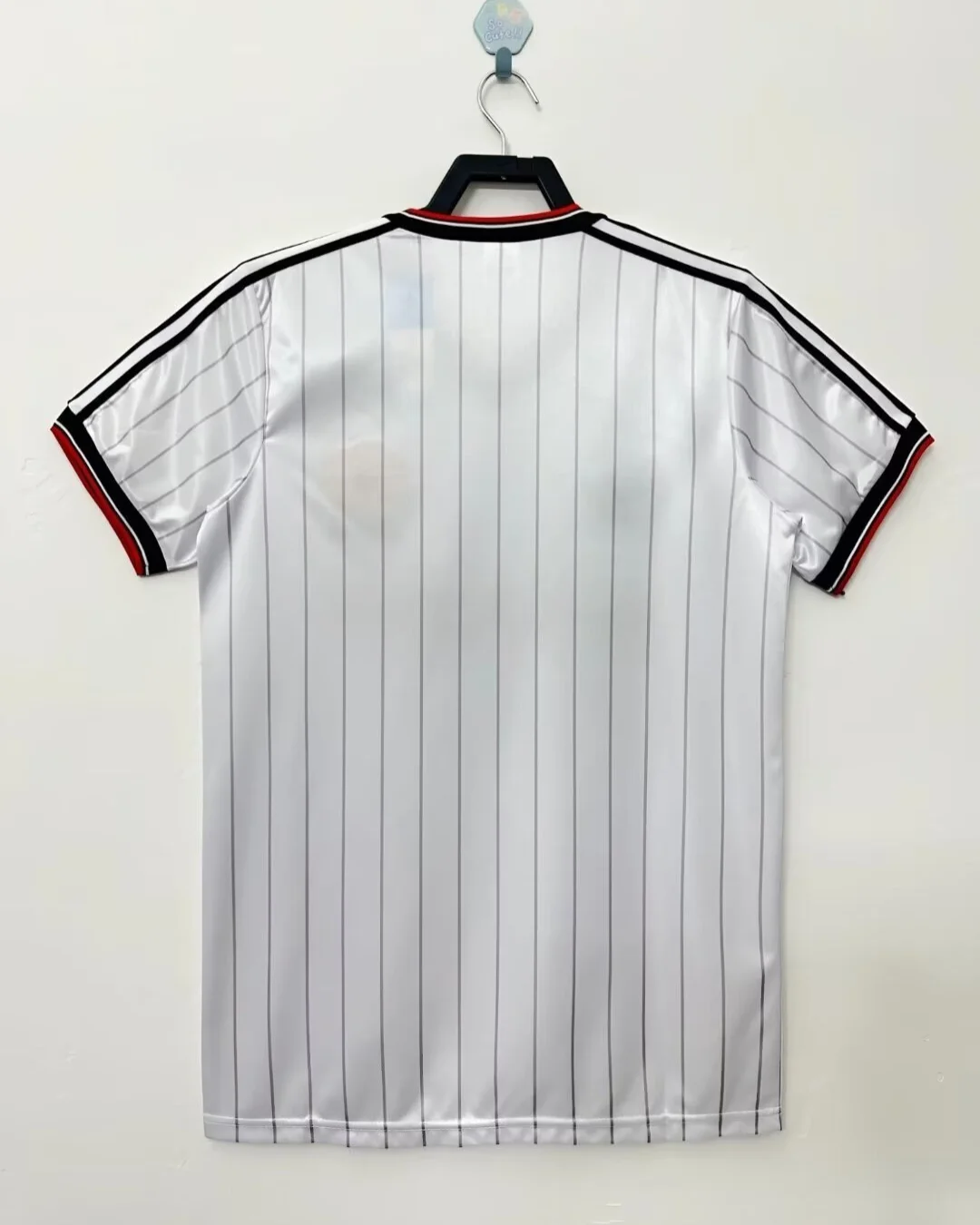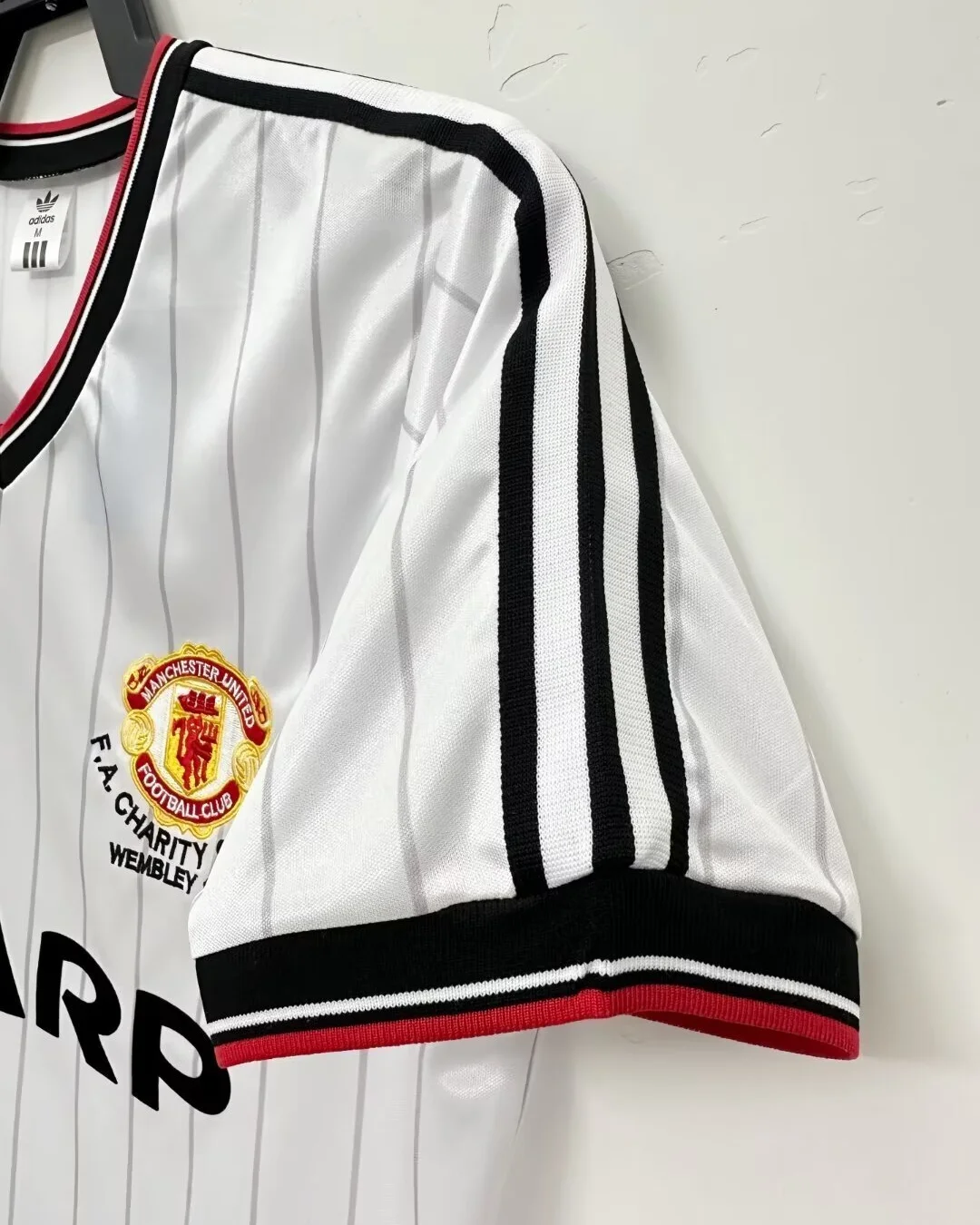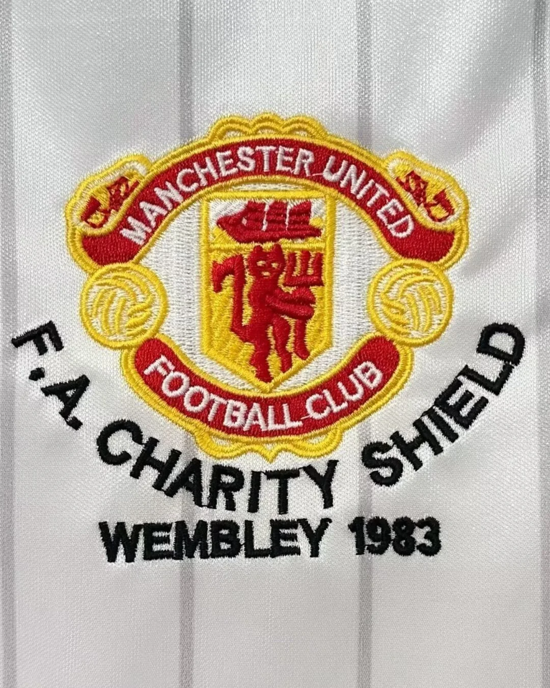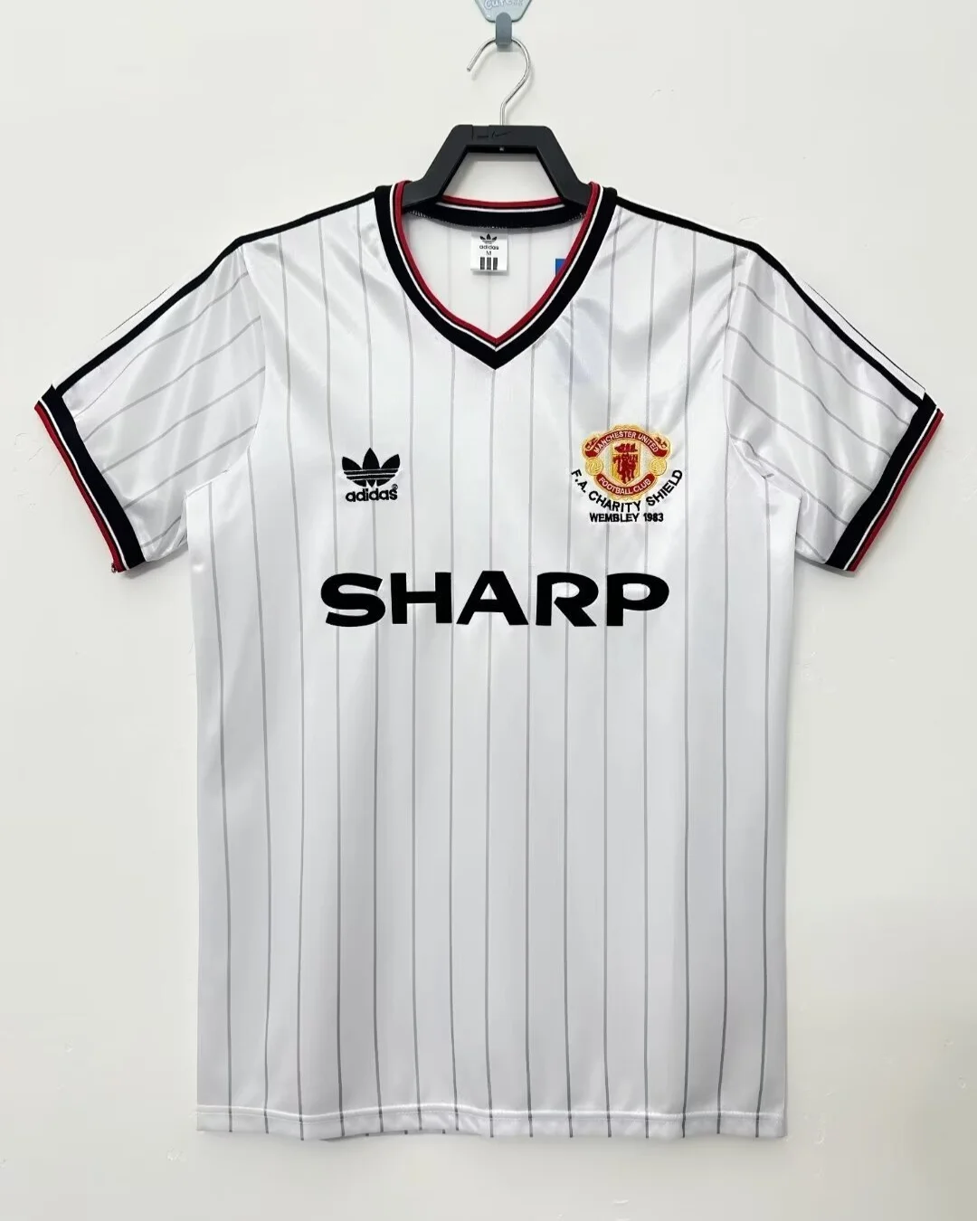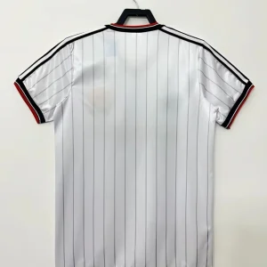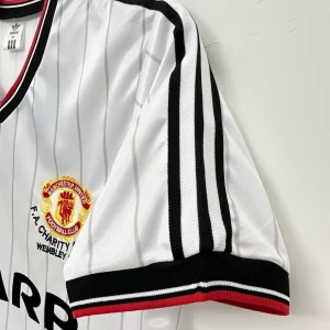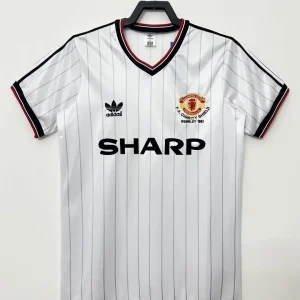 Relive a classic Old Trafford era with the Manchester United 83/84 Charity Shield Away Jersey, a retro shirt inspired by the side that lifted the 1983 FA Charity Shield after defeating Liverpool 2-0 at Wembley. This design captures the look of that early-80s United team, with the traditional white base, sharp black and red trim, and the iconic Sharp sponsor styling that defined the club’s vintage away look. The shirt is closely associated with Bryan Robson and United’s cup-winning squad from the 1983/84 campaign, making it a standout choice for collectors and fans of classic Manchester United history.