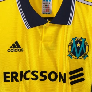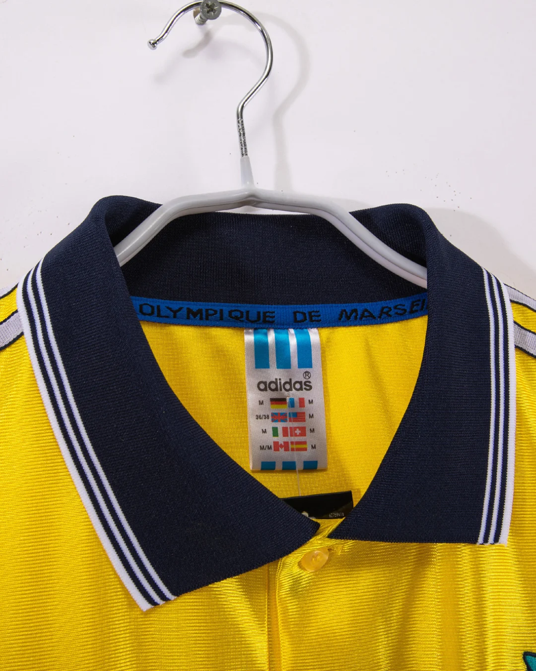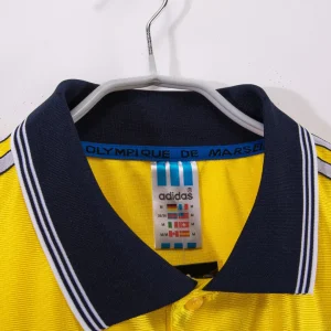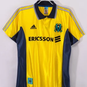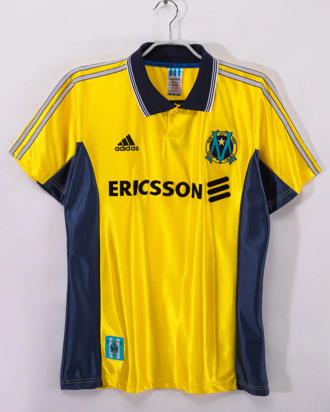 Celebrate the bold style and rich football heritage of Olympique de Marseille with the 1998/99 Third Jersey, a striking Adidas classic that stands out for its dynamic design and historical significance. This jersey features a vibrant yellow base color contrasted with navy blue details on the sides and sleeves, creating a visually striking and energetic look that captures the club’s resilient spirit.